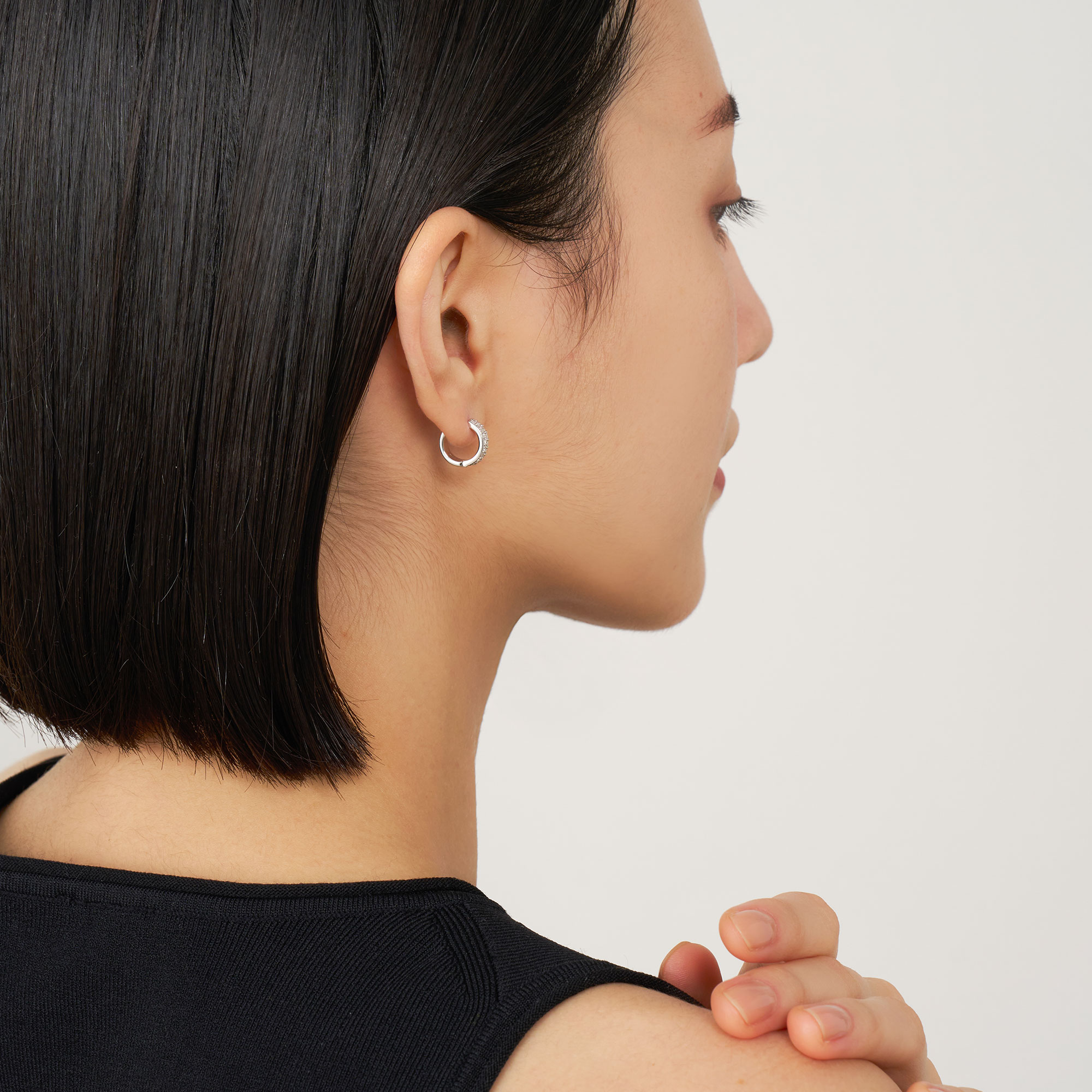 耳たぶに沿うサイズ感で、カジュアルからドレスアップまで様々なスタイリングに合わせやすいところも魅力的。キャッチが一体化されたデザインはすっきりと洗練された印象で、正面だけでなく横顔も美しく見せてくれます。