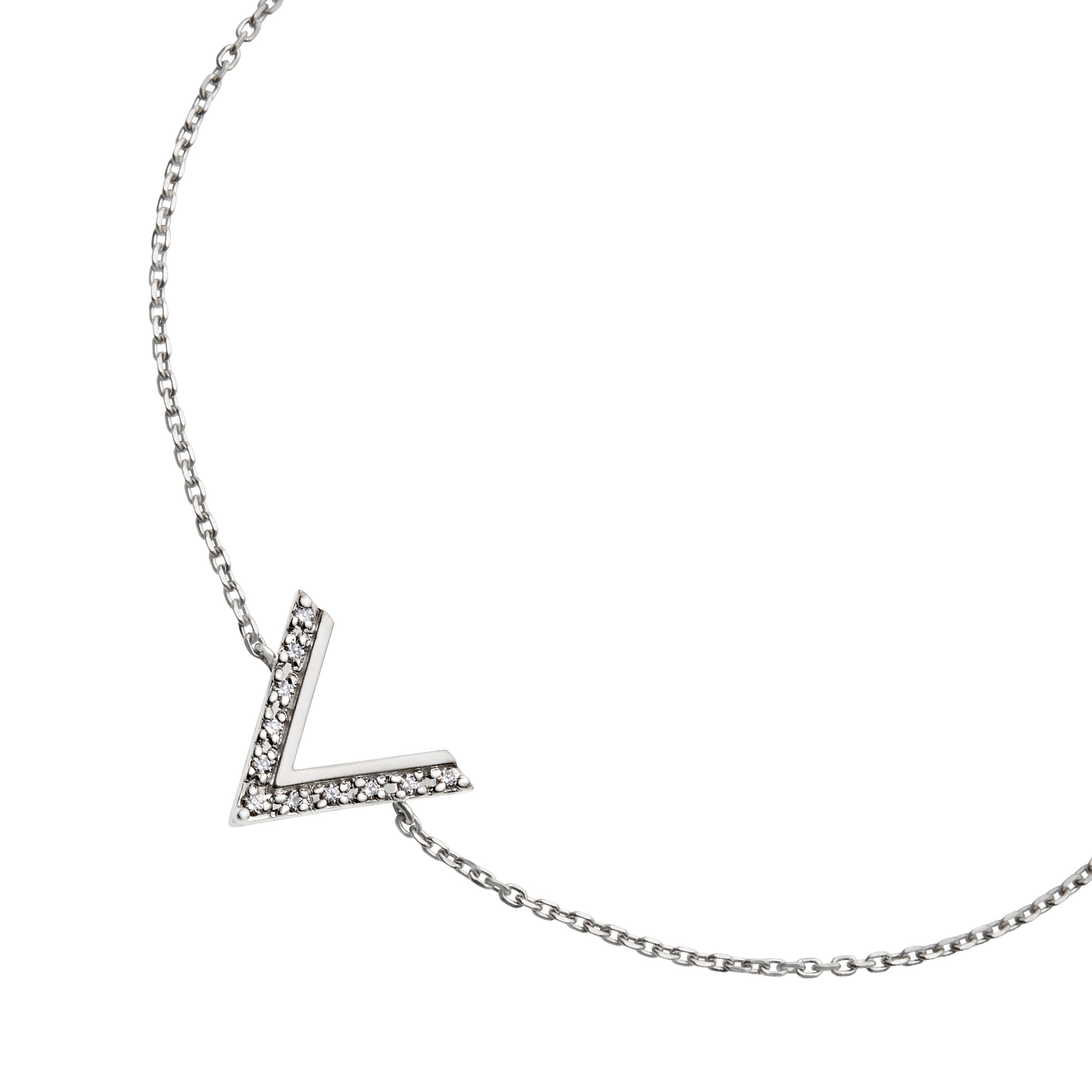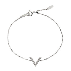 整然と並んだダイヤモンドの煌めきを引き立てるように、艶やかなプラチナの光沢がVのラインを描く、エッジの効いたデザインです。