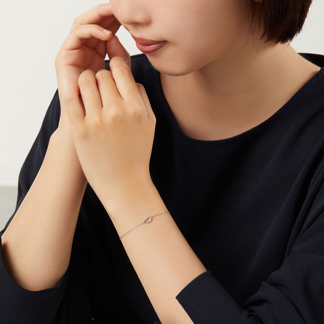 プラチナの白くピュアな輝きが肌に透明感を与え、きらめく7石のダイヤモンドが美しい手元を演出します。