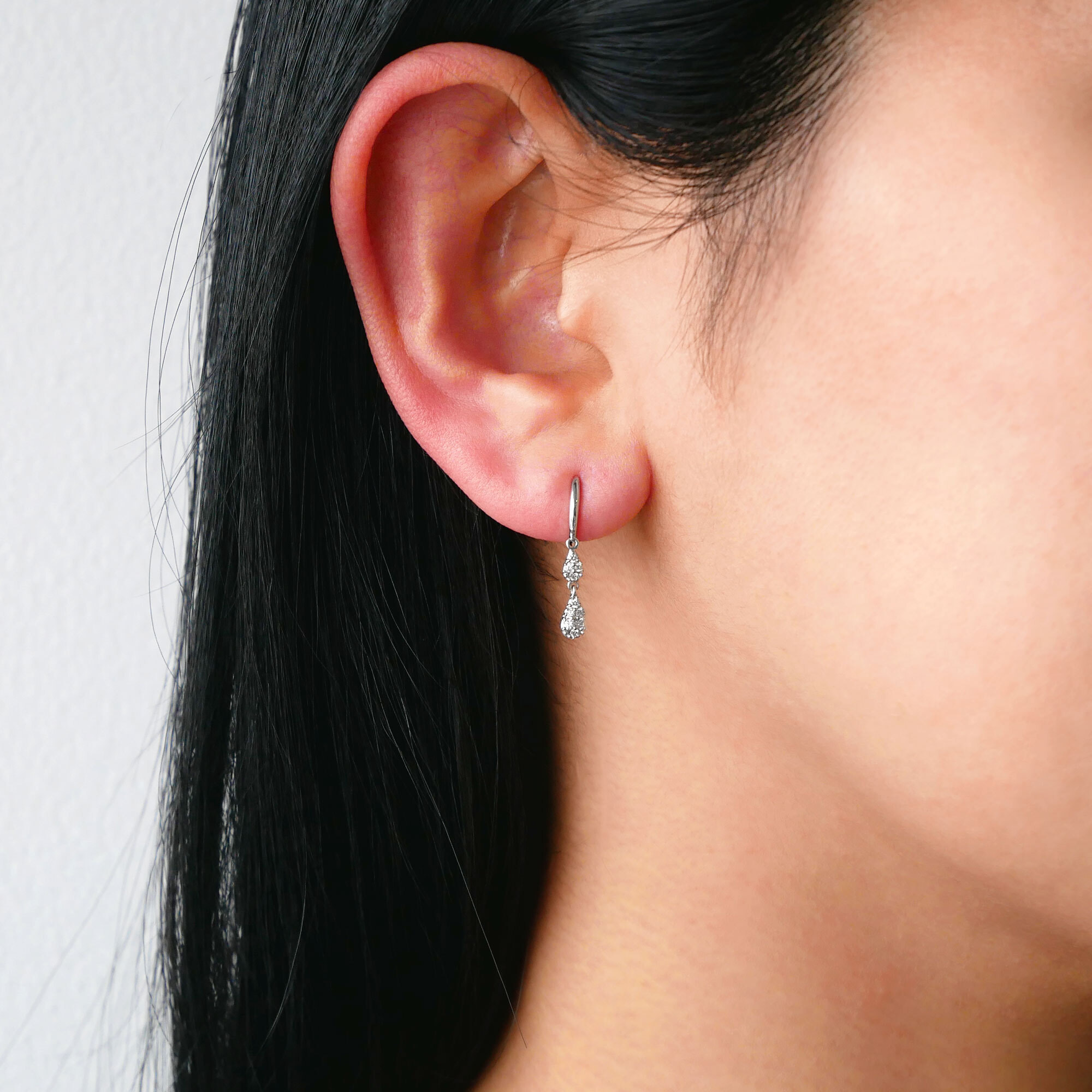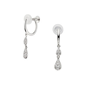 流れるようなプラチナのバーから大小2つのしずくが下がるデザインで、ふっくらとしたしずくの表面にあしらったダイヤモンドが揺らめくたびにきらめきを放ち、横顔にみずみずしい輝きを纏わせます。