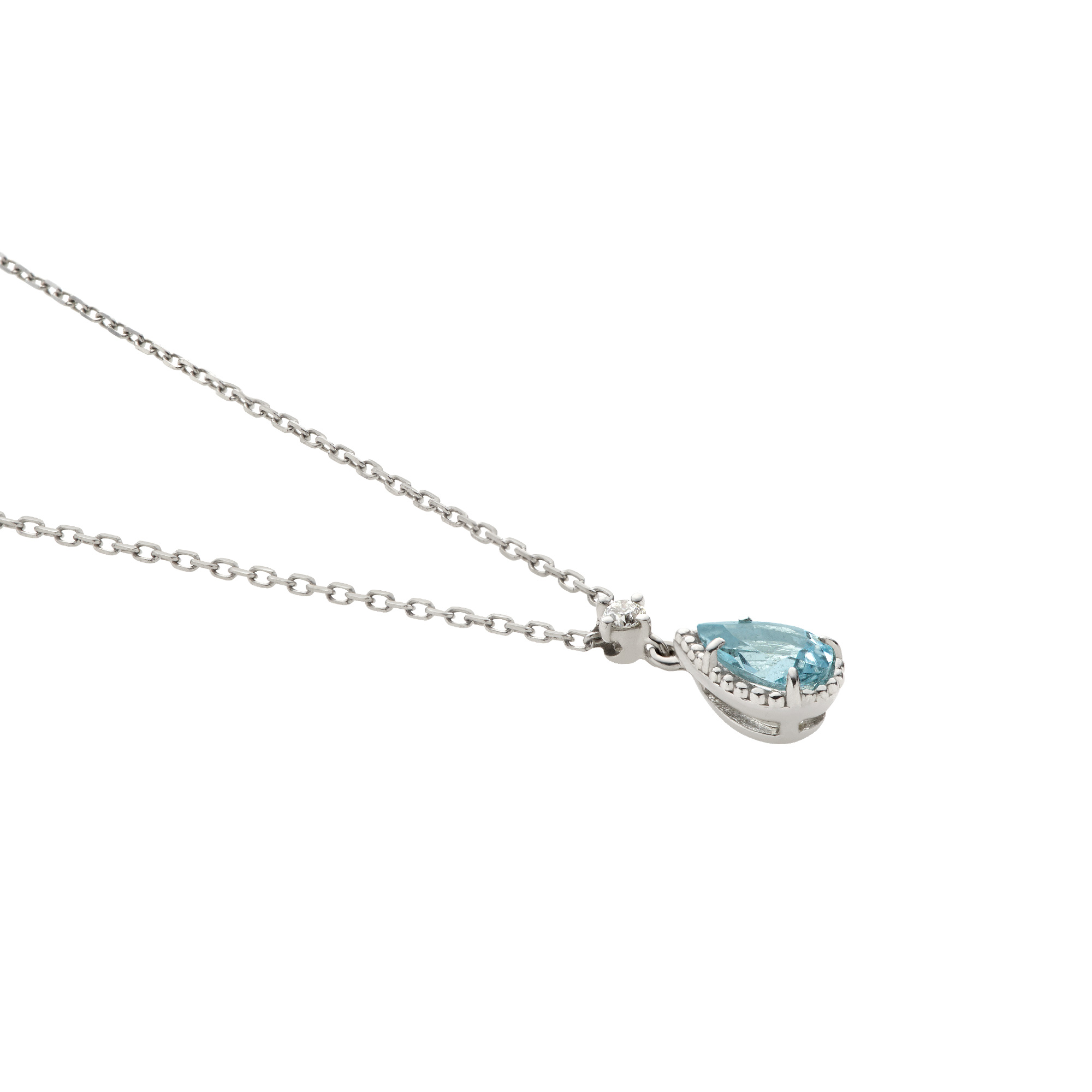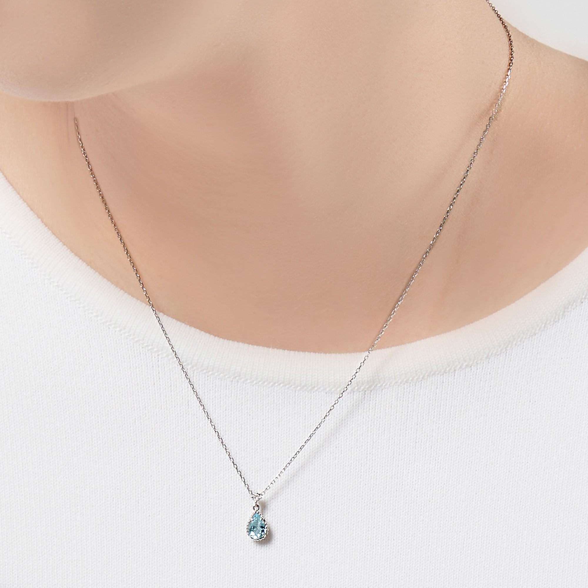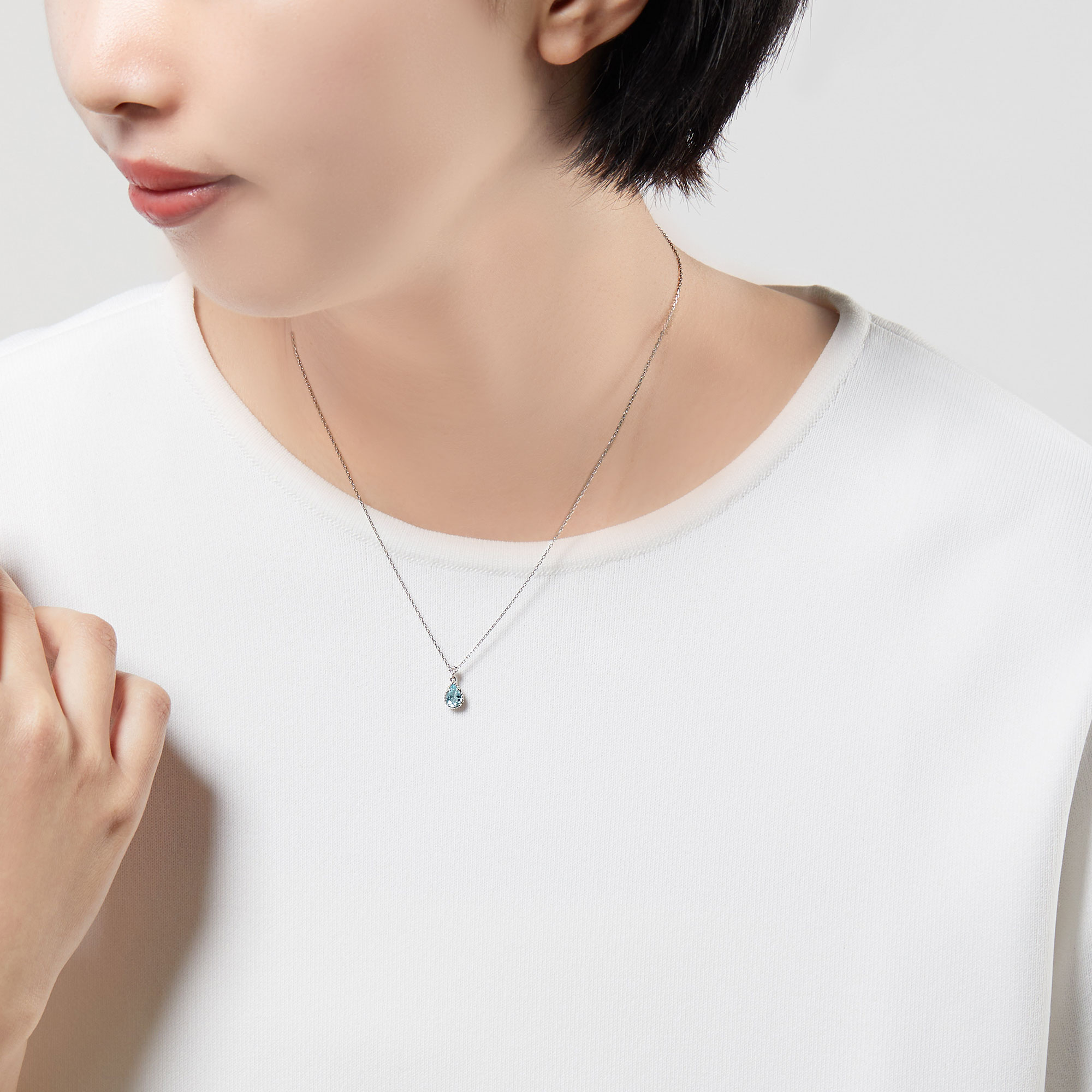 ペアシェイプのアクアマリンが、胸元をすっきり大人っぽい印象に。