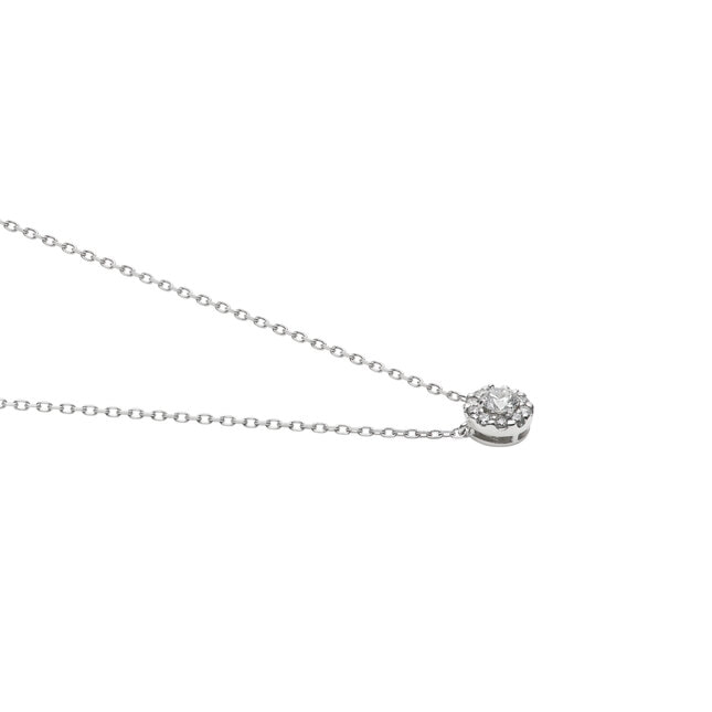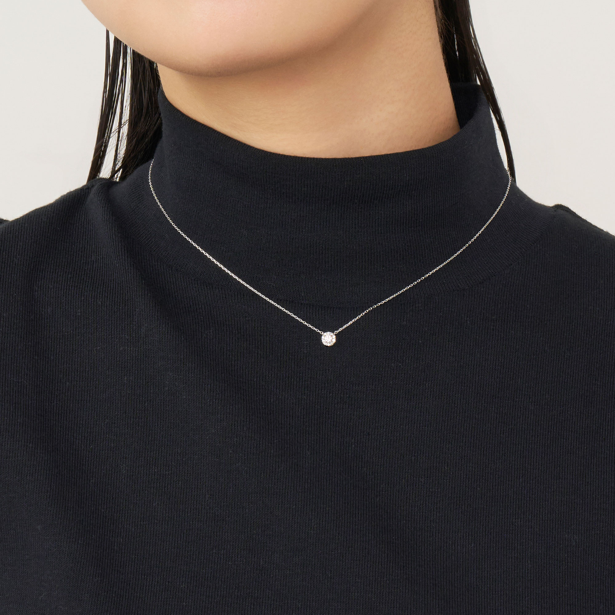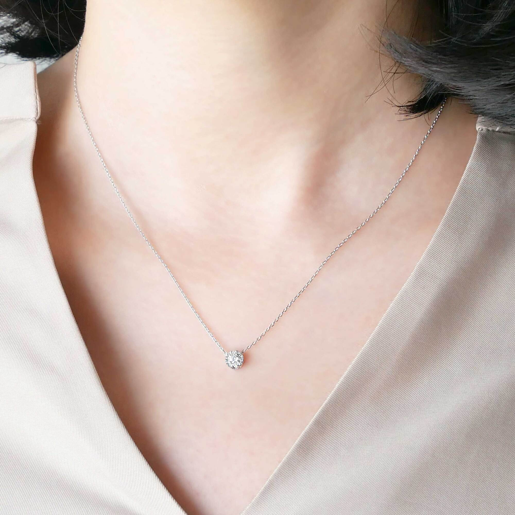 センターダイヤモンドを繊細なメレダイヤモンドがふちどり、華やかな輝きが胸元に広がります。