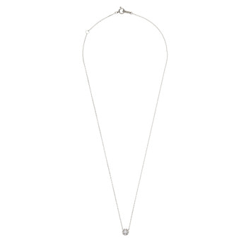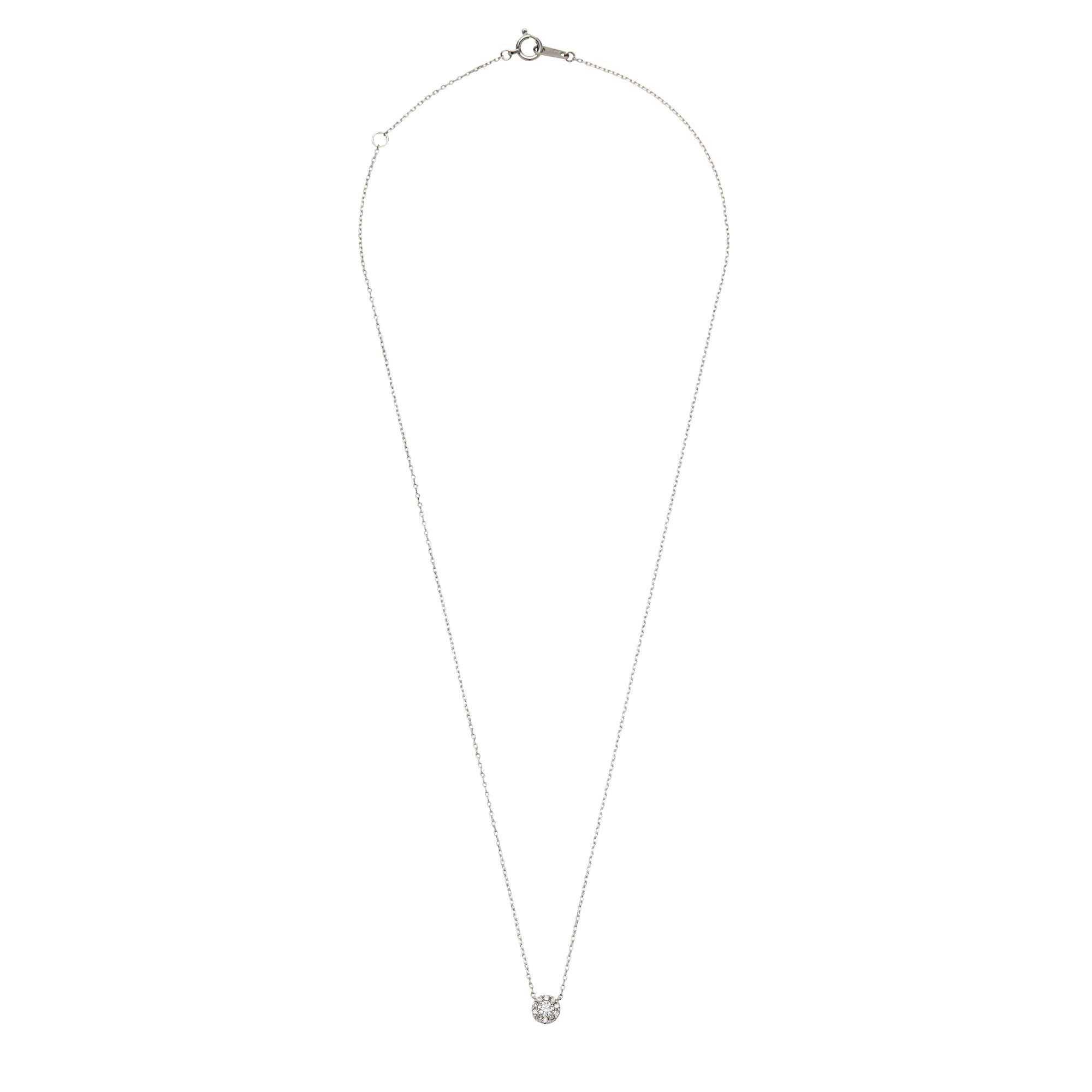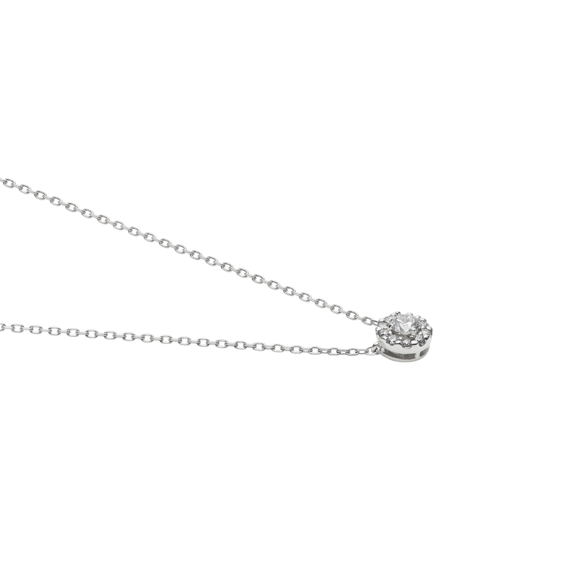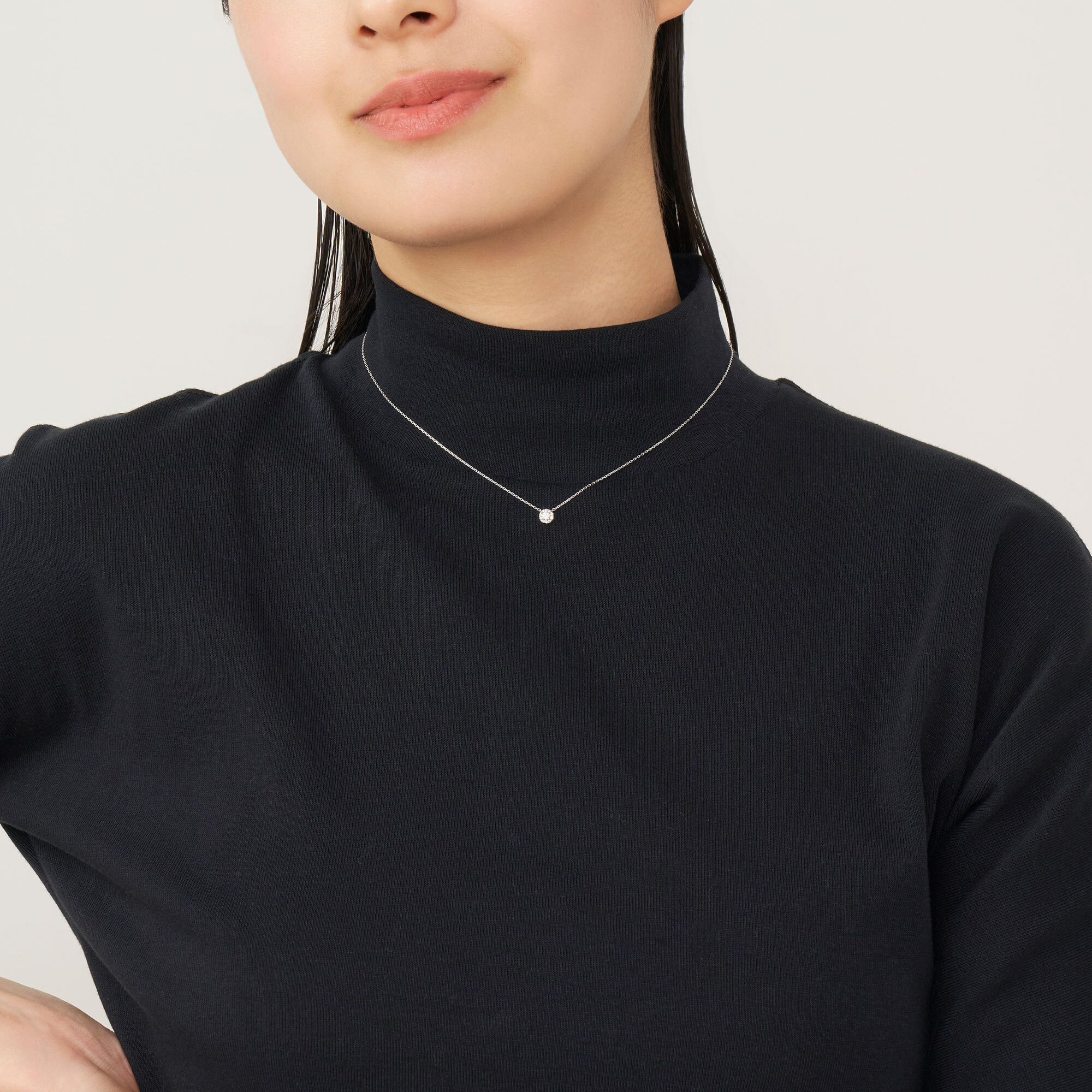 センターダイヤモンドを繊細なメレダイヤモンドがふちどり、華やかな輝きが胸元に広がります。