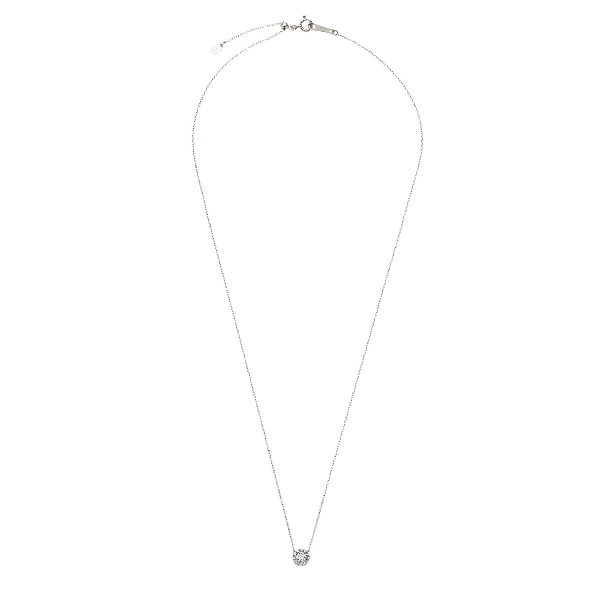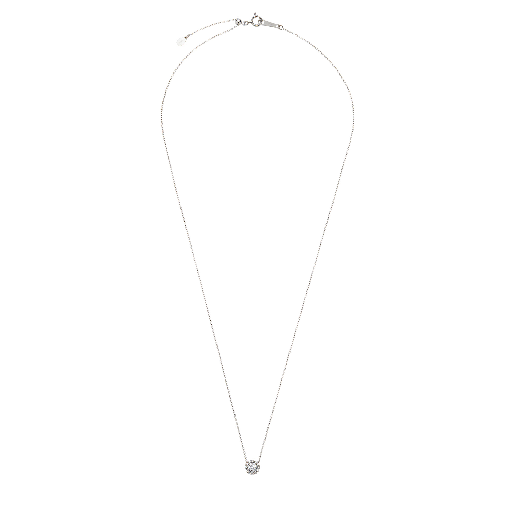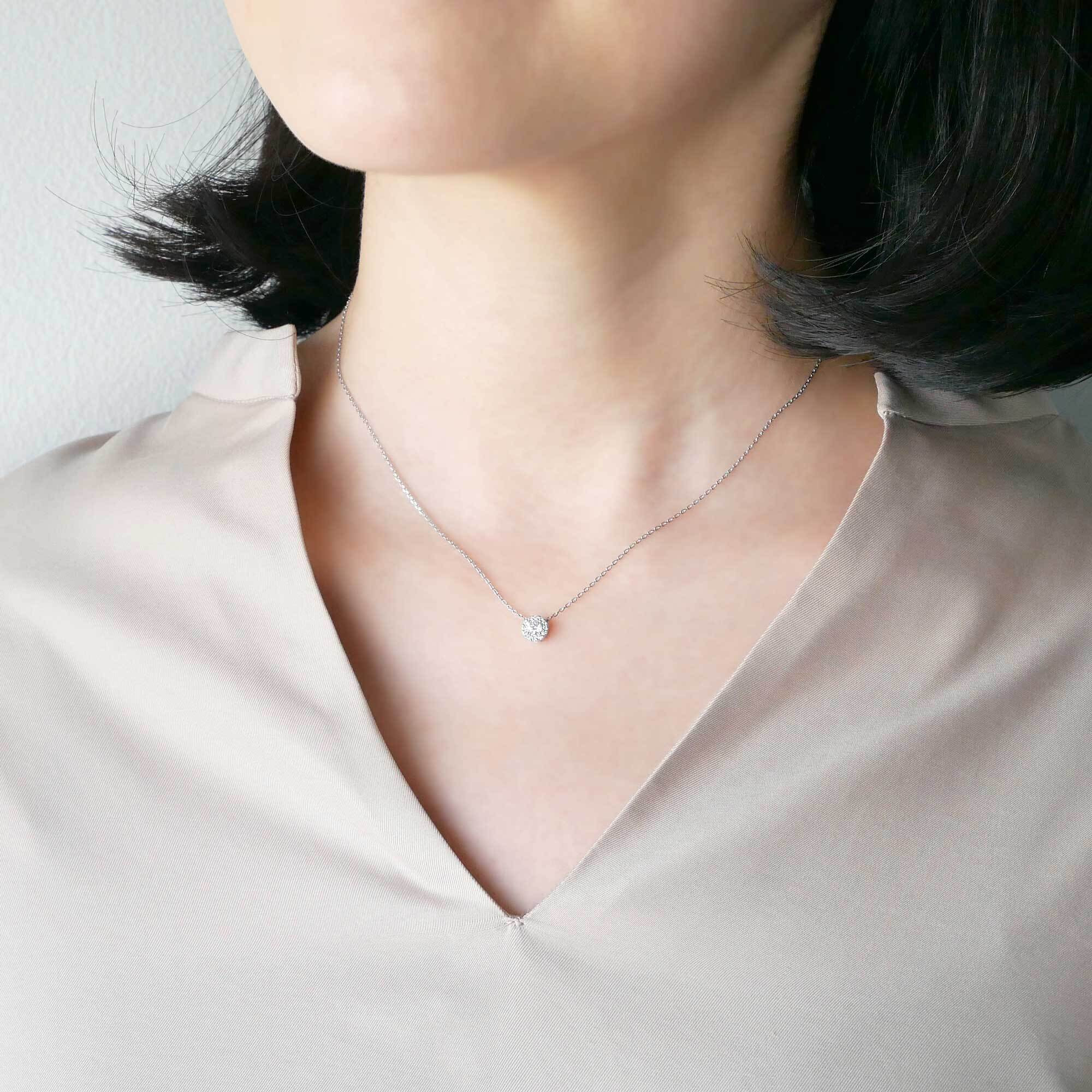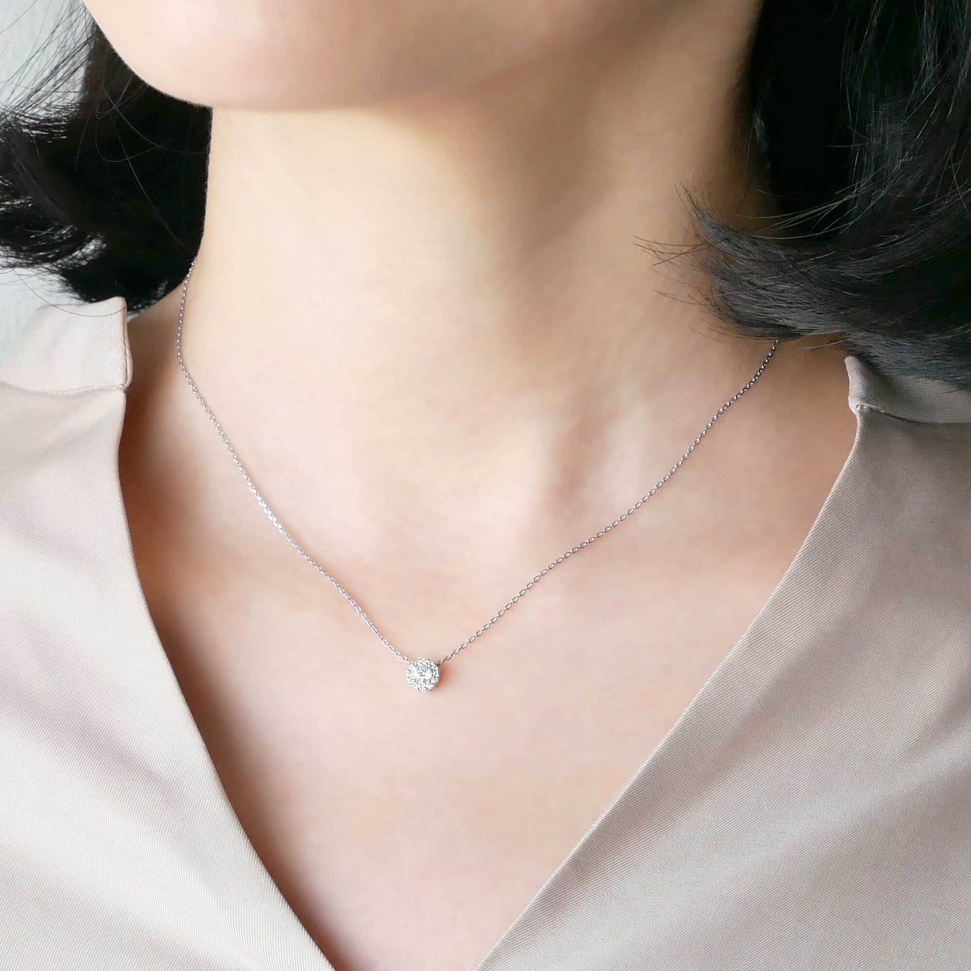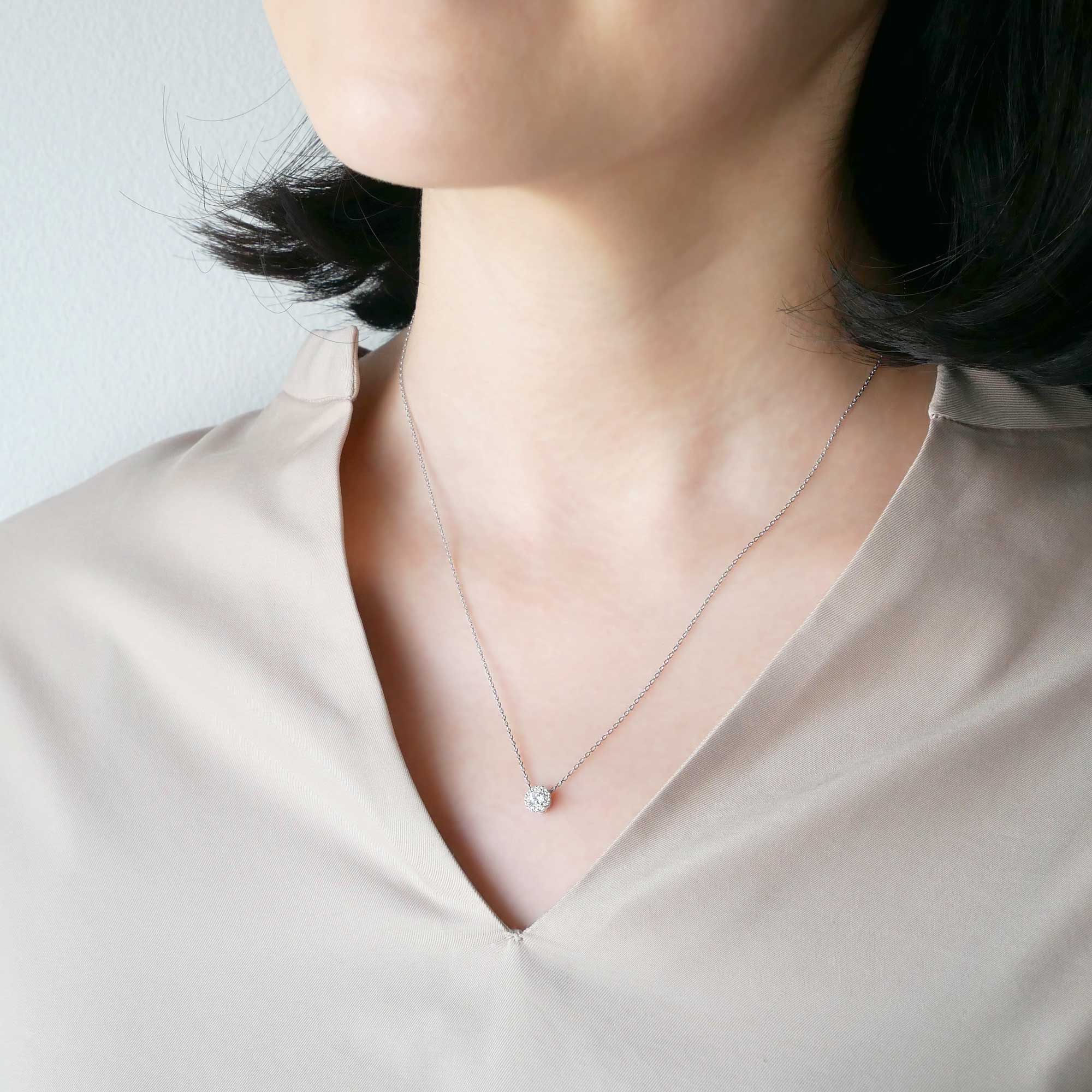 粒選りの「最高級 Dカラー・エクセレントカット」ダイヤモンドをメレダイヤモンドで縁取った、エレガントな輝きが魅力のネックレス。