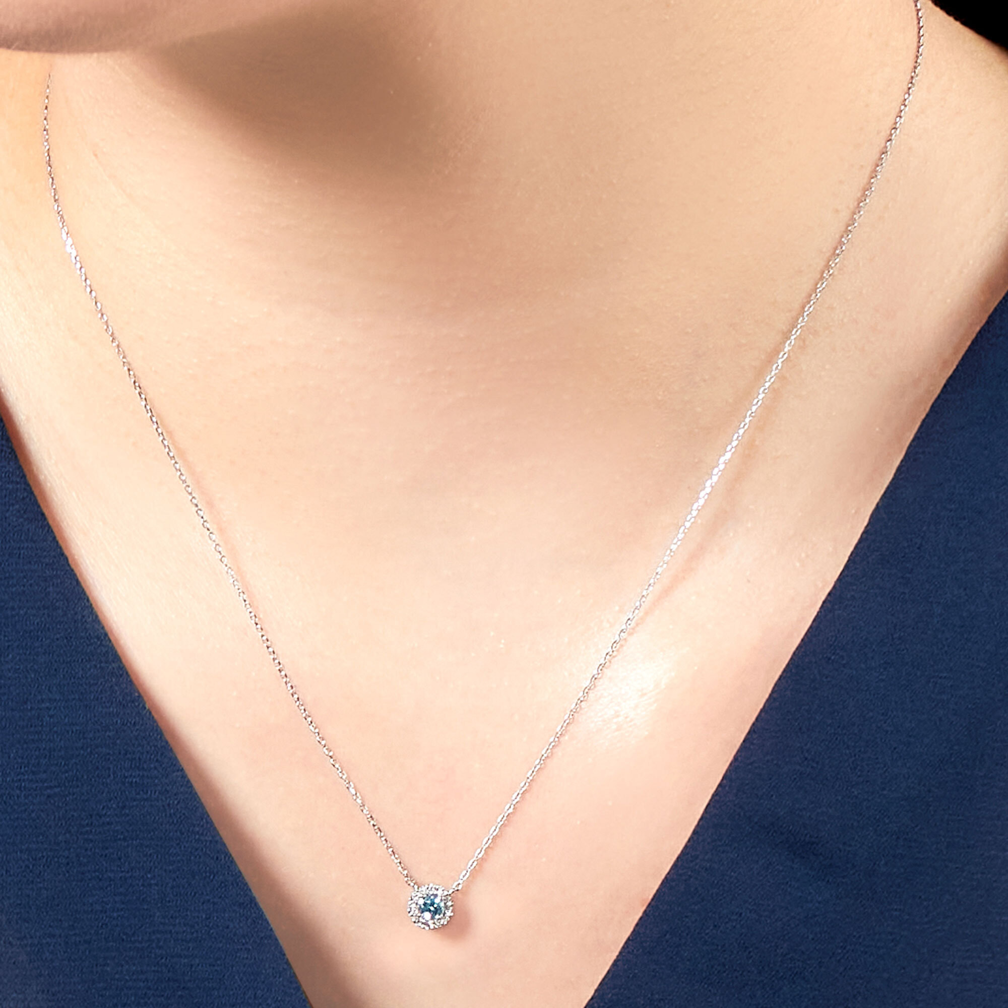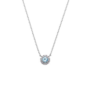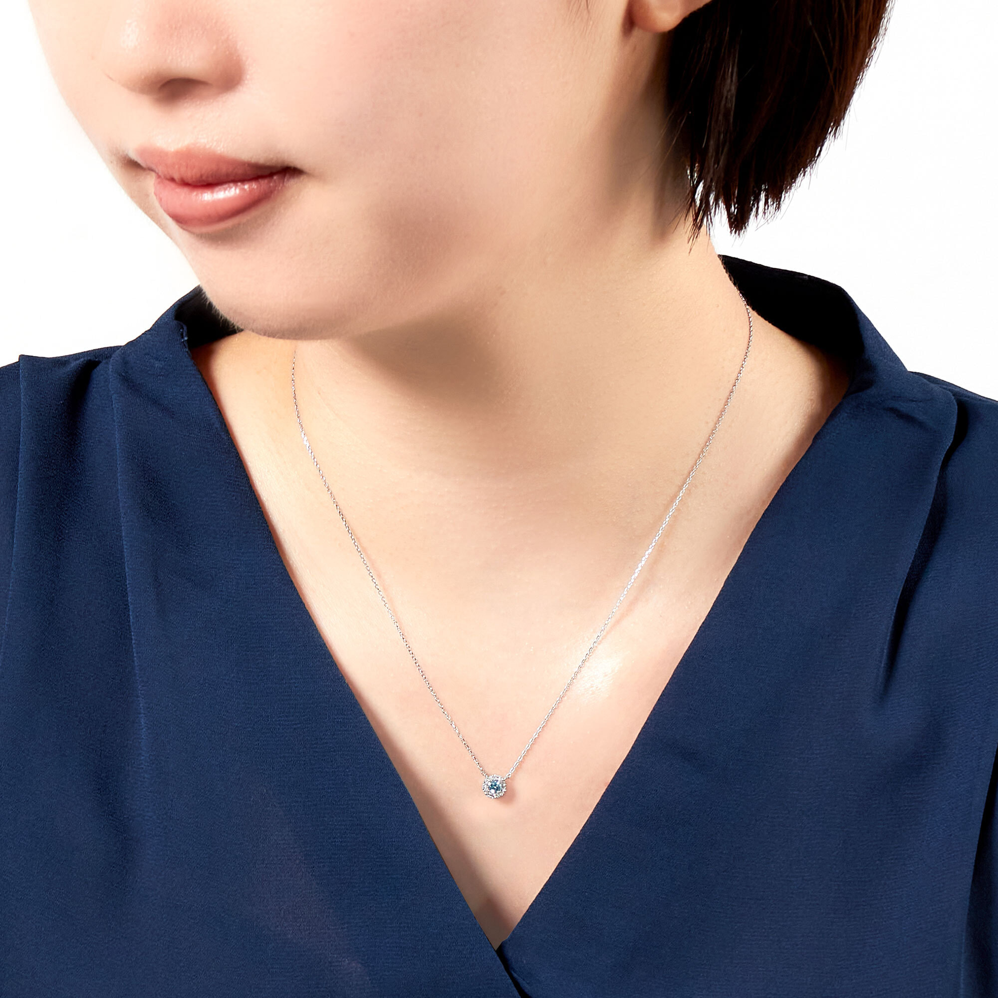 透明感あふれる瑞々しい輝きのアクアマリンを、煌めくメレダイヤモンドで縁取った、爽やかな印象のネックレス。