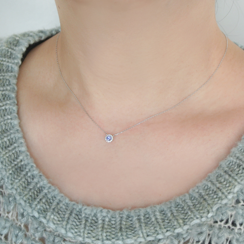 美しく神秘的なパープルブルーのタンザナイトを、煌めくメレダイヤモンドで縁取った上品な印象のネックレス。