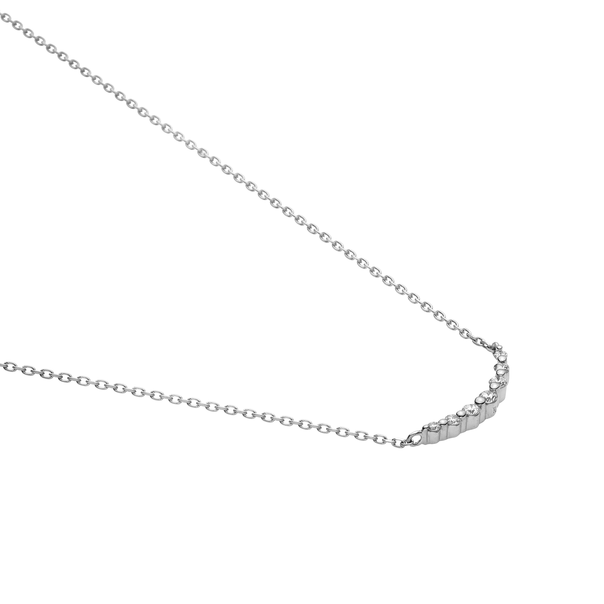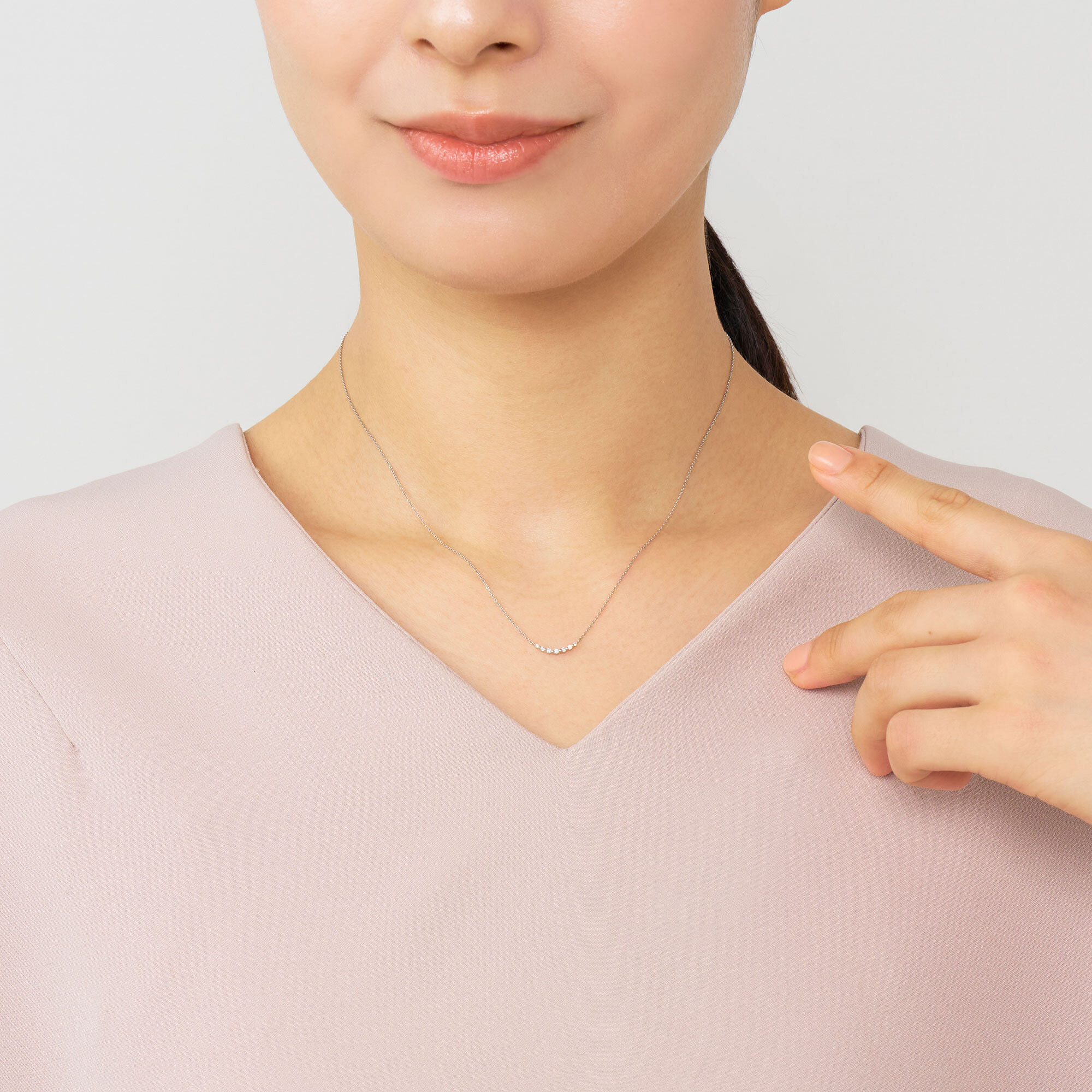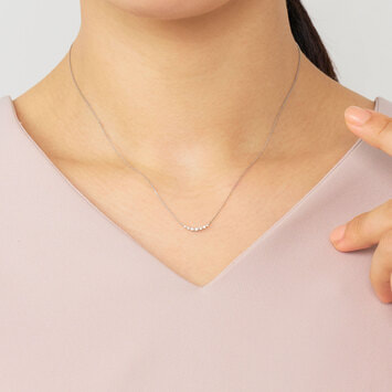 白く輝くプラチナの華奢なチェーンと、グラデーションになったダイヤモンドのラインがデコルテを魅力的に演出します。