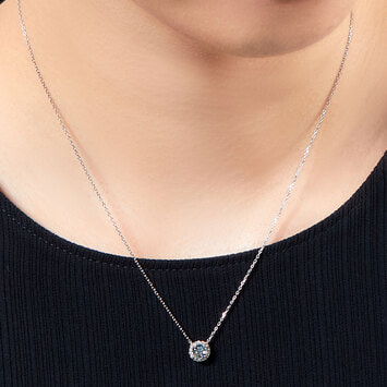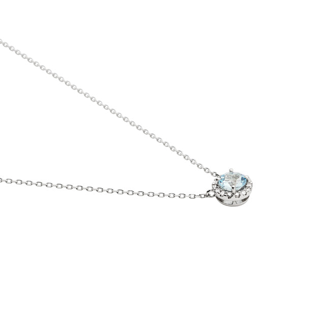 透明感あふれる瑞々しい輝きのアクアマリンを煌めくメレダイヤモンドで縁取った、爽やかな印象のネックレス。