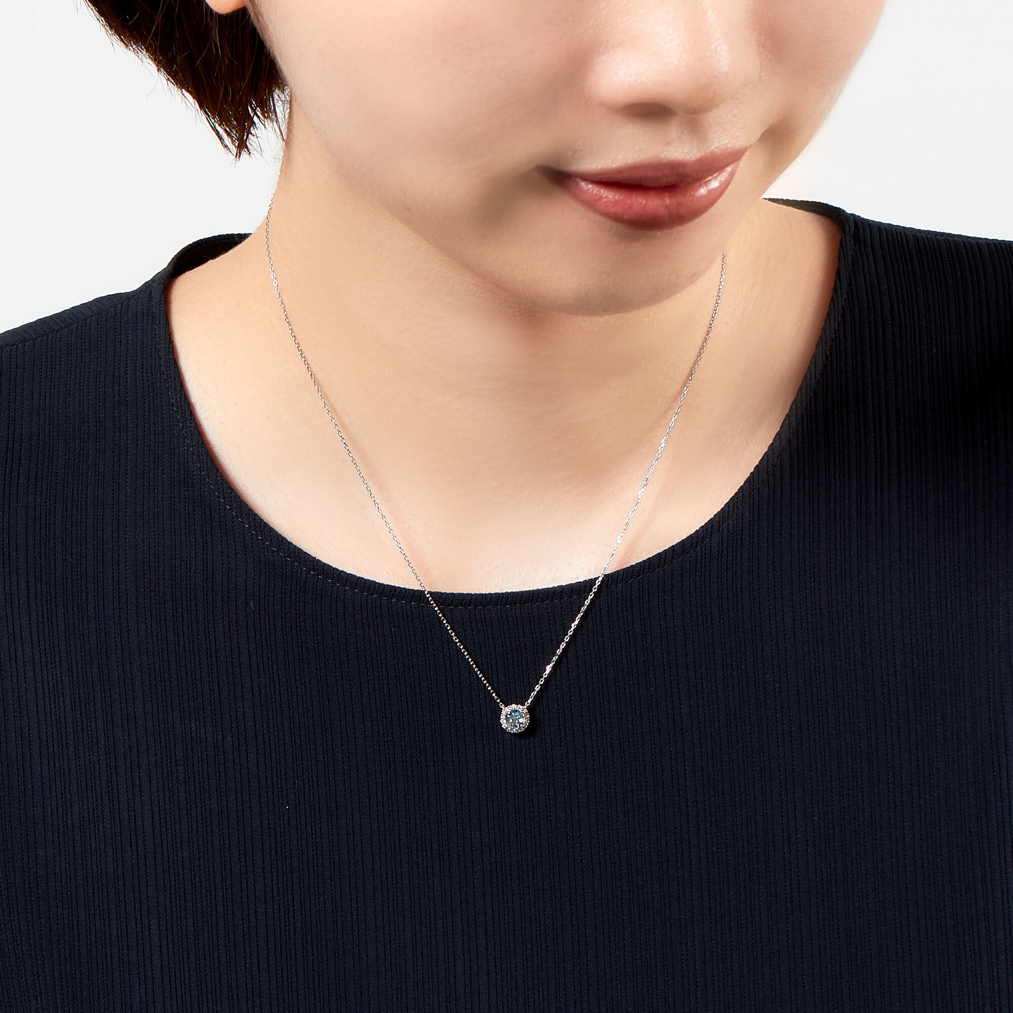 プラチナの白い光沢に添えられた淡いブルーの優しい表情が清々しく、周囲のダイヤモンドの輝きと相まって装いを女性らしく上品に見せます。
