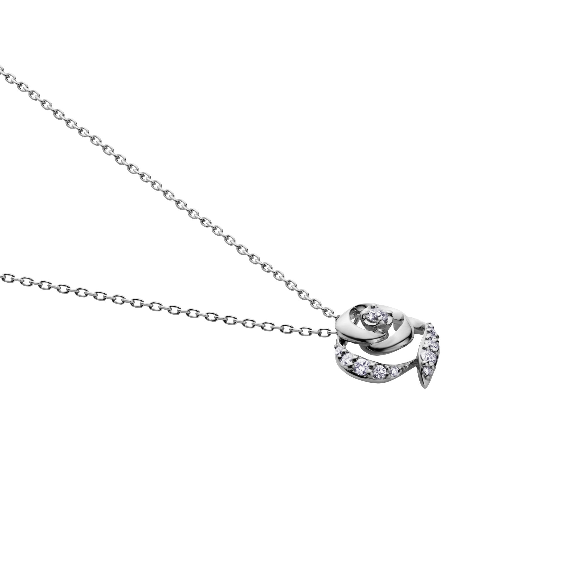 艶やかな光沢と程よくボリュームを持たせたカーヴィなラインに包まれるように、ダイヤモンドの透明感にあふれた繊細なきらめきが胸元に美しい花姿を浮かび上がらせます。