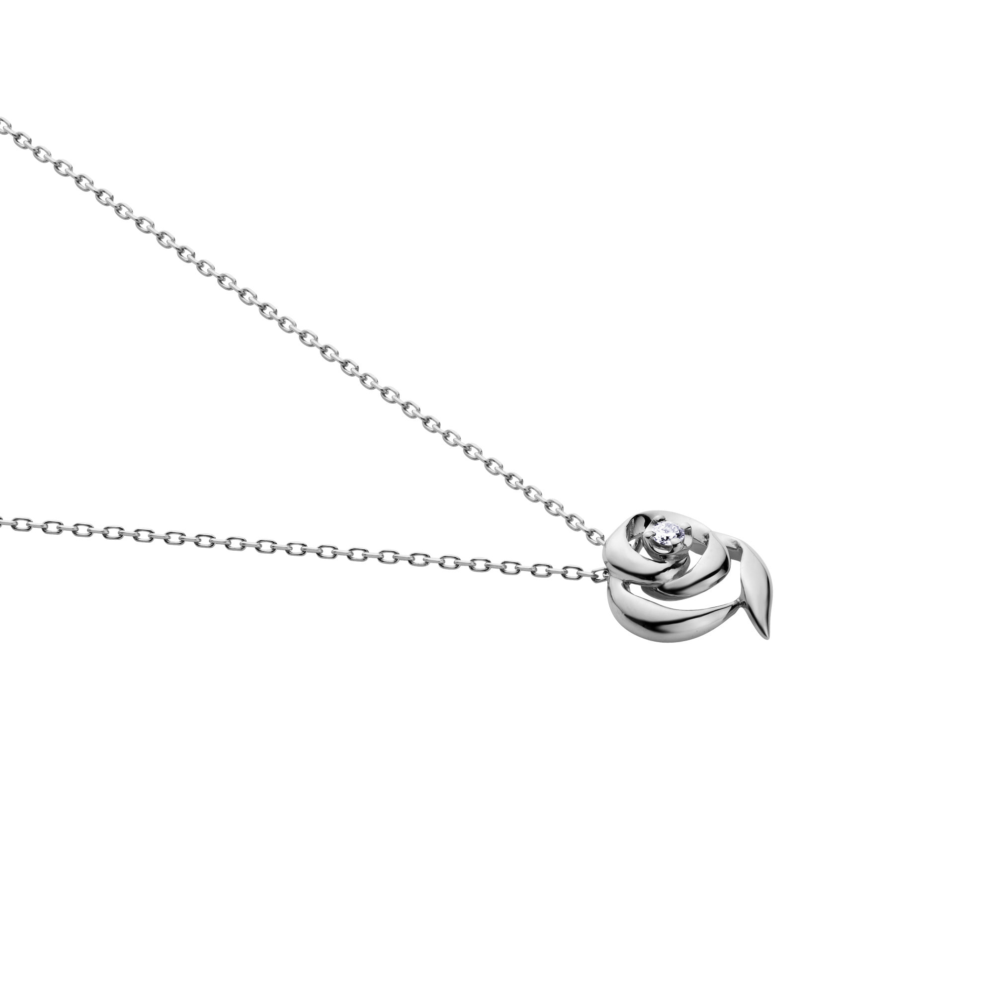 艶やかな光沢と程よくボリュームを持たせたカーヴィなラインに包まれるように、ダイヤモンドの透明感にあふれた繊細なきらめきが胸元に美しい花姿を浮かび上がらせます。
