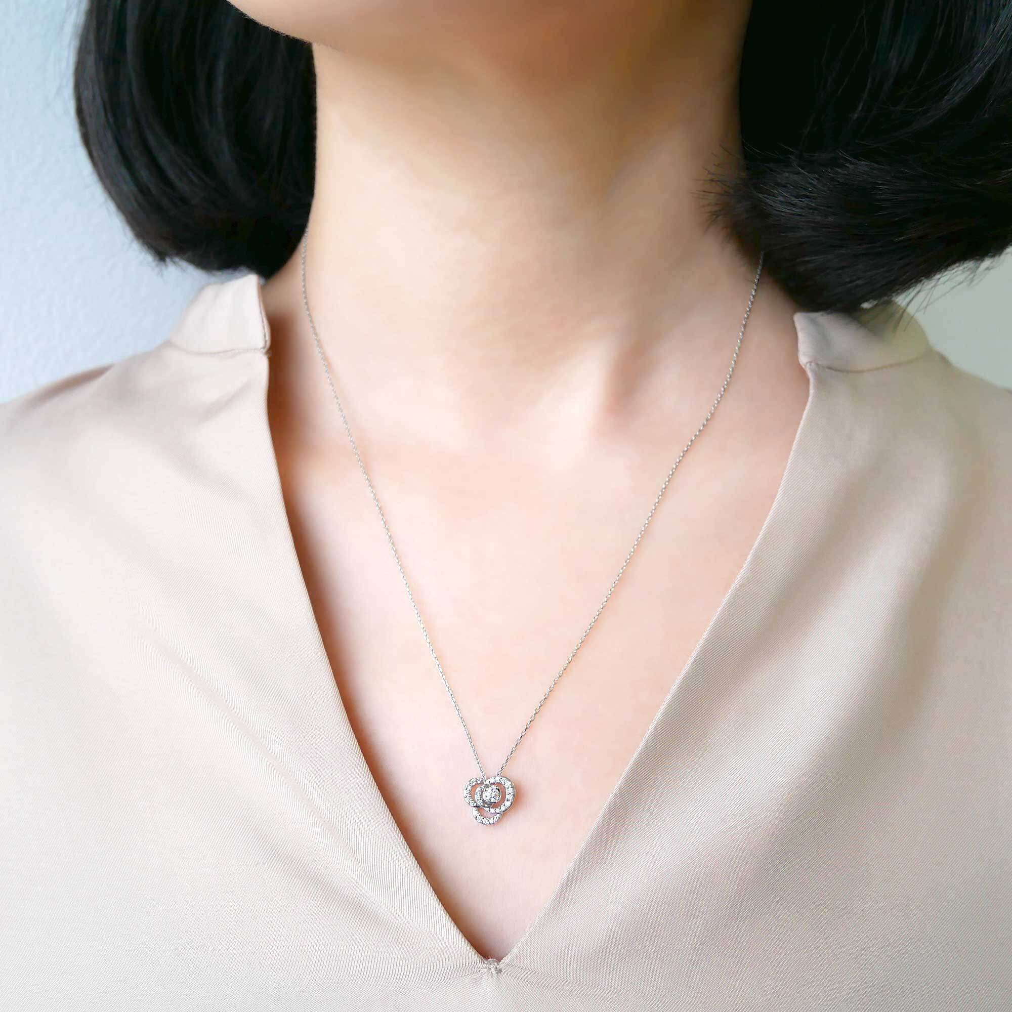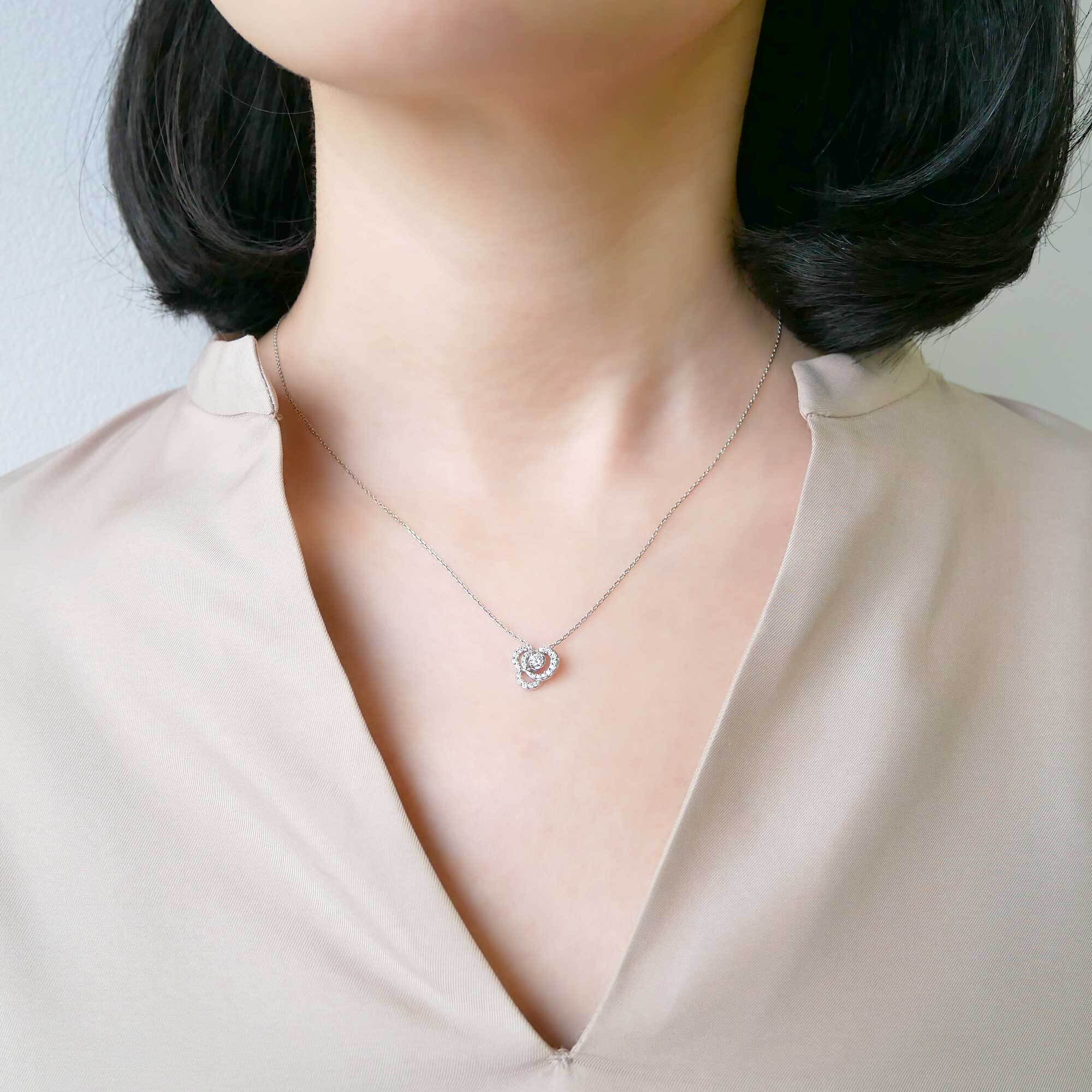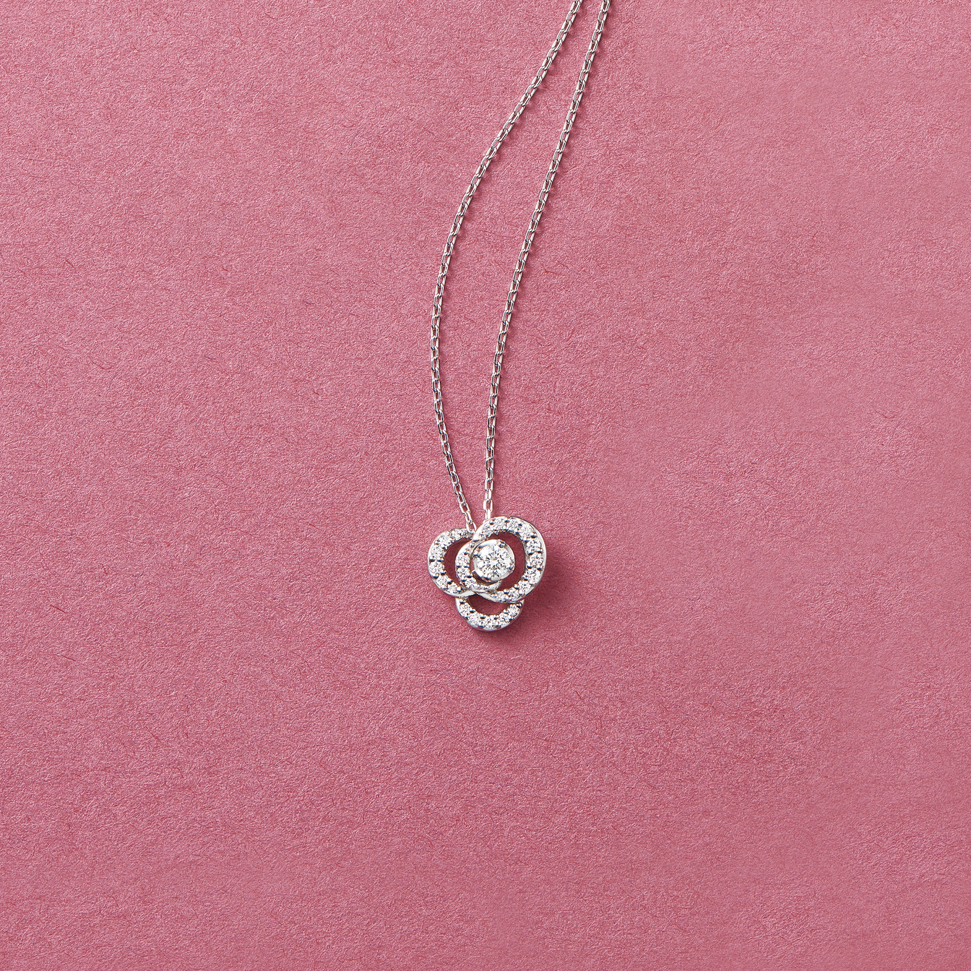 存在感がありながらも軽やかな空間使いのバラのモチーフとダイヤモンドの輝きで、胸元に華やかな彩りを添えてくれます。