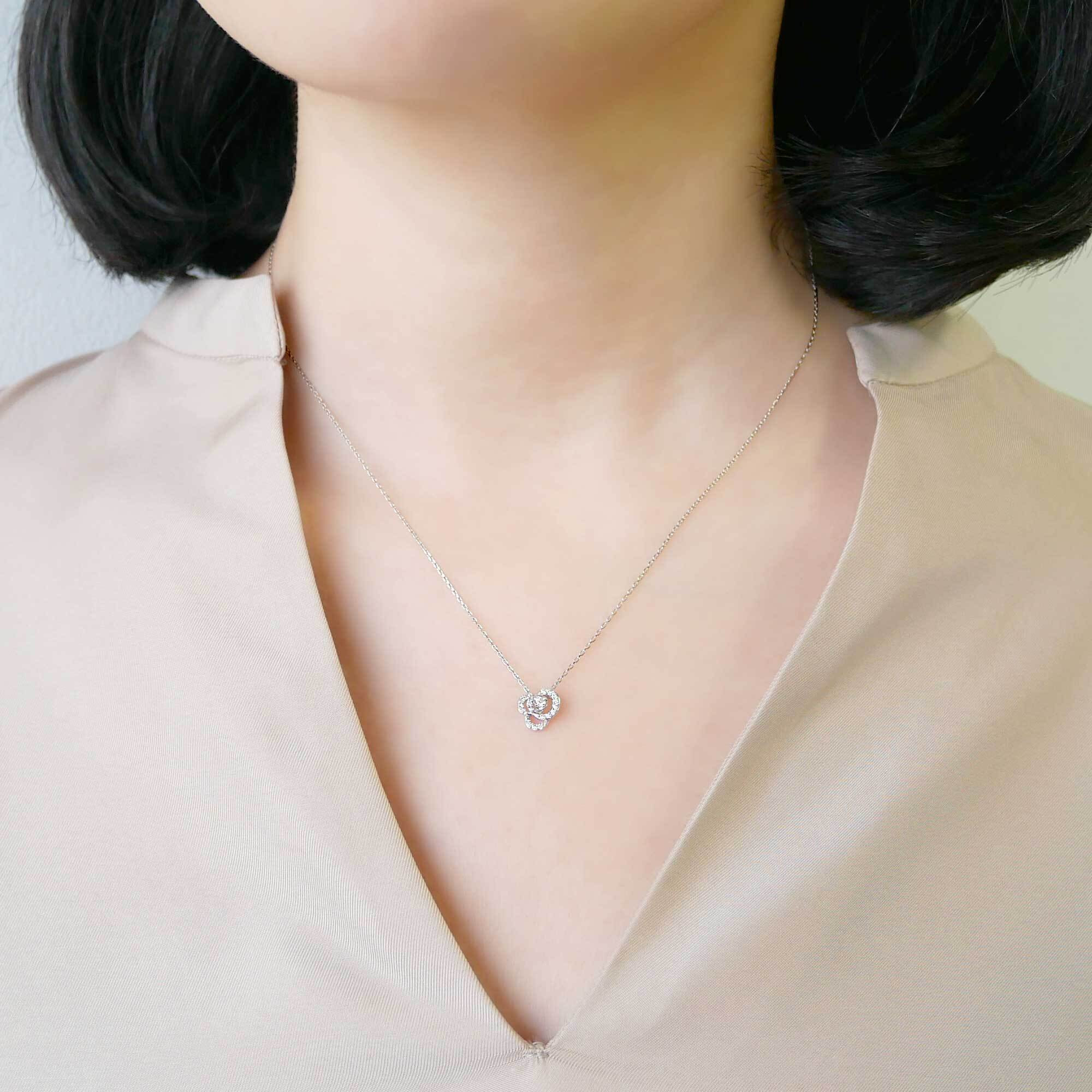 軽やかな空間使いのバラのモチーフとダイヤモンド輝きで、胸元に華やかな彩りを添えてくれます。
