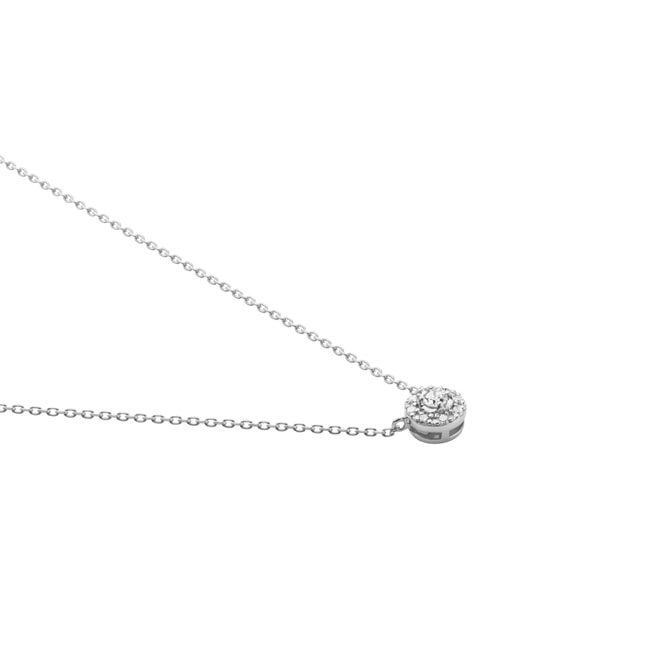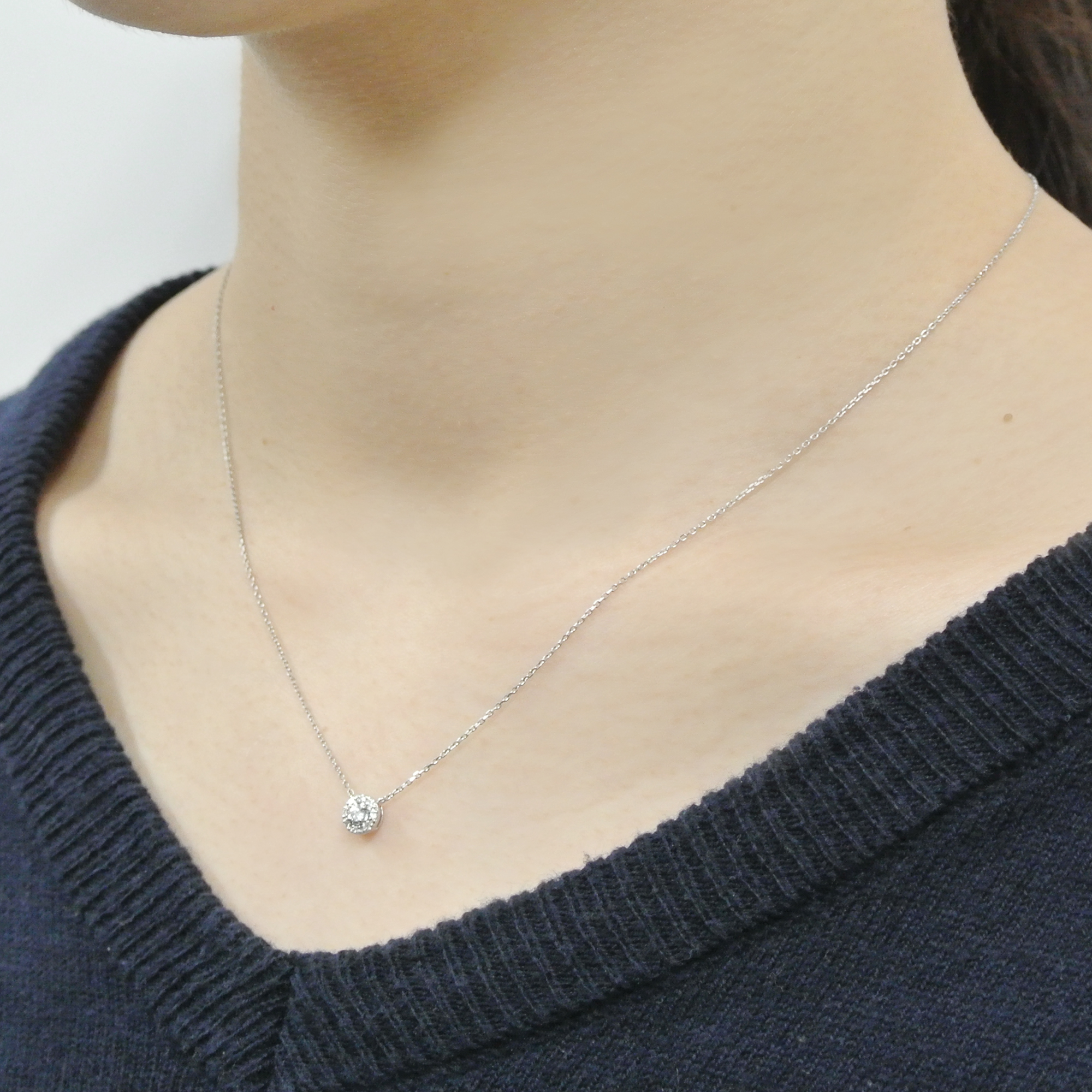 ほどよく粒感のあるダイヤモンドを繊細なメレダイヤで取り巻いた、気品あふれるネックレス。