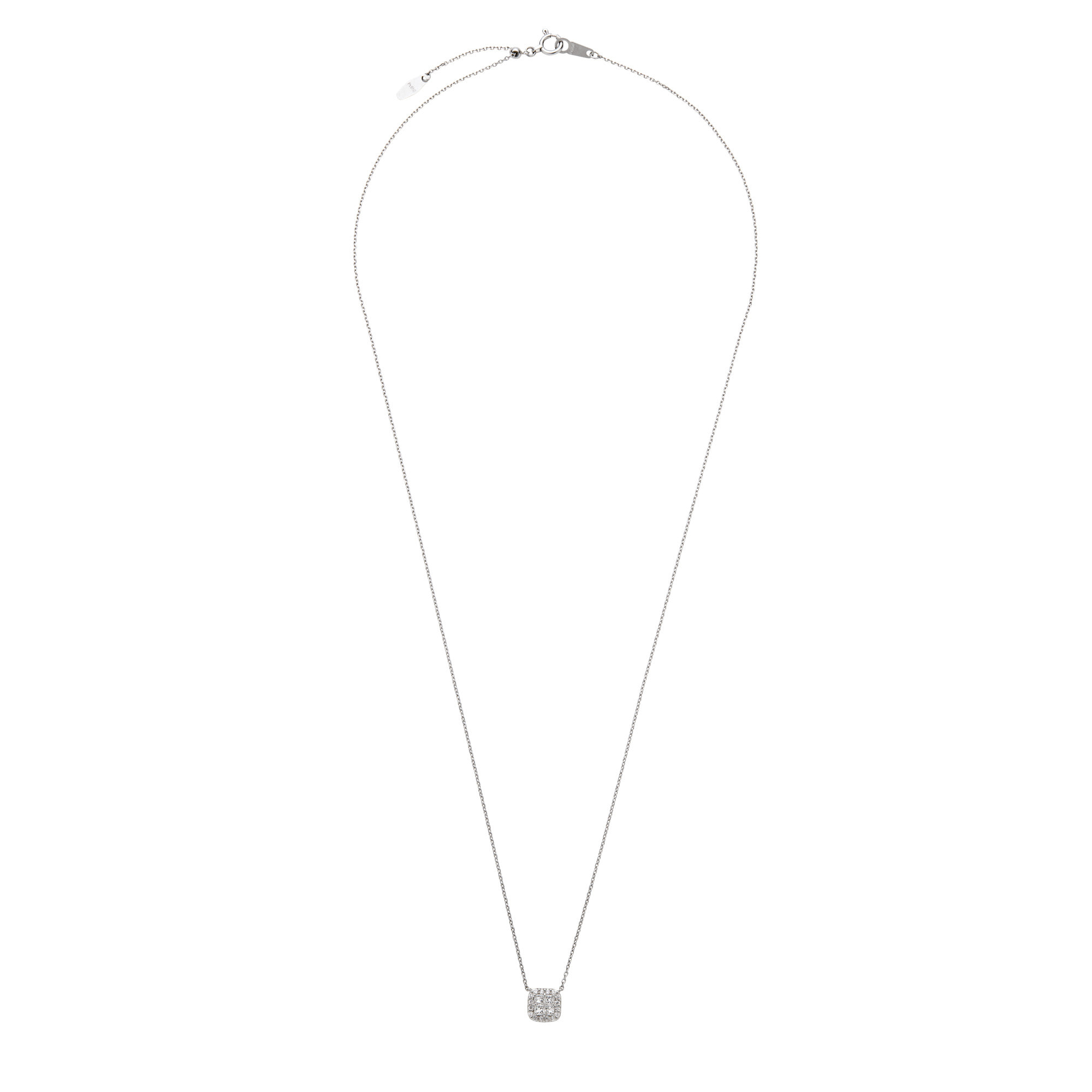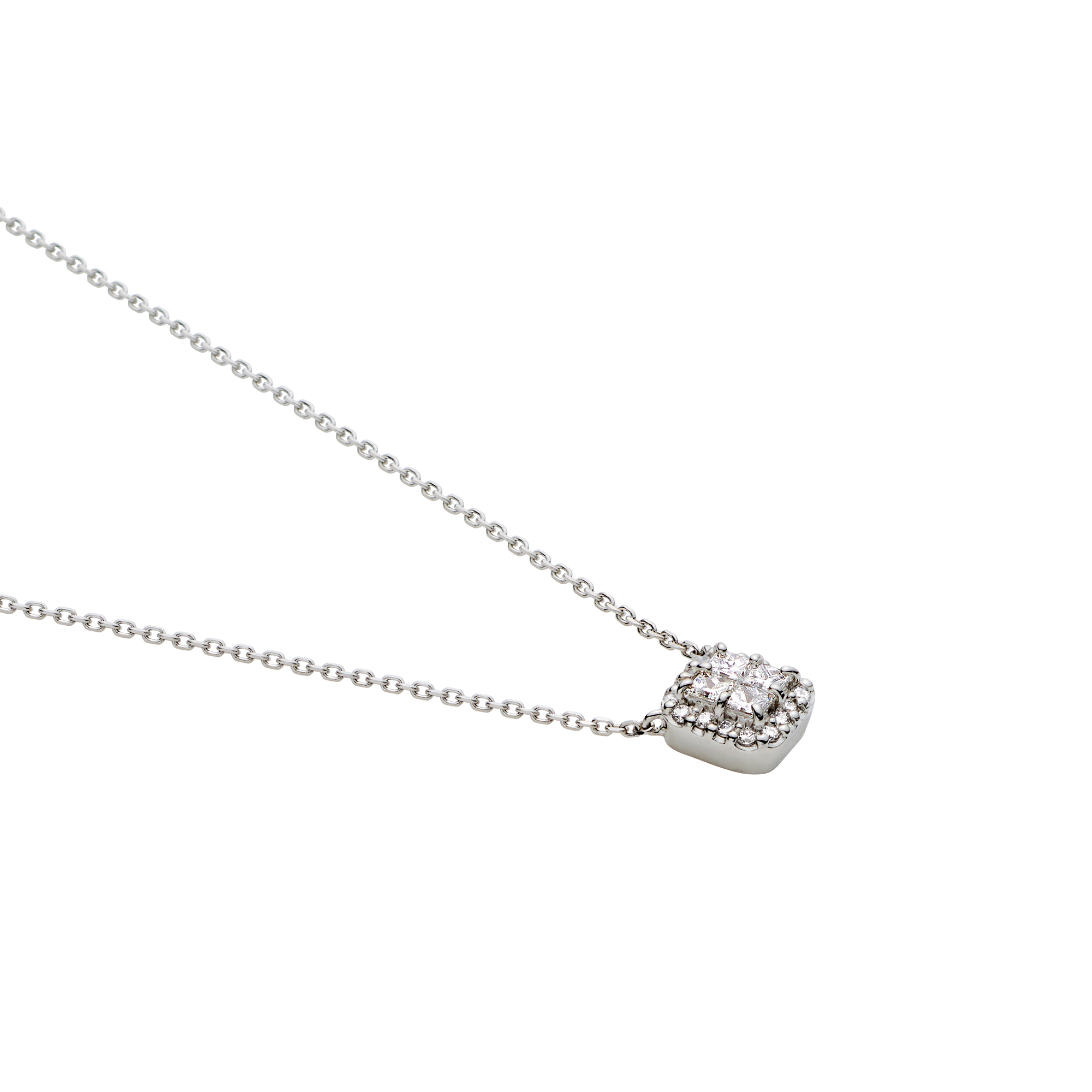 細かなカット面から放たれる輝きが魅力的な4石のプリンセスカットダイヤモンドは、プロポーションの揃ったもの同士を組み合わせ、大粒のセンターストーンと見紛うような一体感。