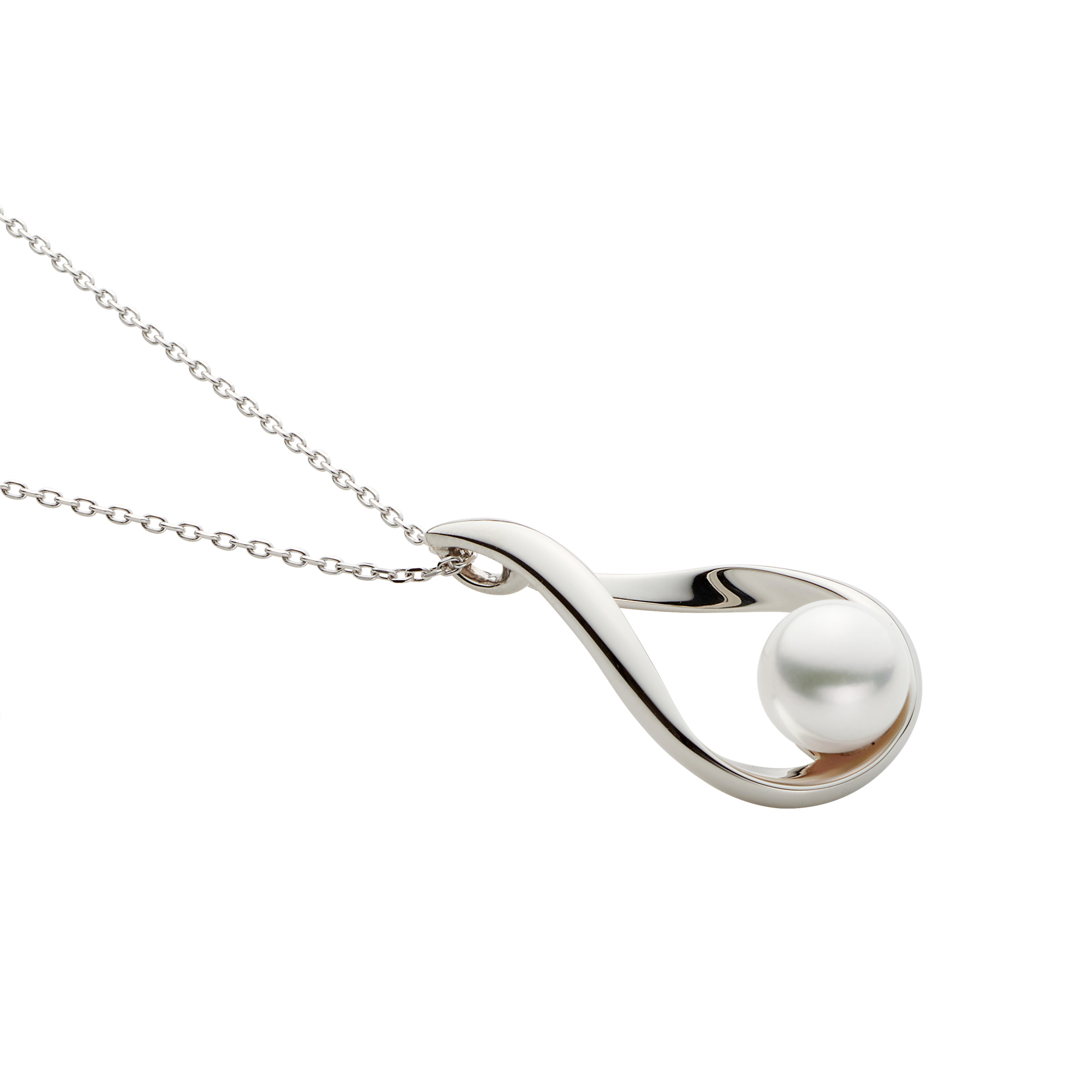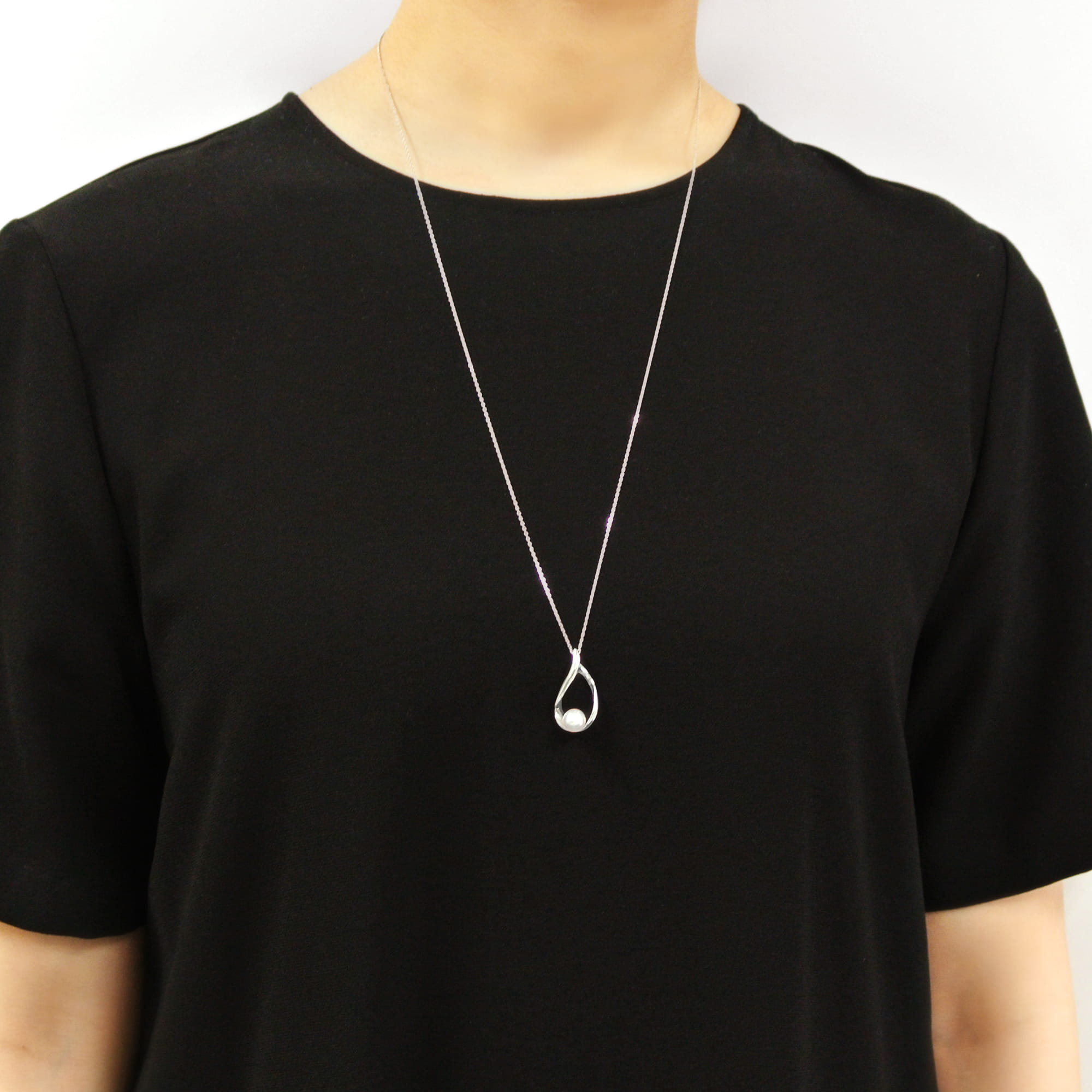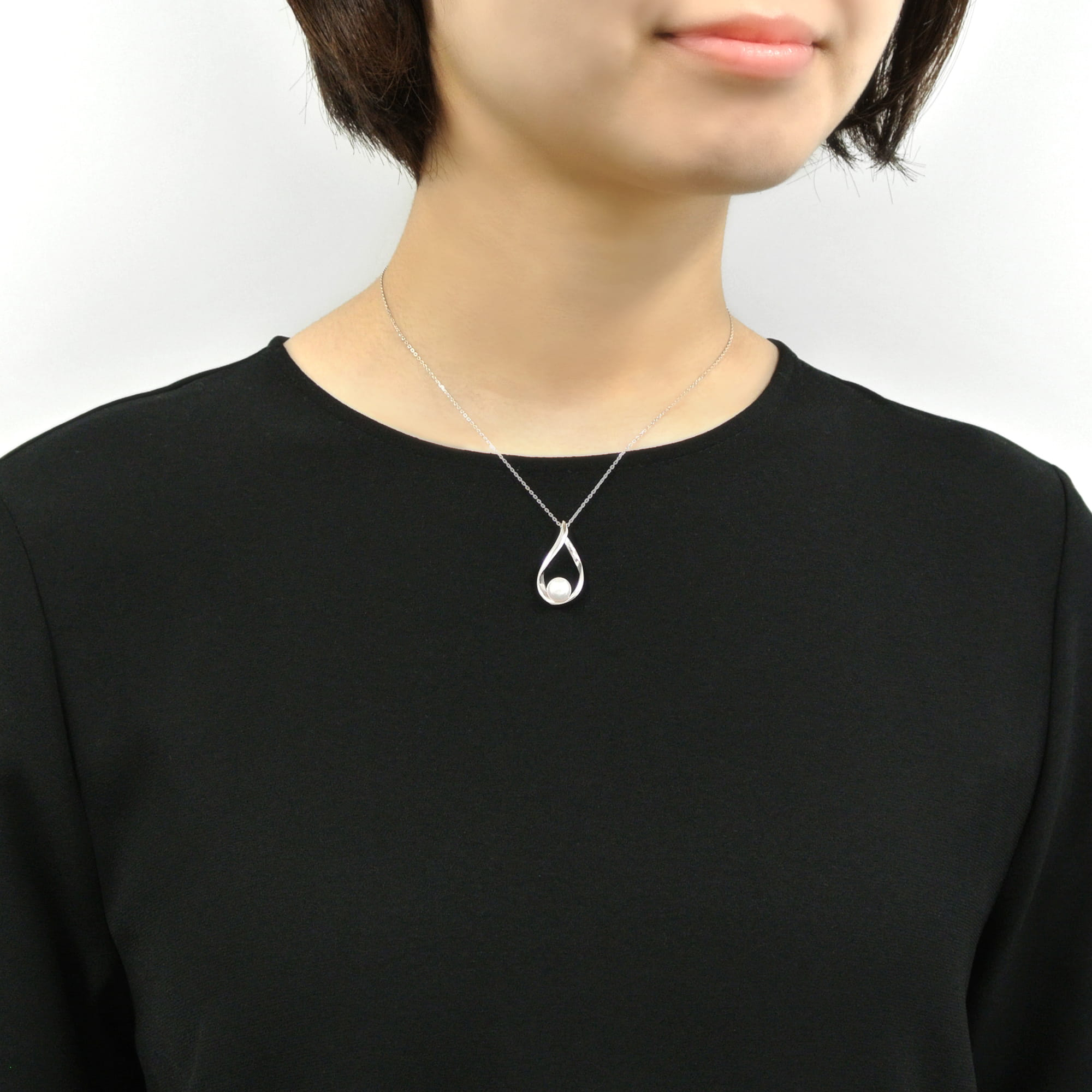 美しく磨き上げられたプラチナの光沢とアコヤパールの柔らかな質感が品良く調和した、女性らしく優美なフォルムが印象的なロングネックレス。