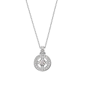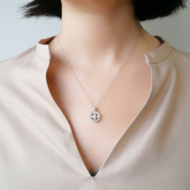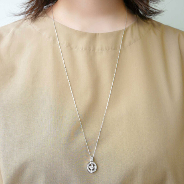さらにモチーフ全体にメレダイヤを贅沢にあしらいながらも、サークルシルエットのカジュアルな雰囲気と65cmと長めのチェーンで、エレガントになりすぎることなく、コーディネートのアクセントとして、日常のスタイルを品良くクラスアップしてくれます。