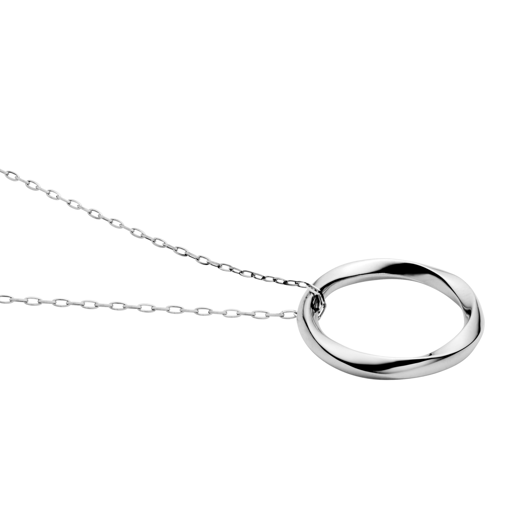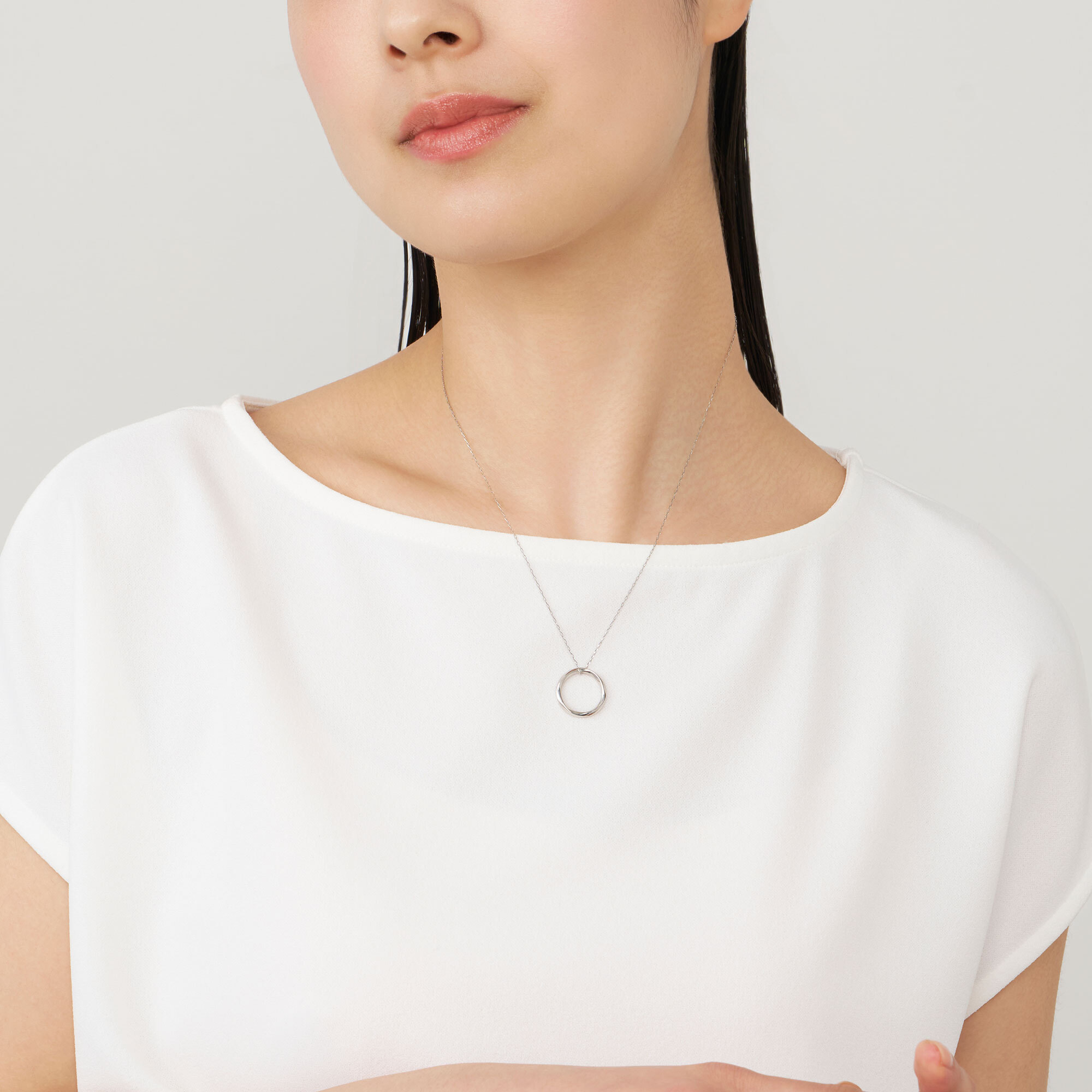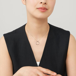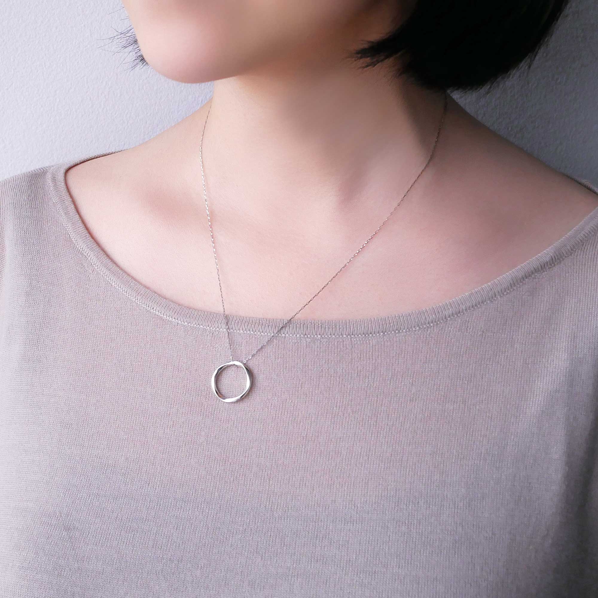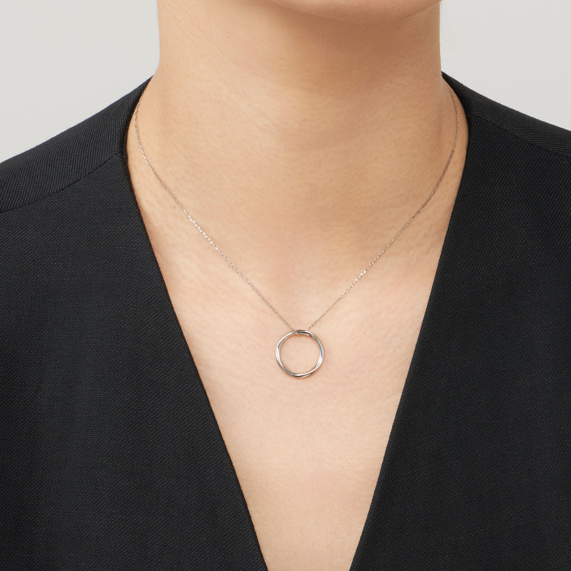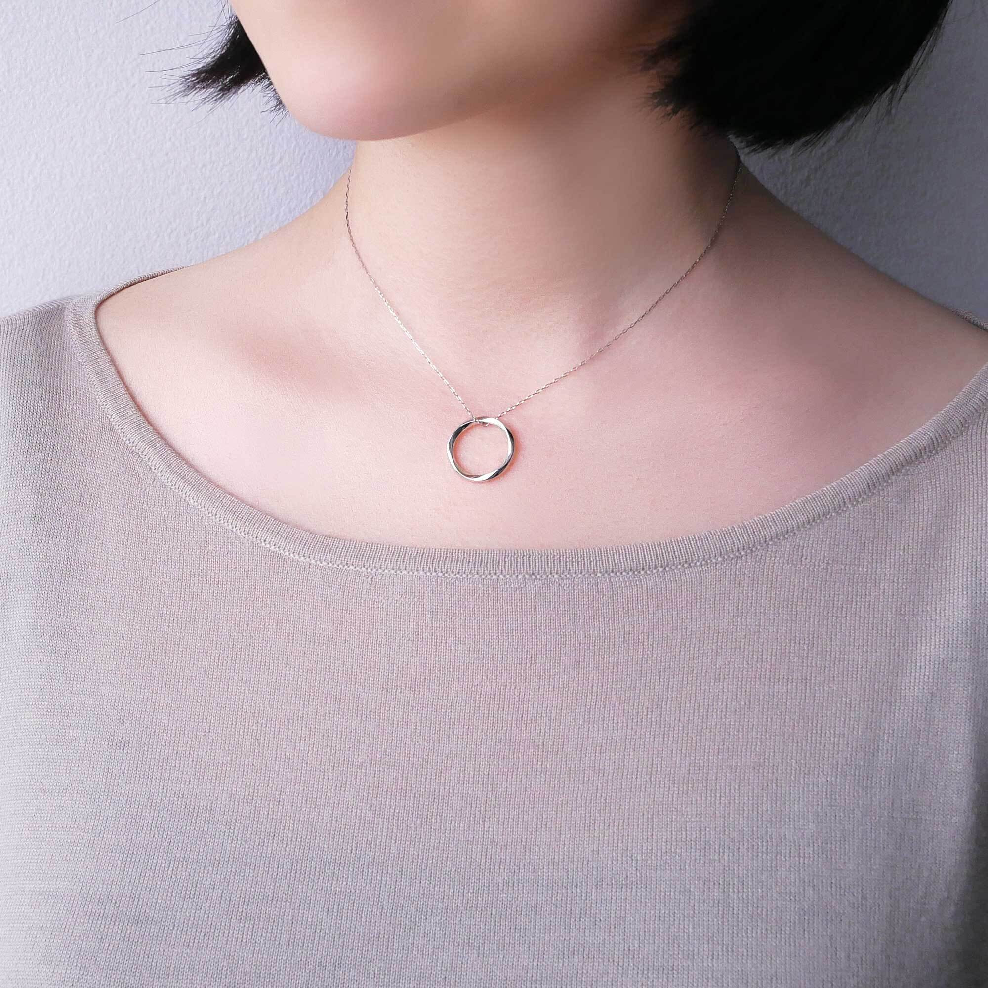 緩やかにひねられたサークルモチーフが波のように柔らかく光を反射し、女性らしく上品でフェミニンな胸元を演出します。