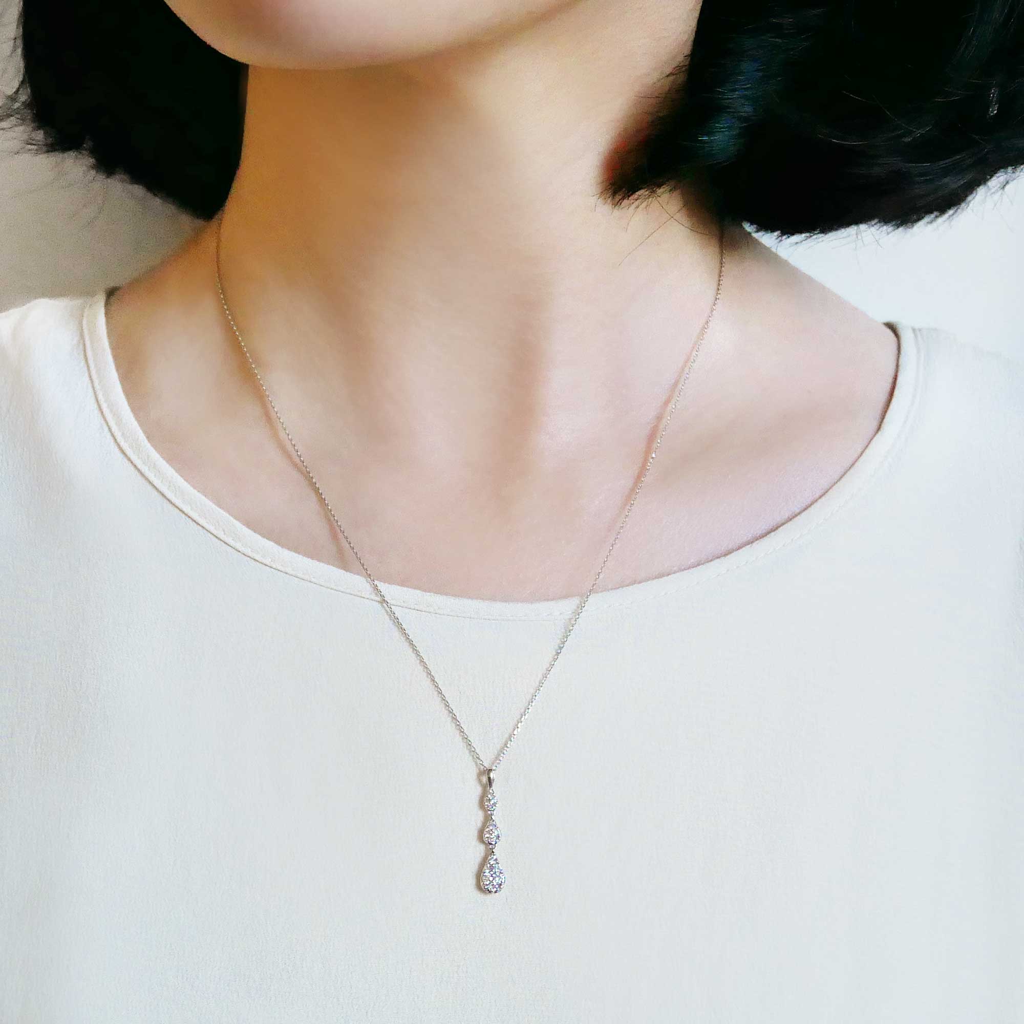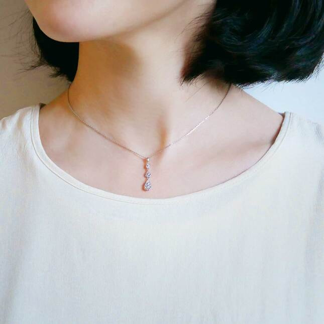 ふっくらとした柔らかい表情のしずくが3つ連なるみずみずしいデザインのネックレスは、下に行くにつれて大きくなっていくグラデーションのフォルムが安定感のある美しいバランスで胸元を飾ります。