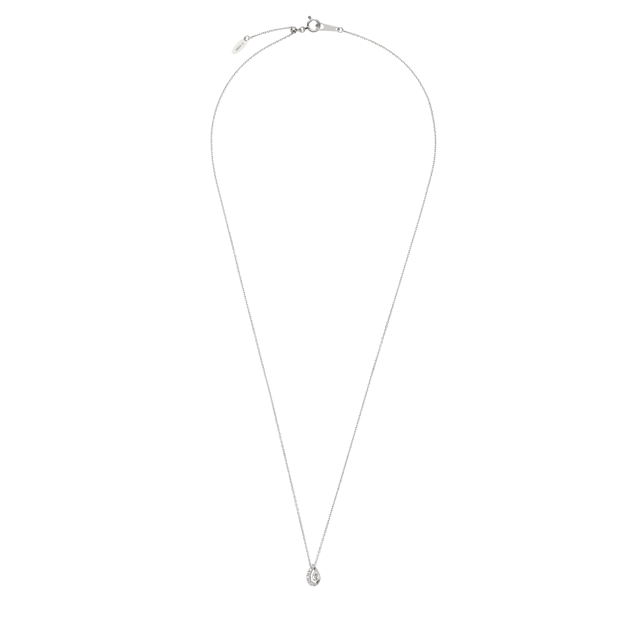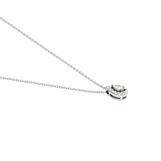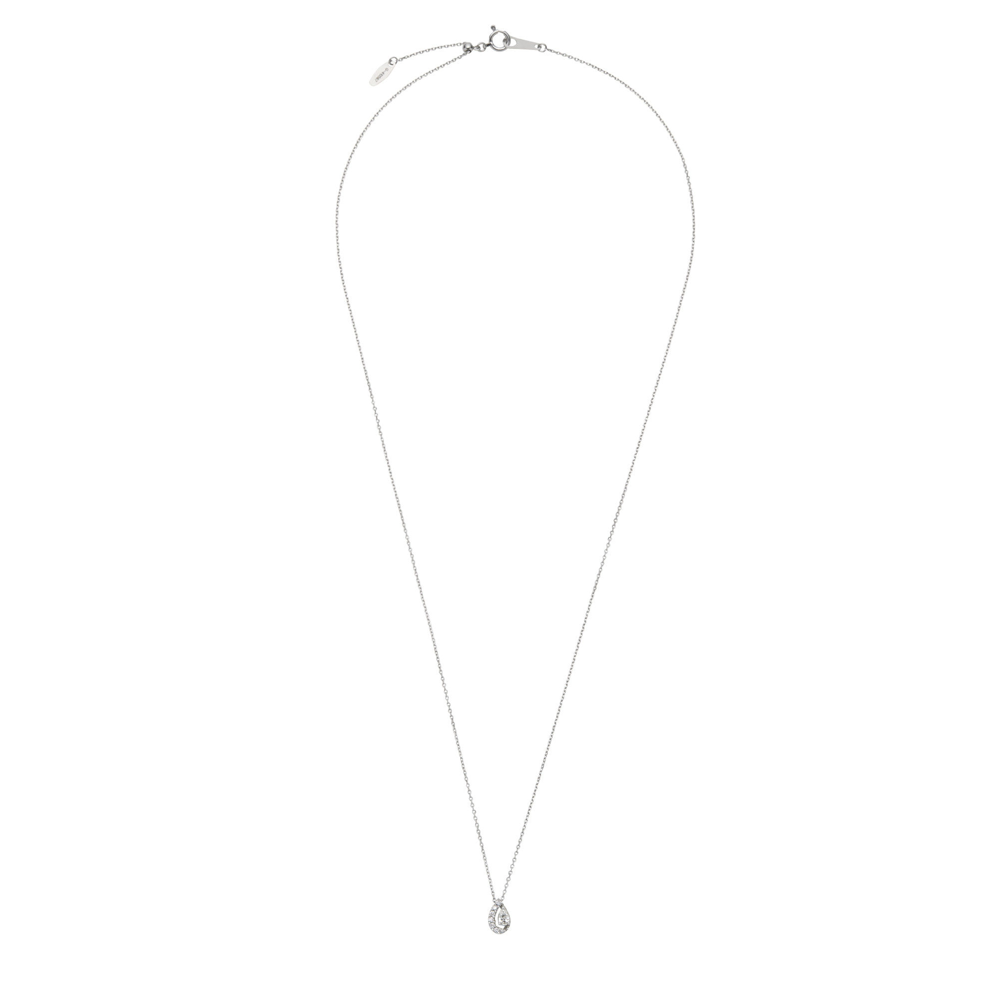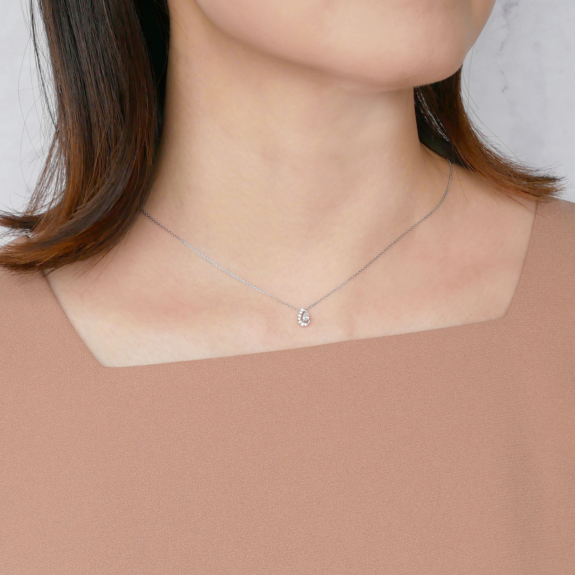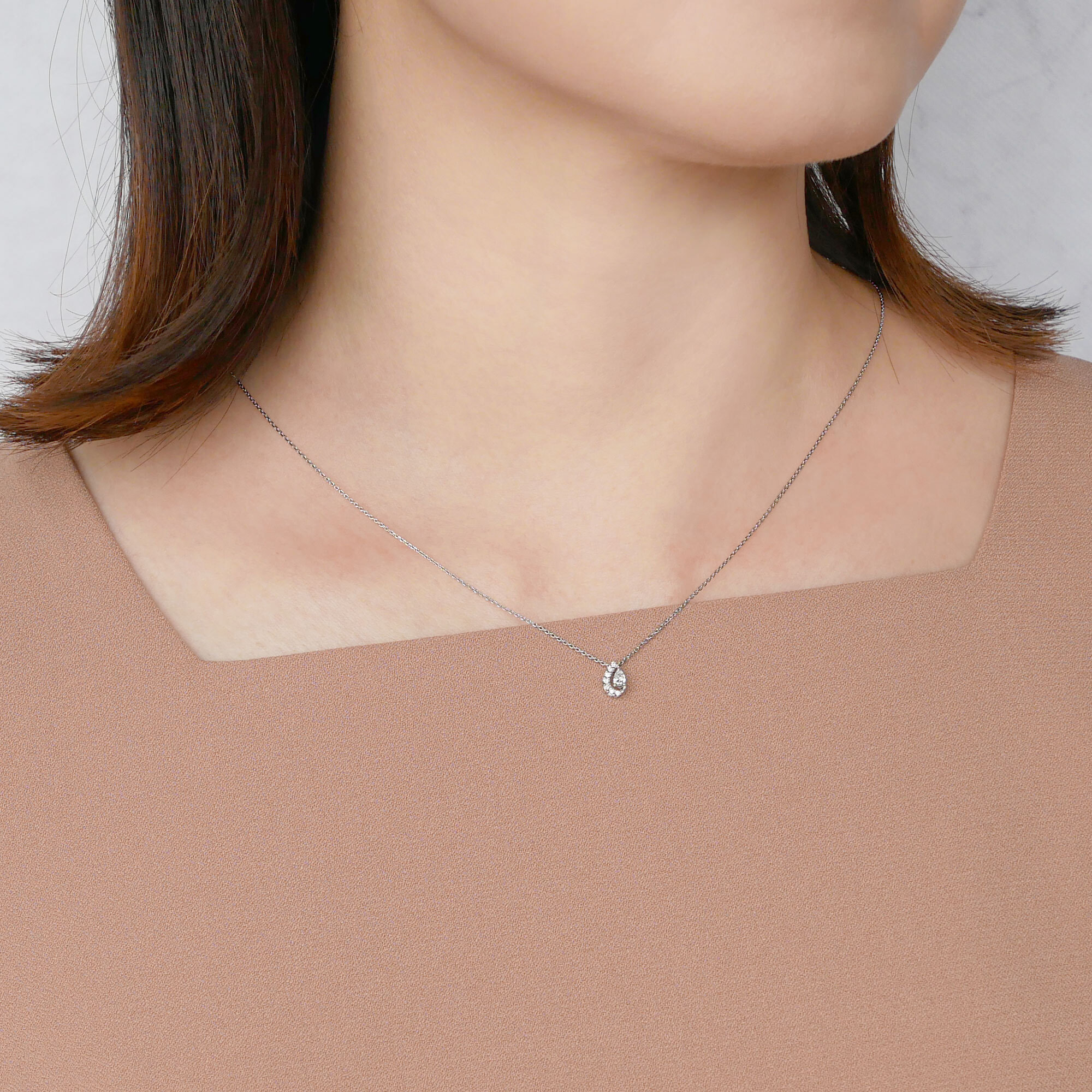 透明感のある煌めきを放つペアシェイプカットダイヤモンドを、繊細なメレダイヤモンドで包み込んだ、潤い溢れる輝きが魅力のネックレス。