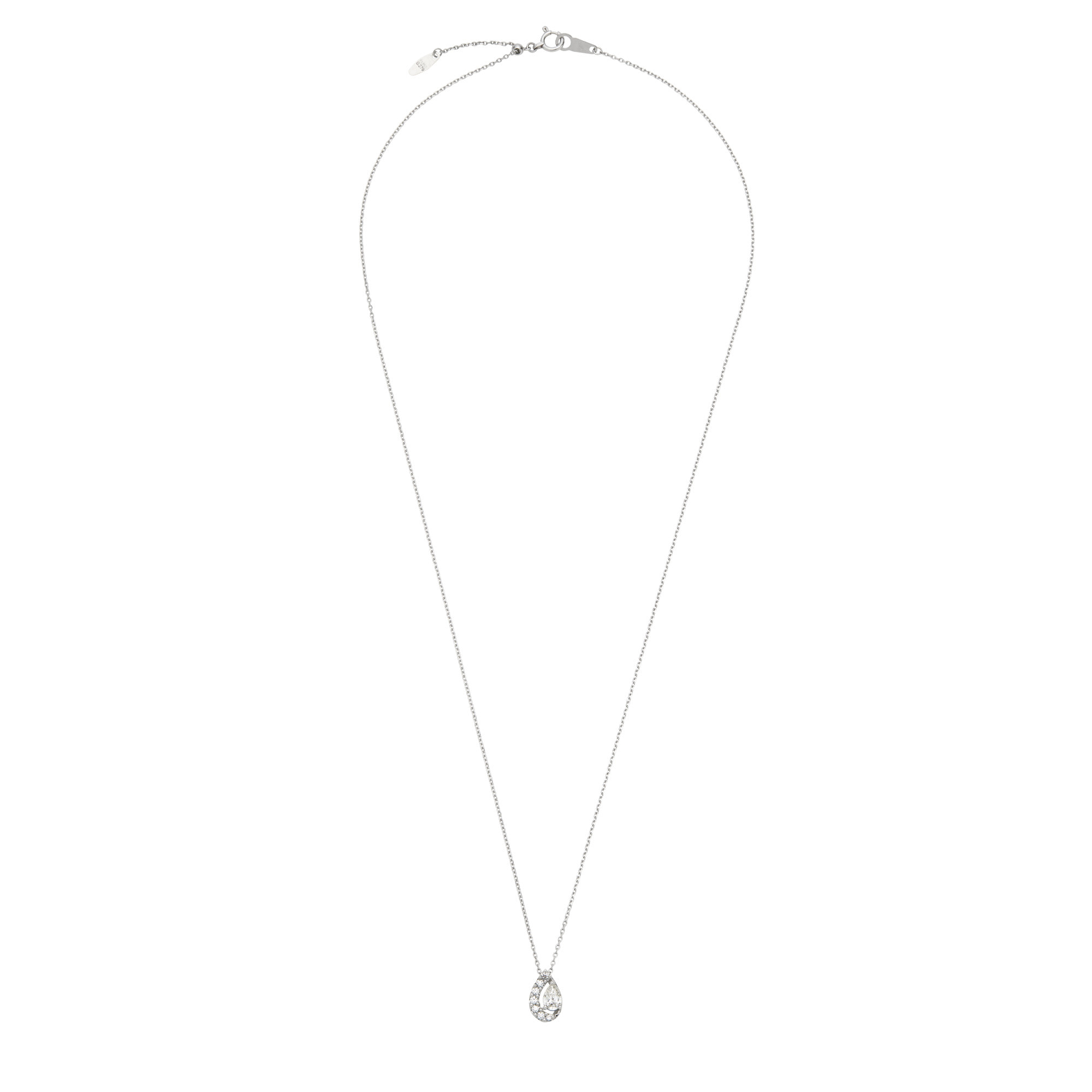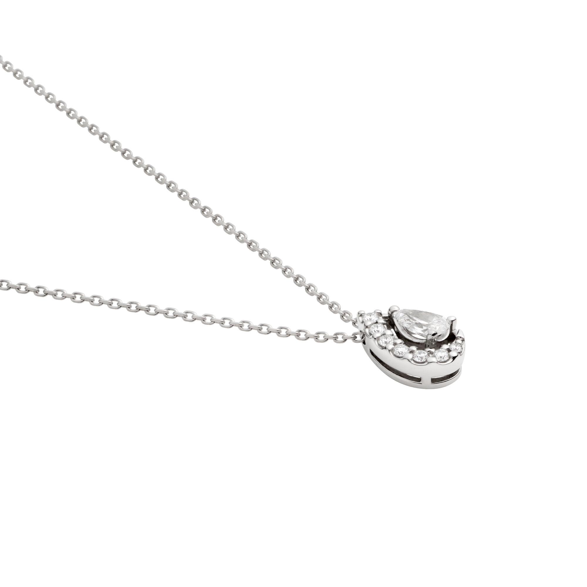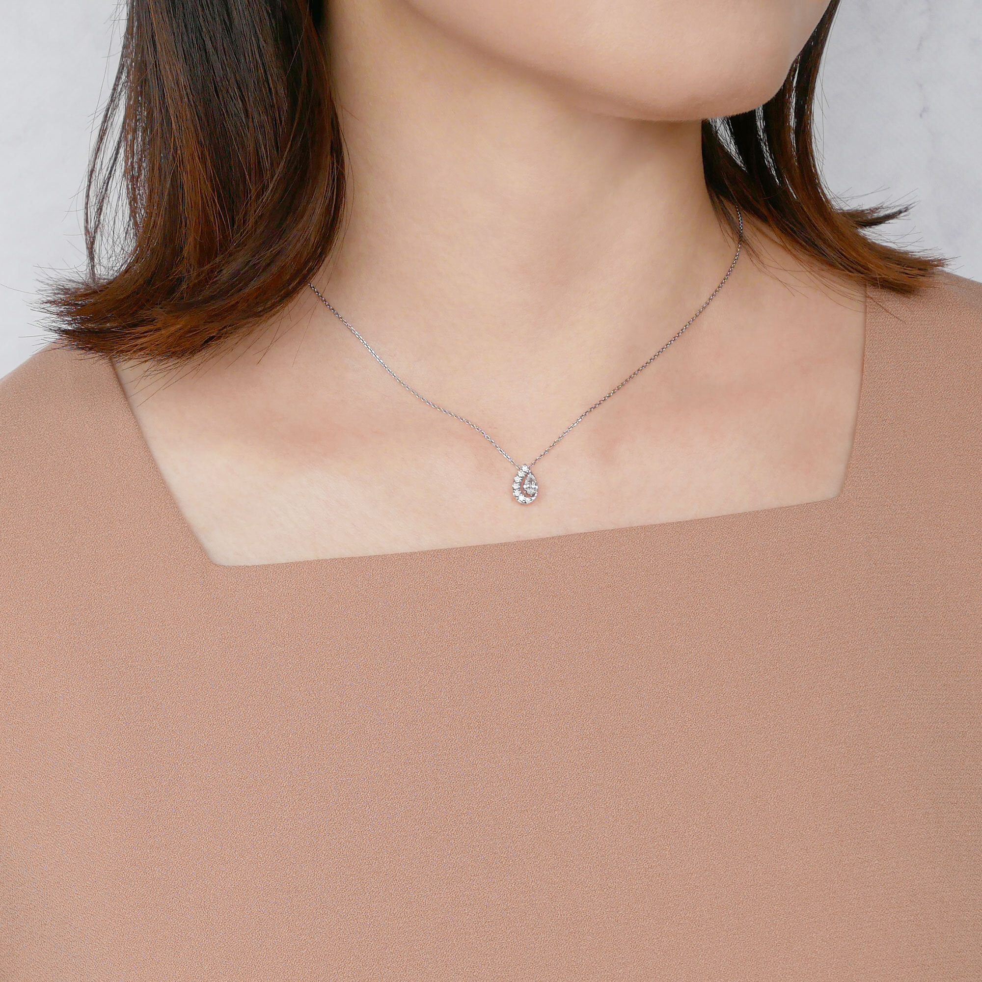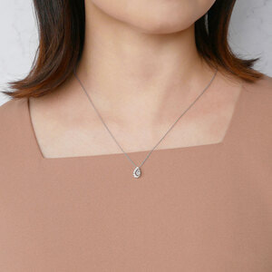 透明感のある煌めきを放つペアシェイプカットダイヤモンドを、繊細なメレダイヤモンドで包み込んだ、潤い溢れる輝きが魅力のネックレス。