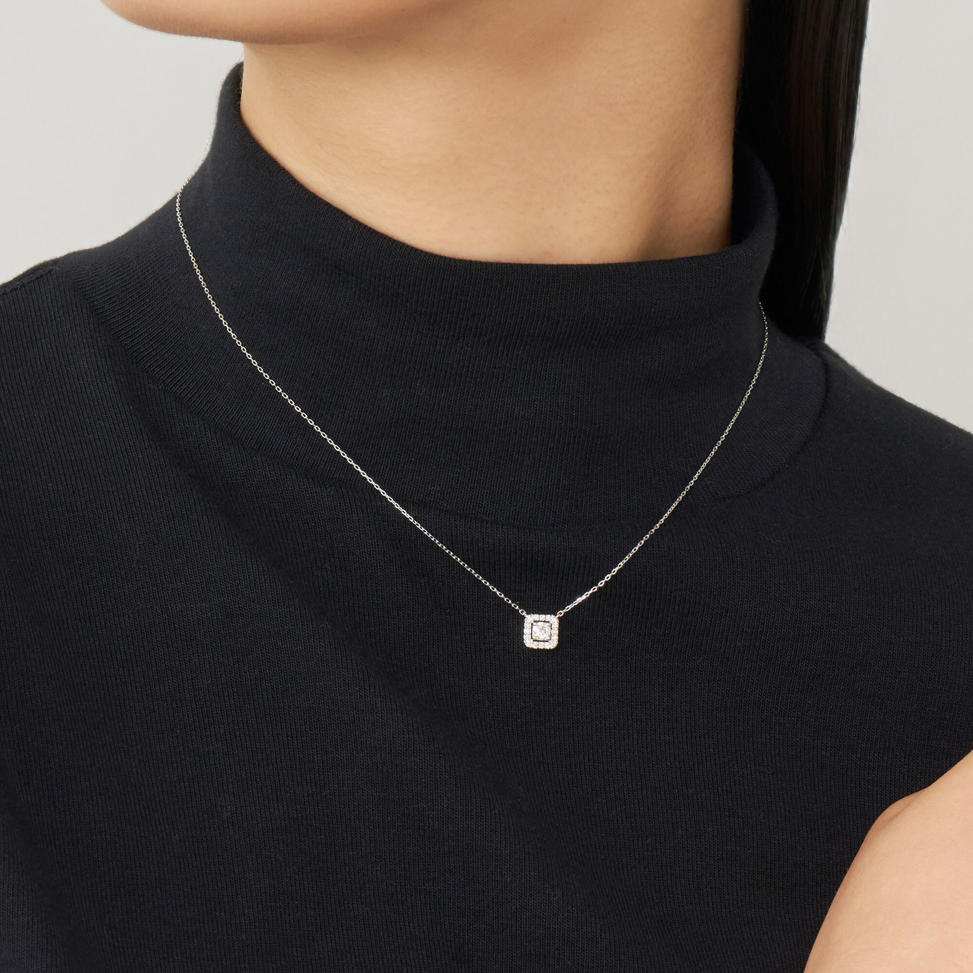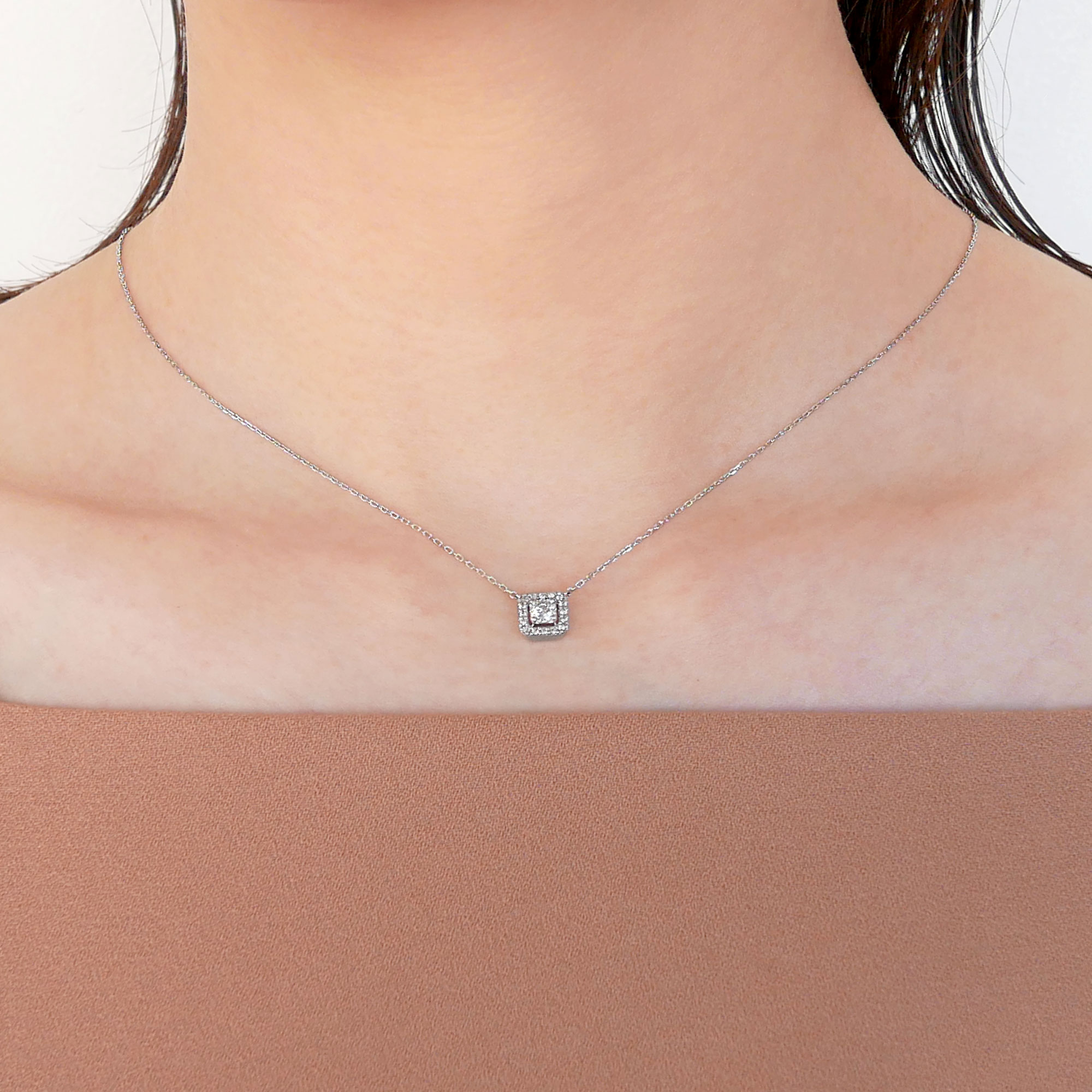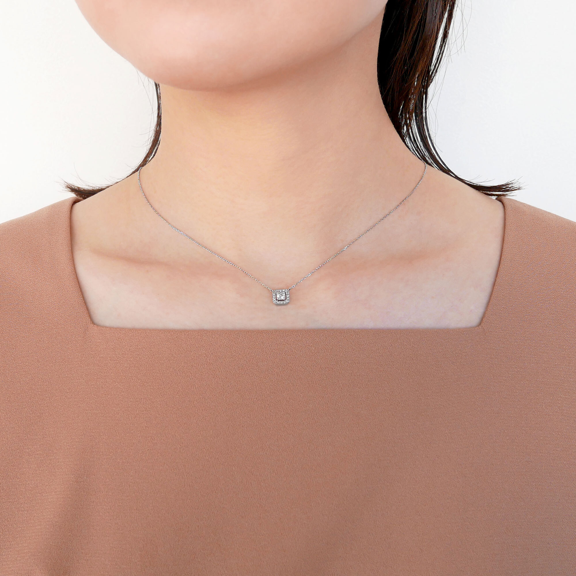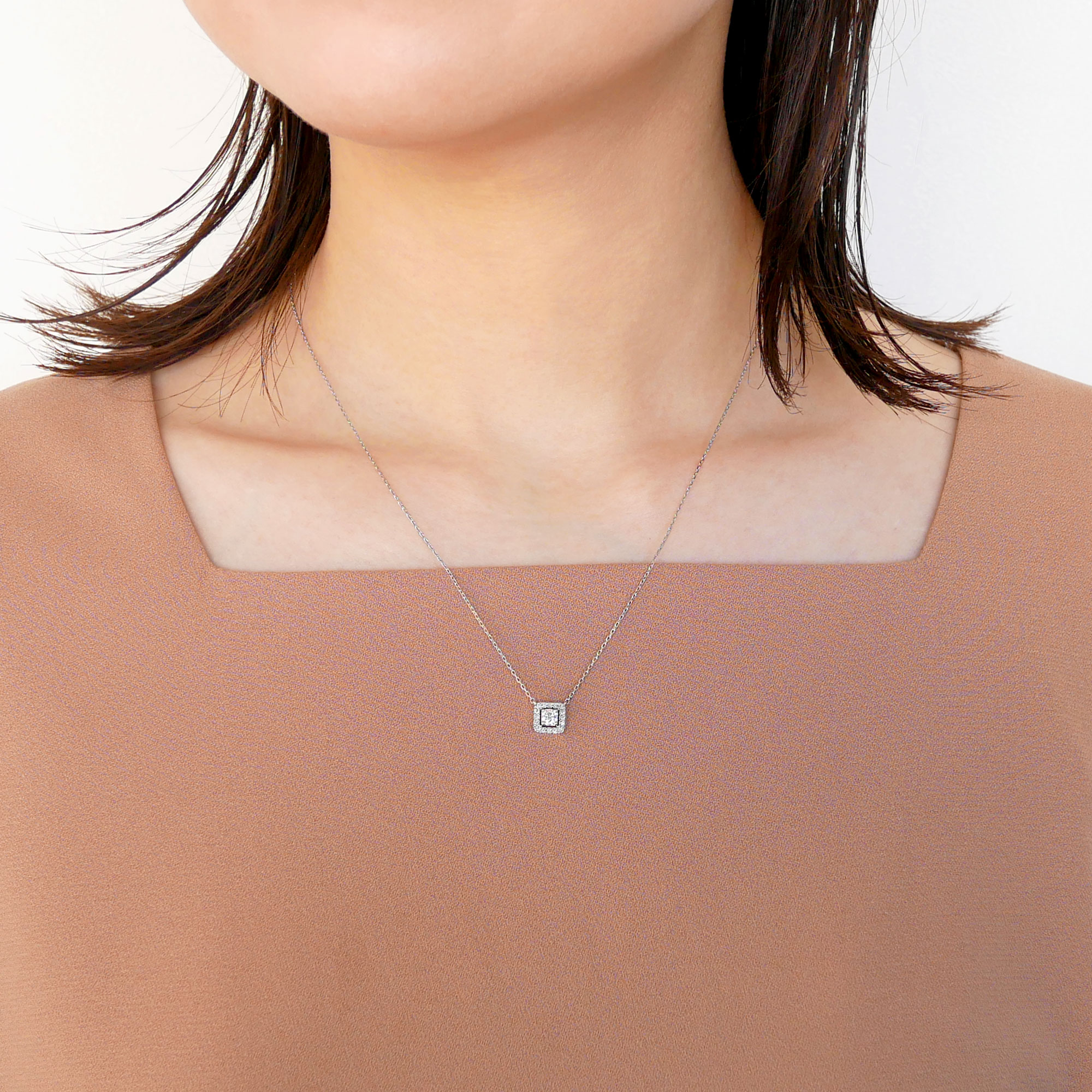 まばゆい輝きを放つエクセレントカットダイヤモンドを、メレダイヤモンドをあしらった八角形のフレームで囲んだ、エレガントなネックレス。