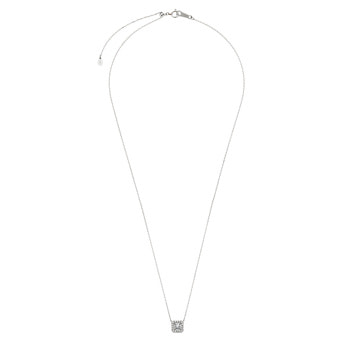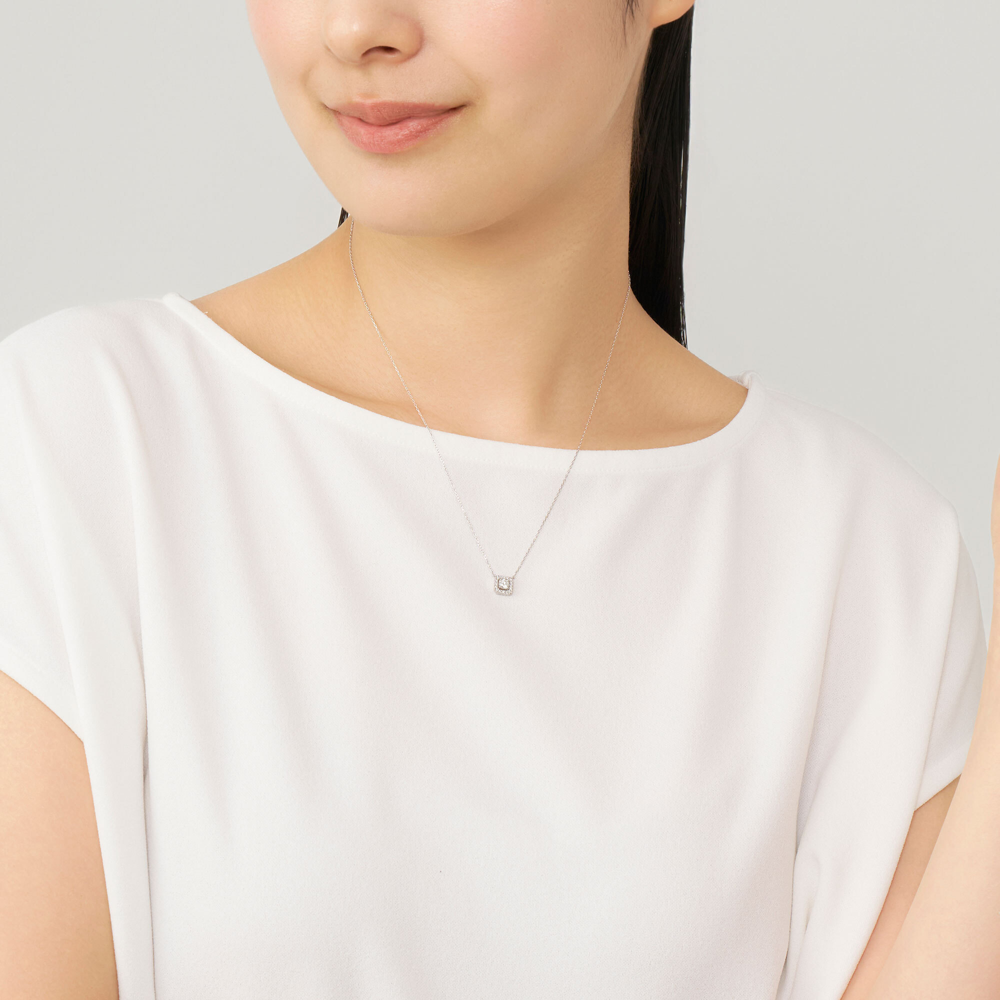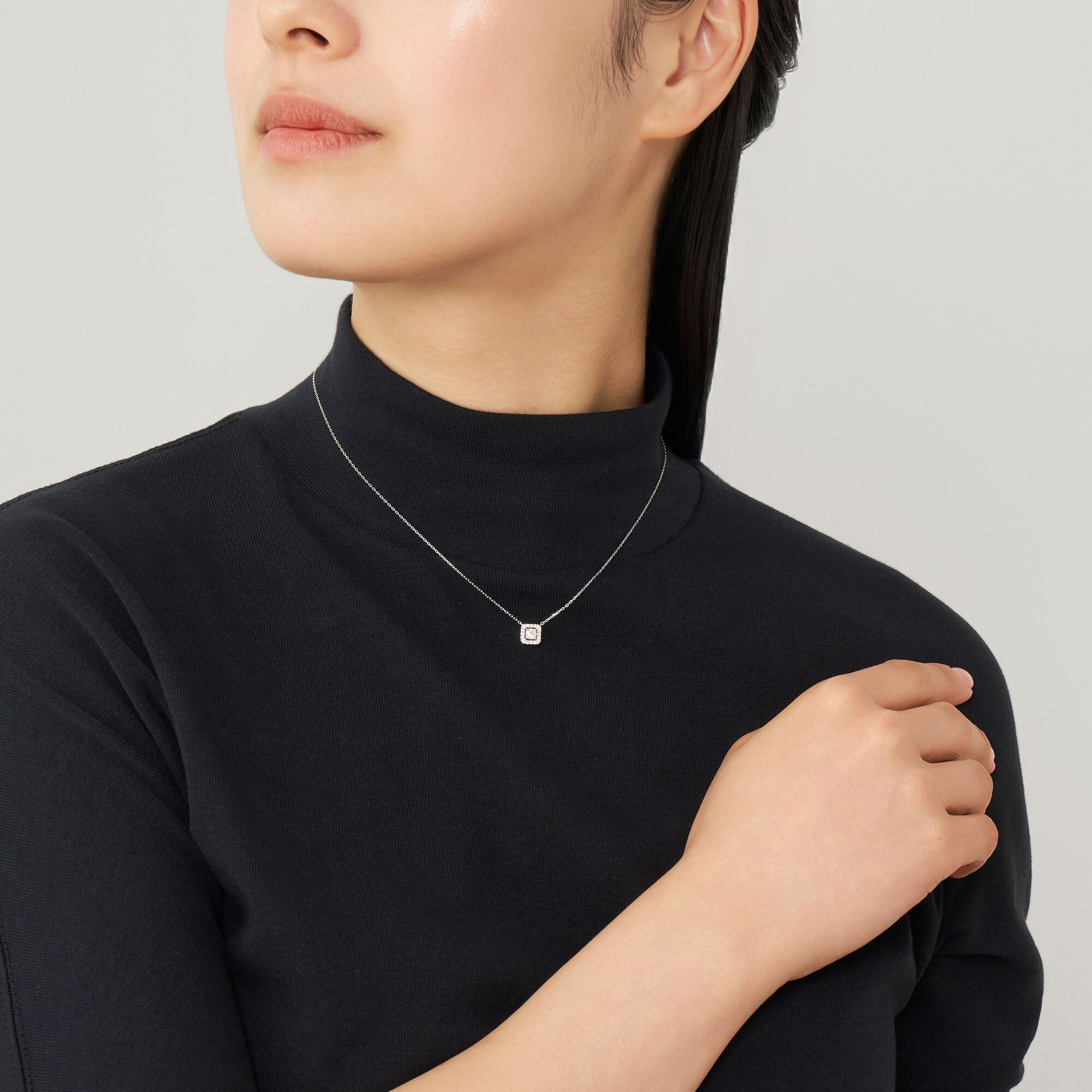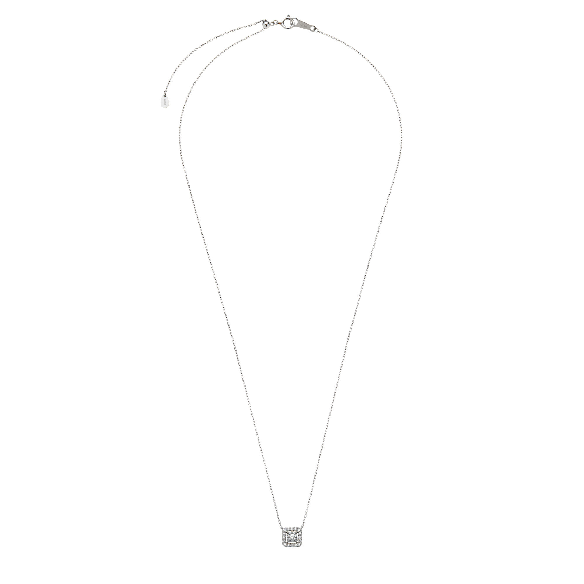 まばゆい輝きを放つエクセレントカットダイヤモンドを、メレダイヤモンドをあしらった八角形のフレームで囲んだ、エレガントなネックレス。