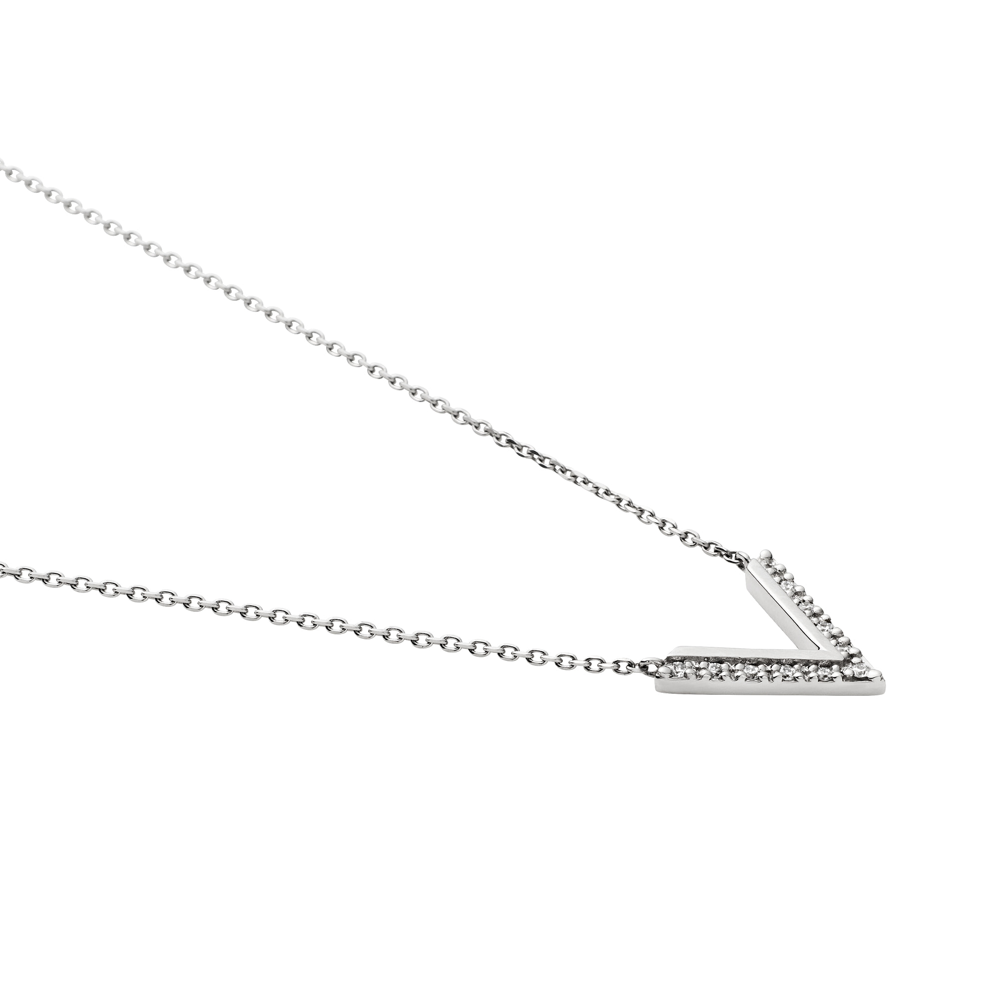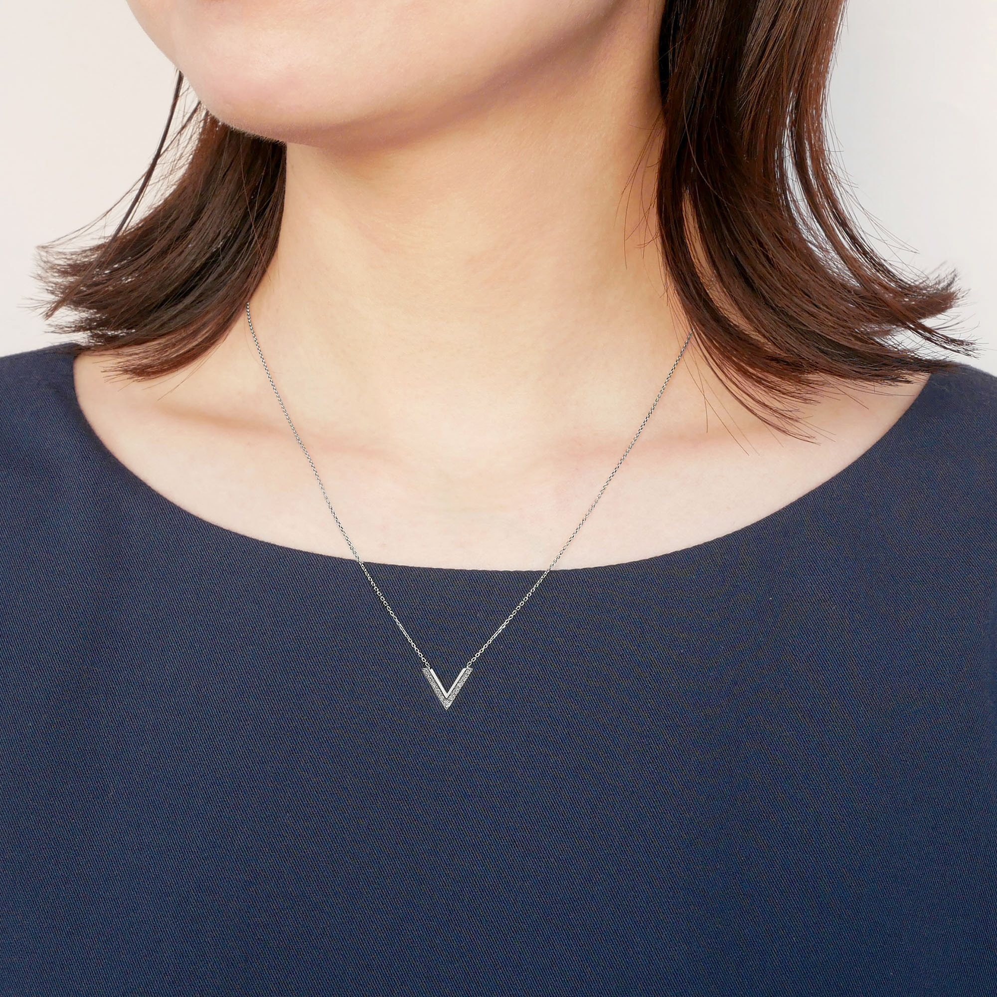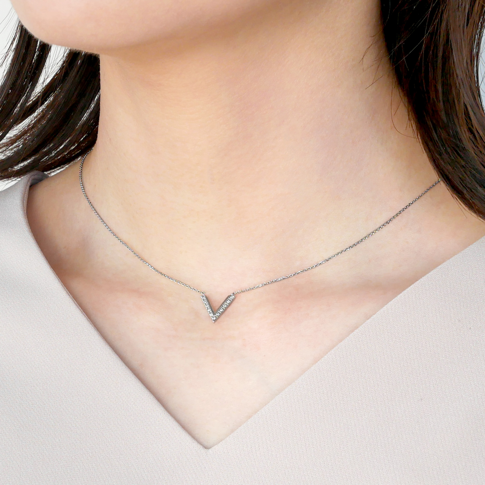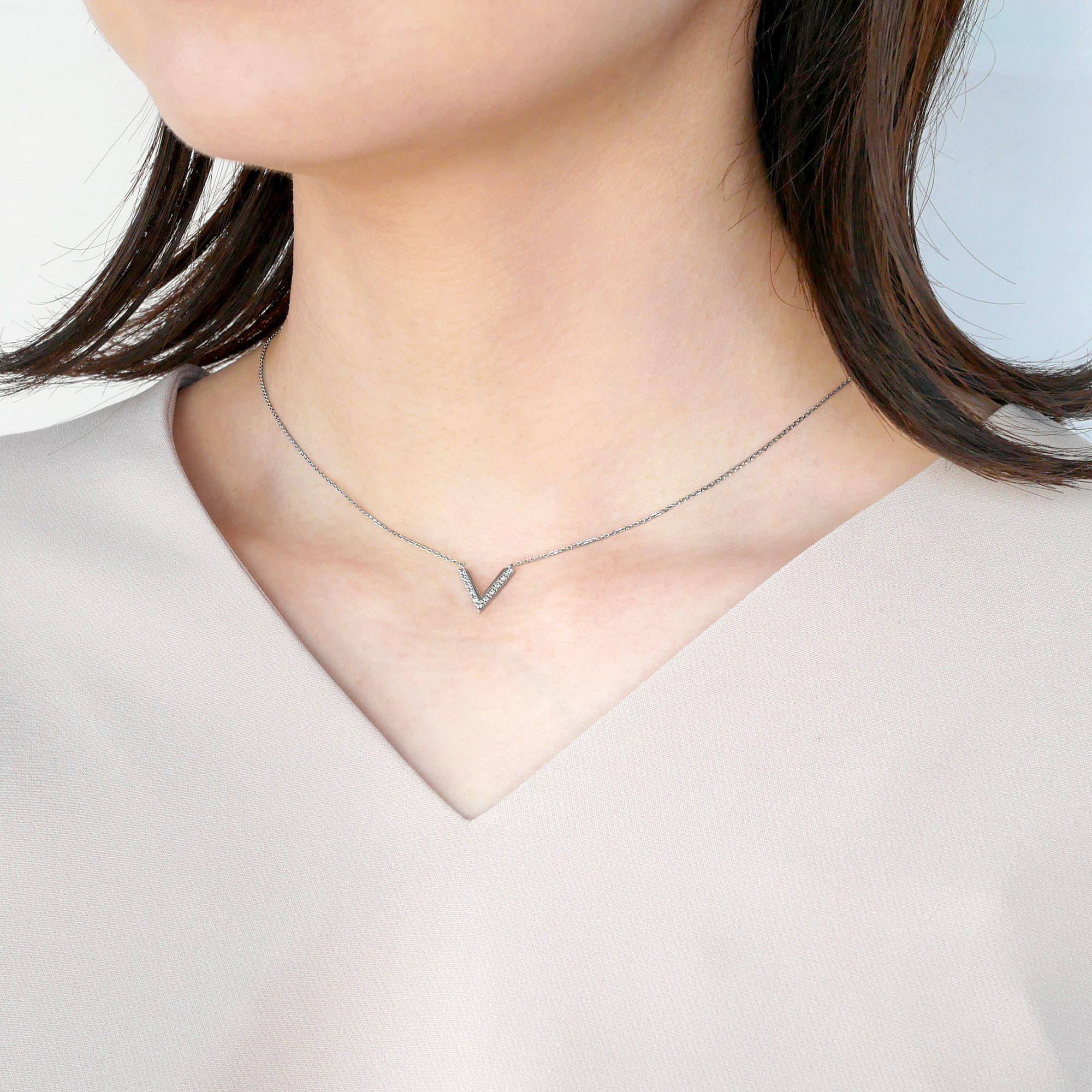 整然と並んだダイヤモンドの煌めきを引き立てるように、艶やかなプラチナの光沢がVのラインを描く、エッジの効いたデザイン。