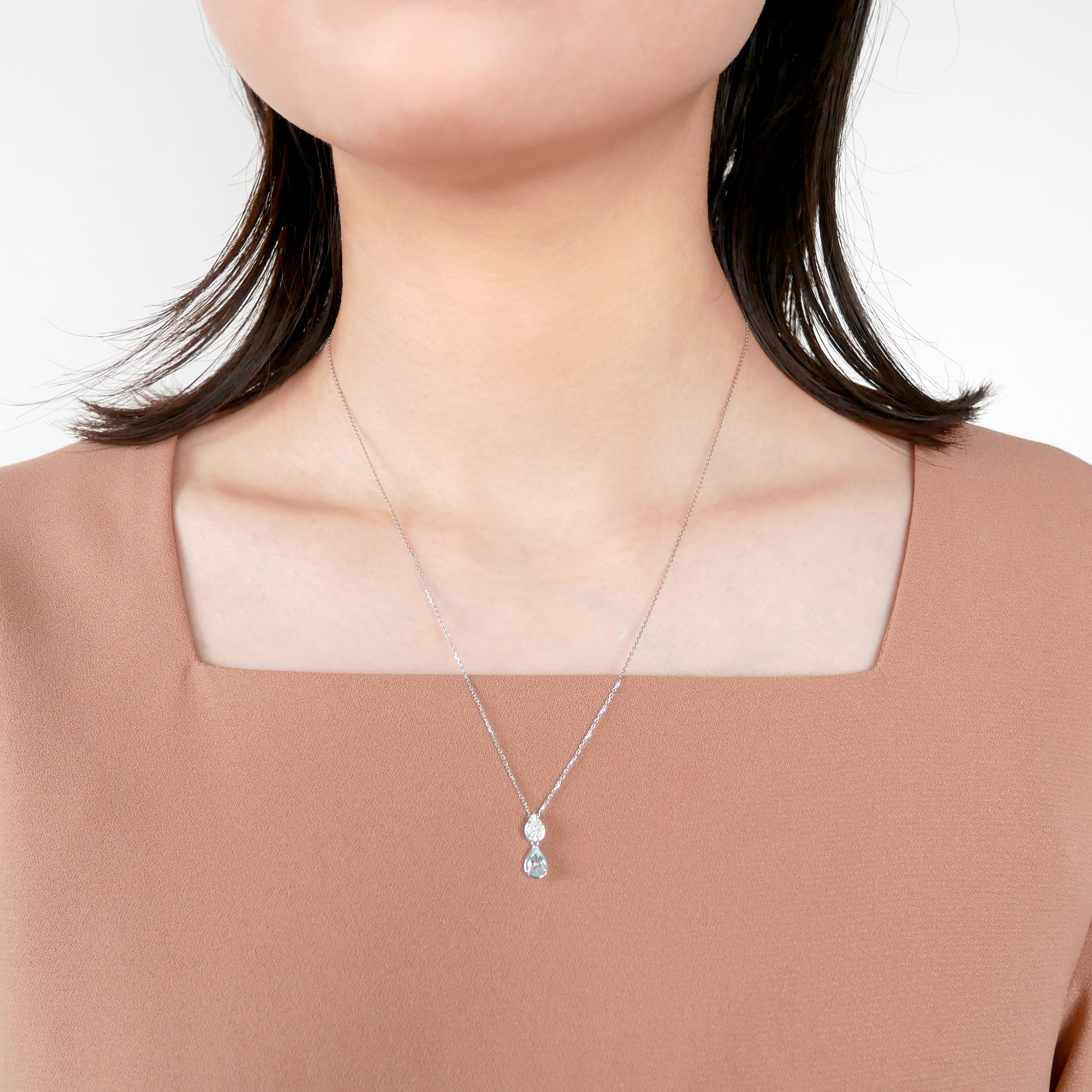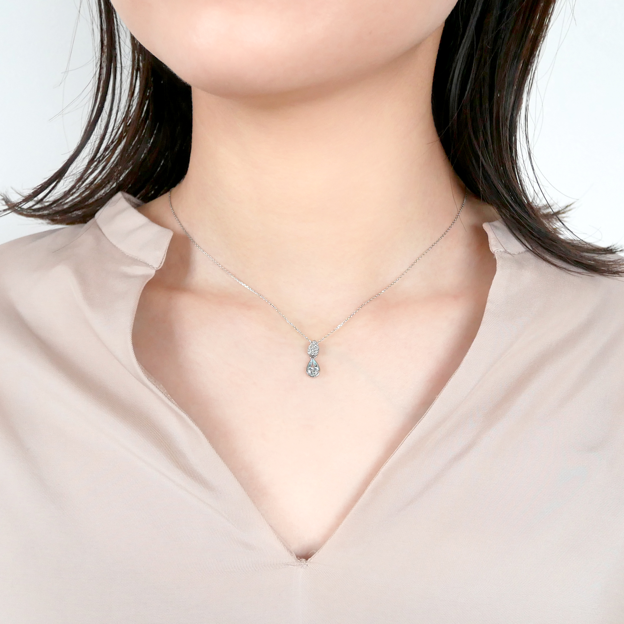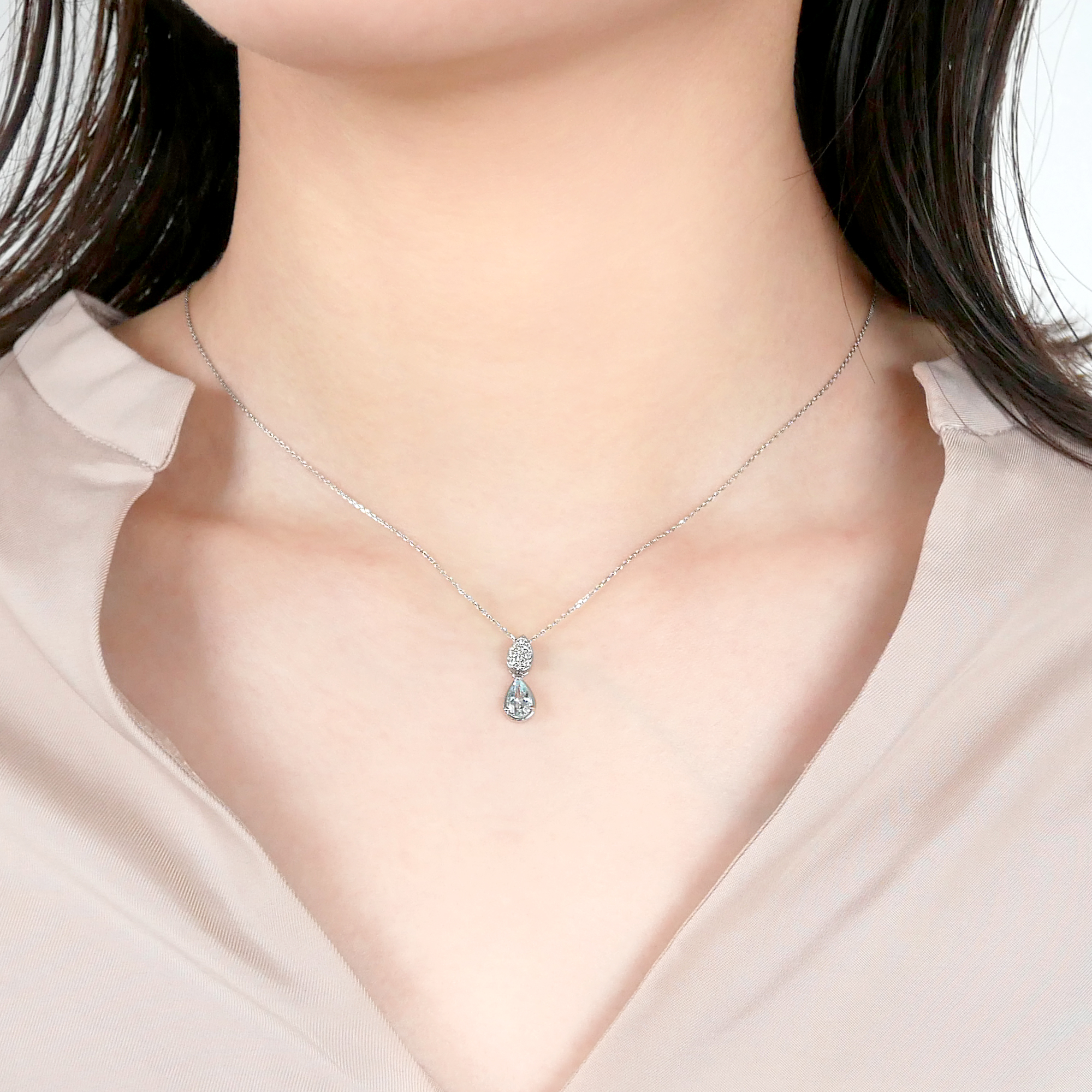 大粒のアクアマリンが胸元にみずみずしい輝きをまとわせるネックレス。