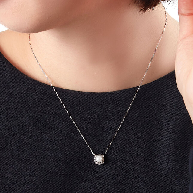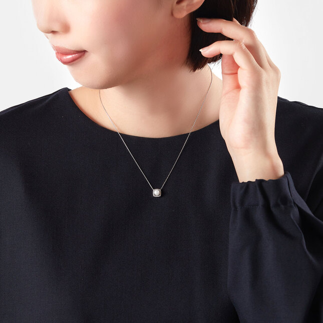 上品な色合いと光沢が魅力のアコヤパールを、ダイヤモンドで贅沢に取り巻いたネックレス。