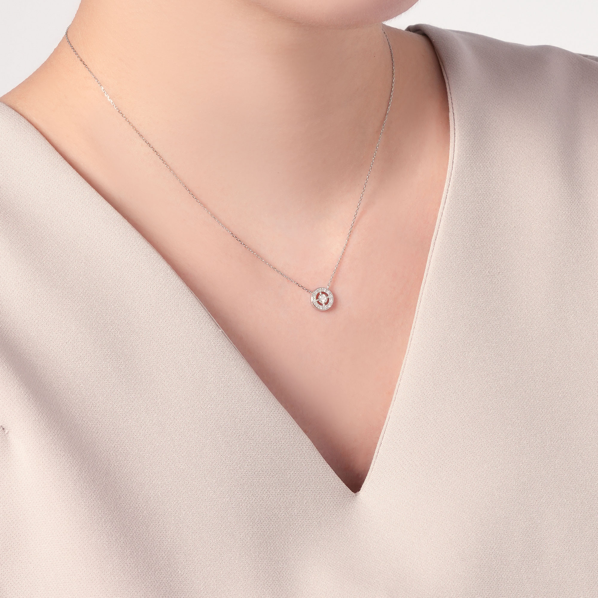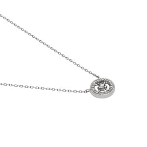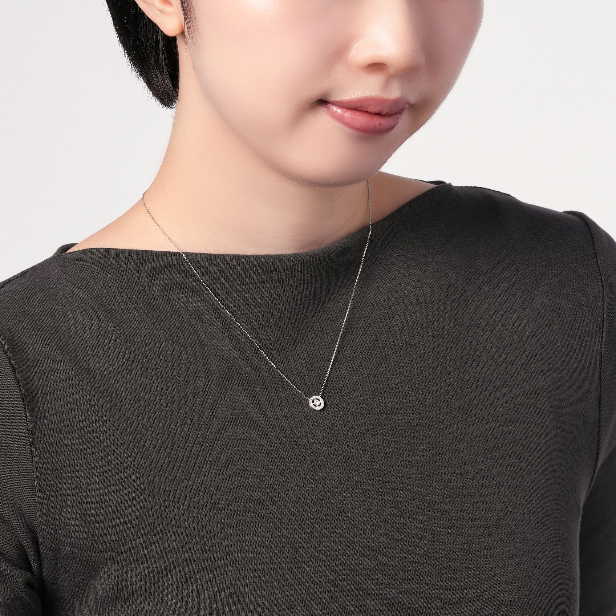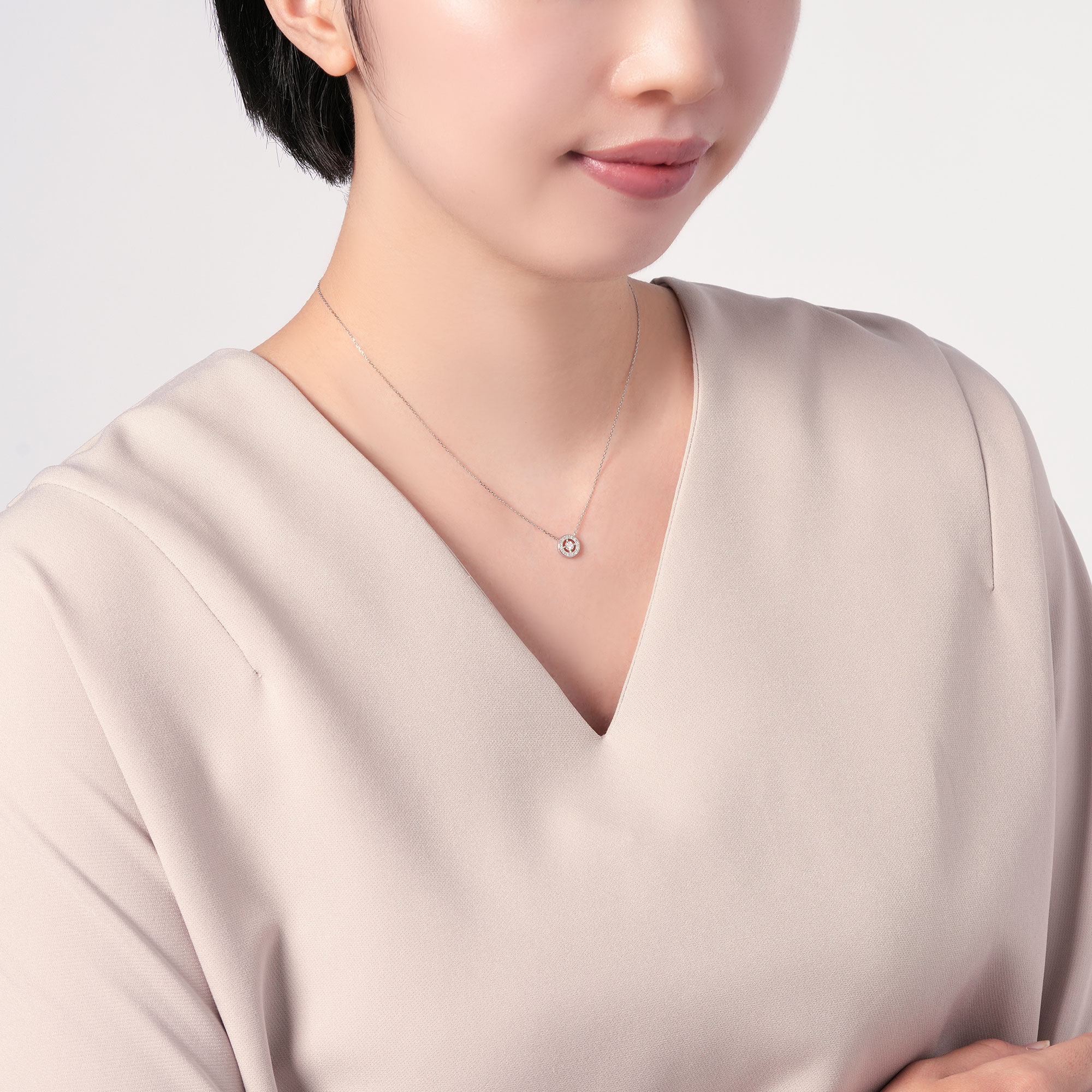 粒感のあるセンターストーンを繊細なメレダイヤモンドで取り巻いた、正統感溢れるネックレス。
