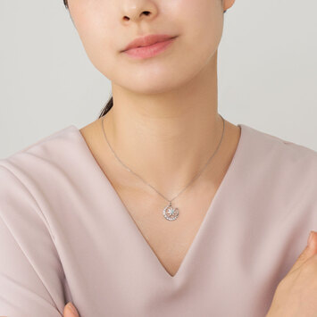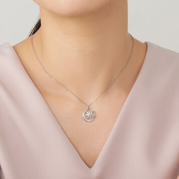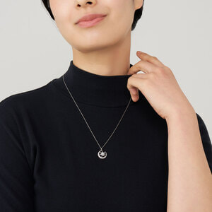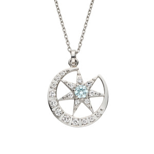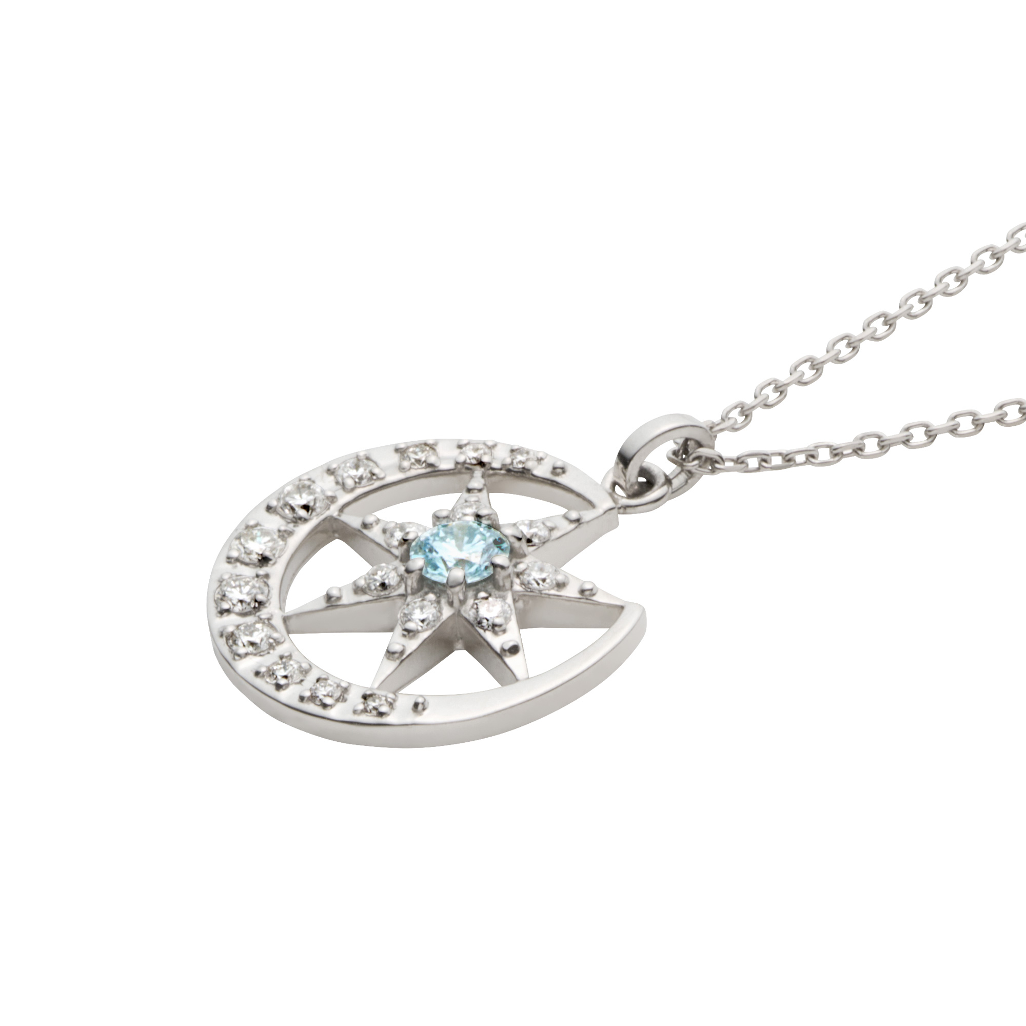 プラチナの三日月にスターモチーフを閉じ込め、中央にアイスブルーダイヤモンドをあしらった、ロマンティックなムード溢れるネックレス。