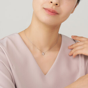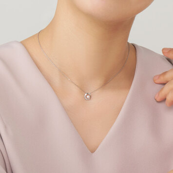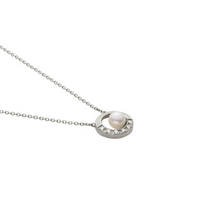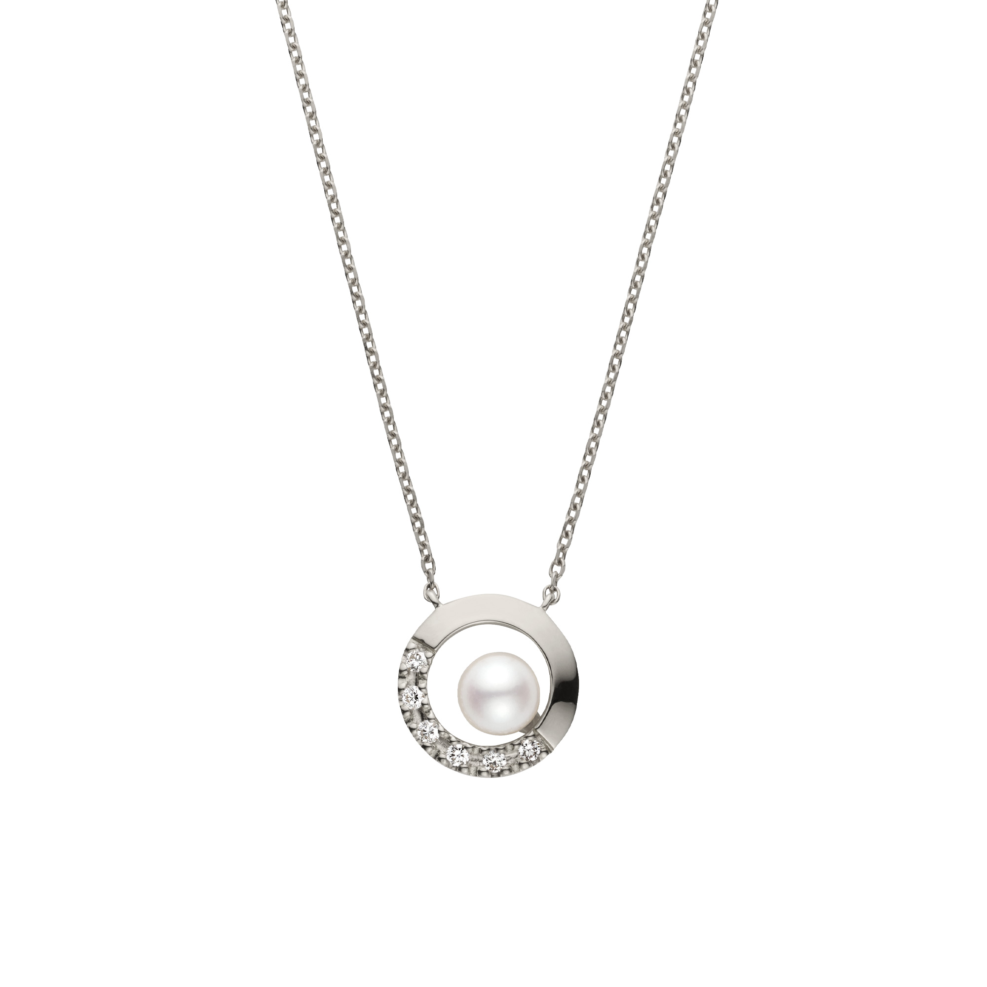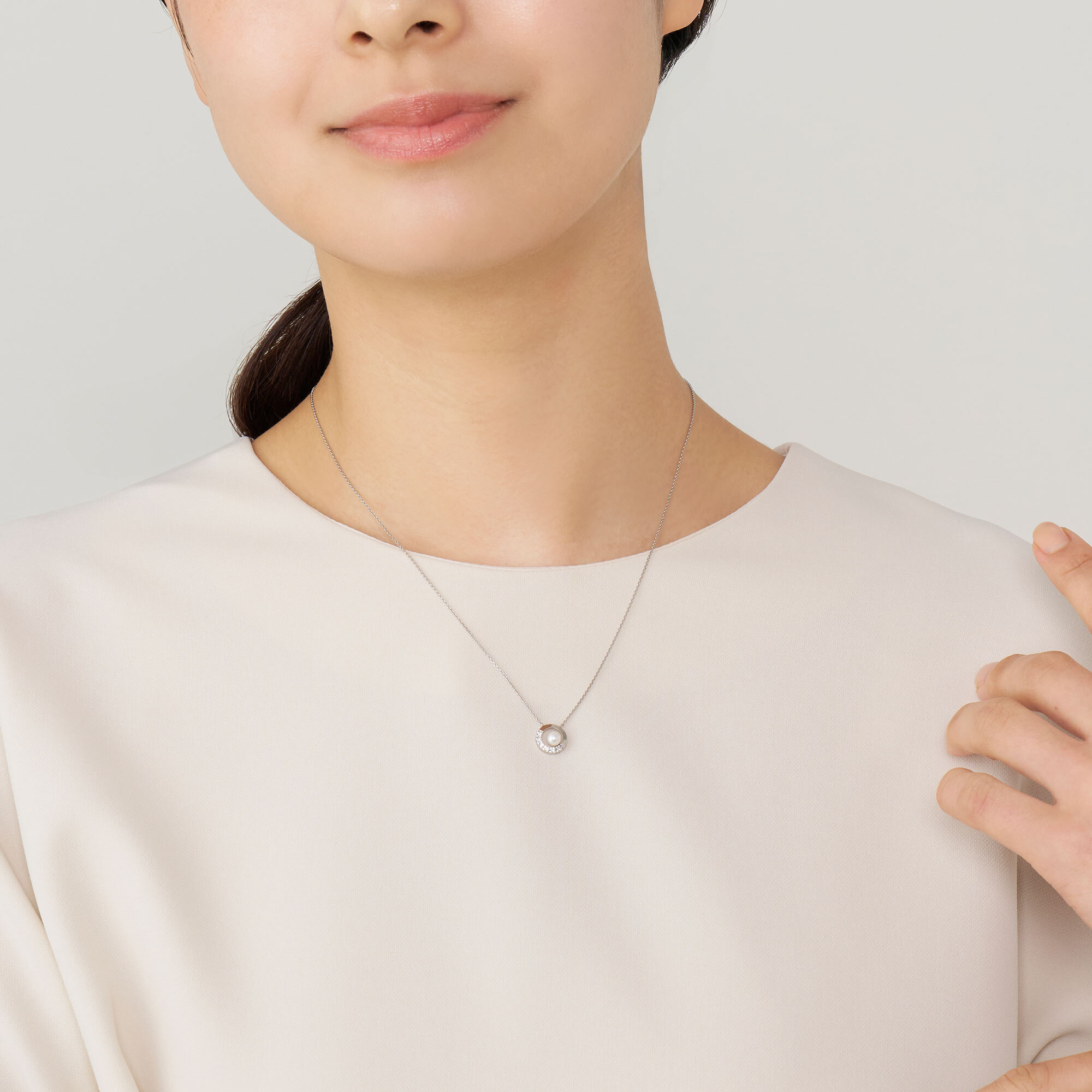 プラチナとダイヤモンドが輝くサークルの中に、アコヤパールを一粒閉じ込めたモダンなデザインのネックレス。
