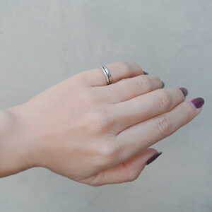 地金のたっぷりしたリングに繊細なダイヤモンドのラインが寄り添ったデザインのピンキーリング。
