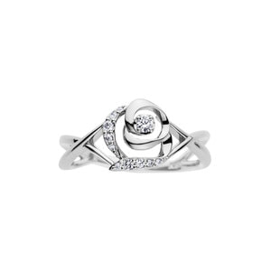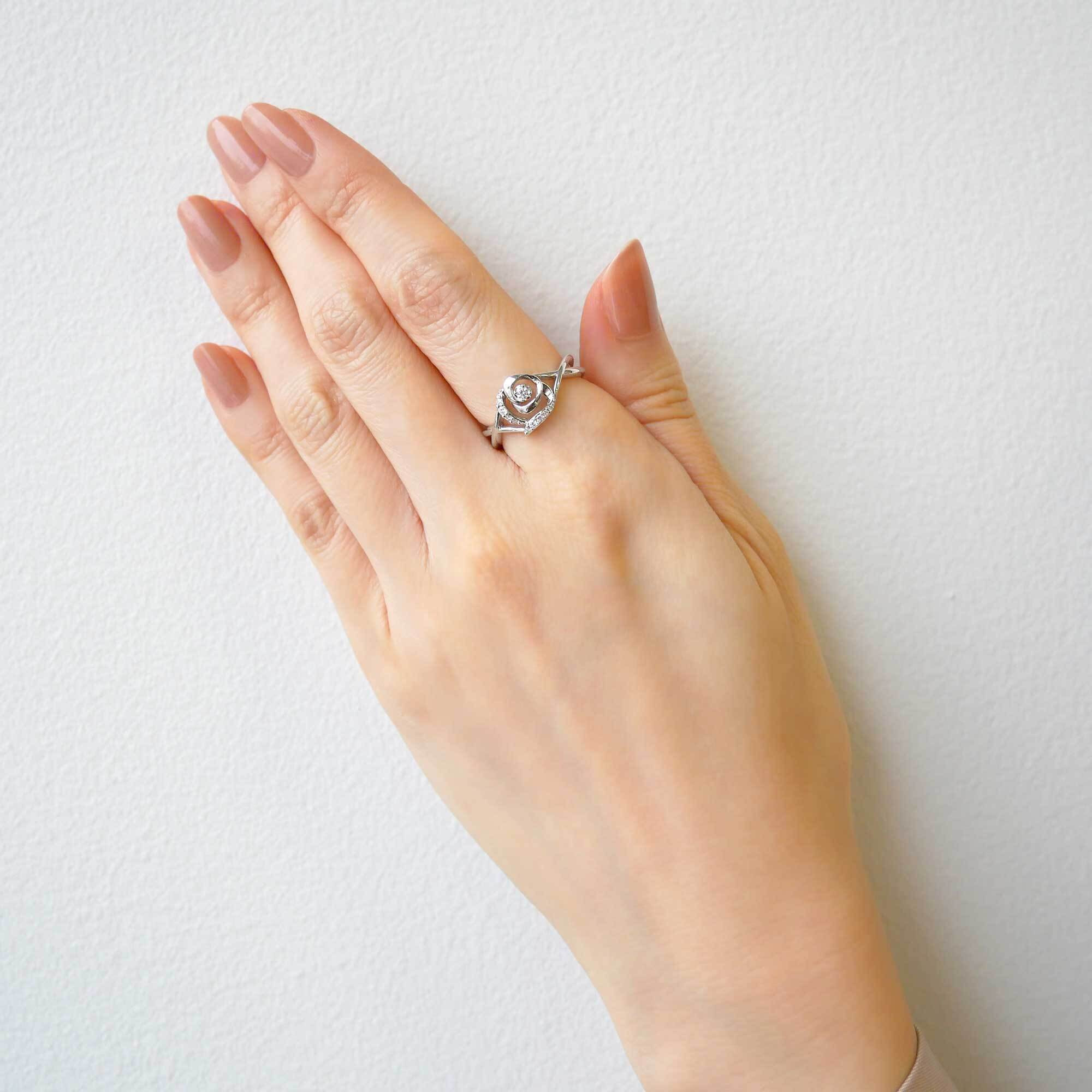 センターに輝くダイヤモンドからふんわりと広がるように描かれたプラチナのラインは、バラの蕾がゆっくりとほどけていくイメージ。なめらかにクロスしたアームが指先を綺麗に見せてくれます。