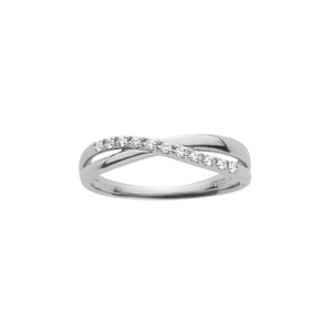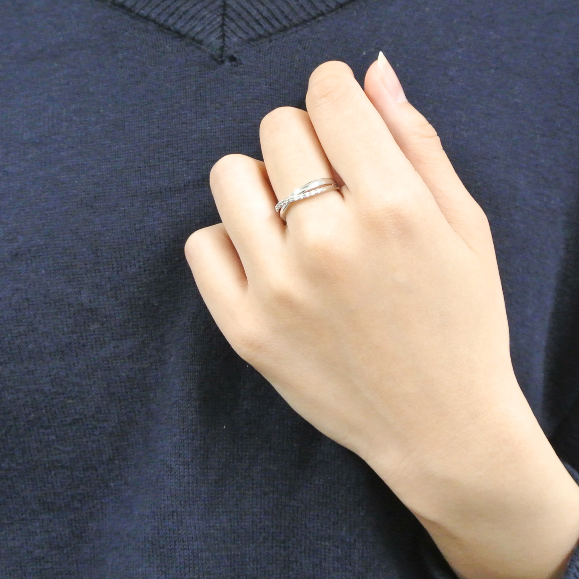 奥深い光沢のプラチナのラインと、煌めくダイヤモンドのラインが立体的に交差したモダンなデザインのリング。