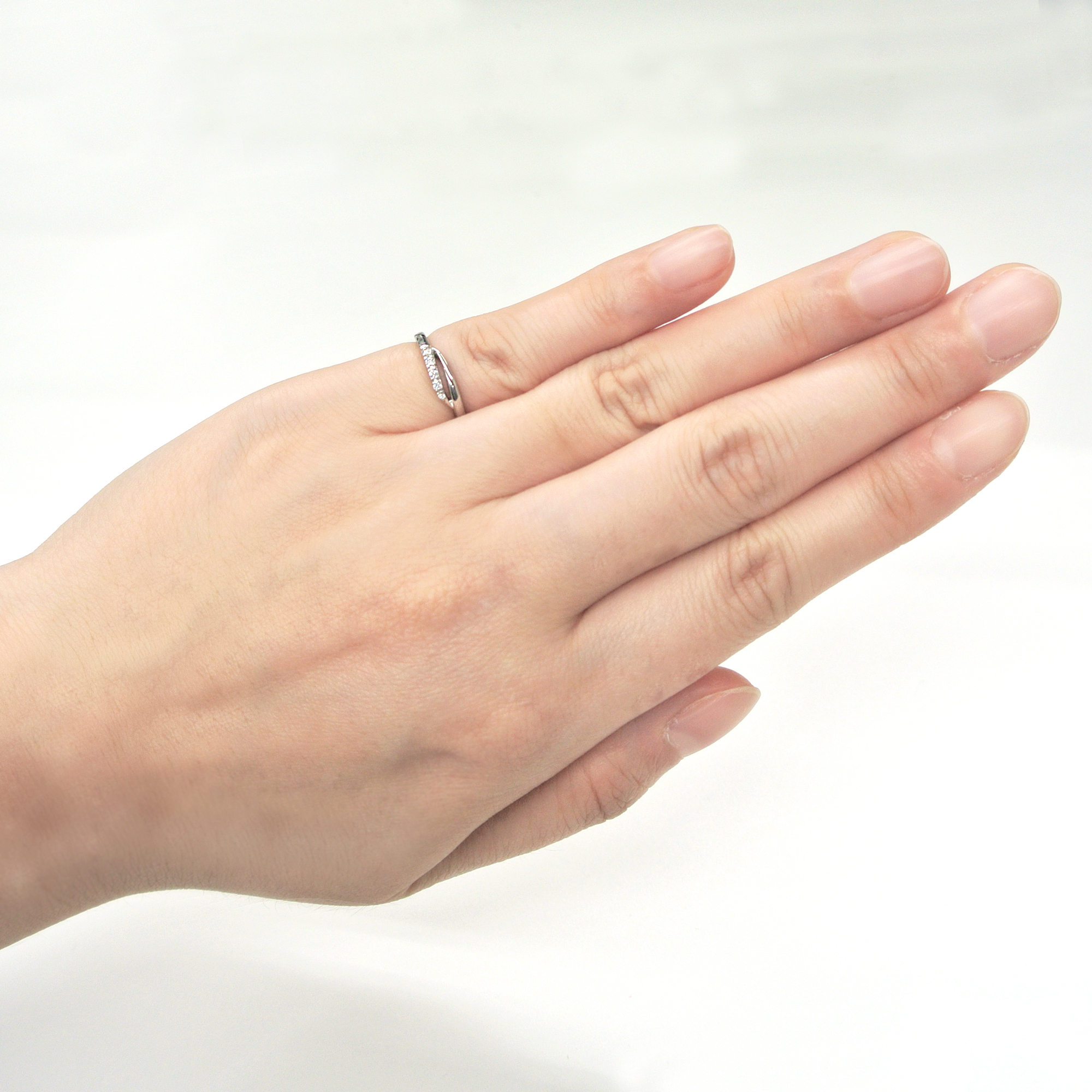 柔らかな曲線は指を美しく飾り、滑らかなプラチナの艶とダイヤモンドが光を放ちます。