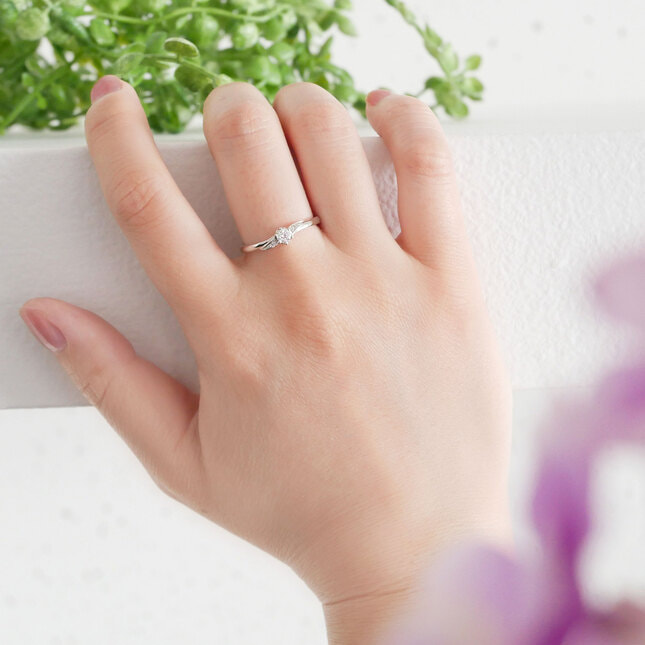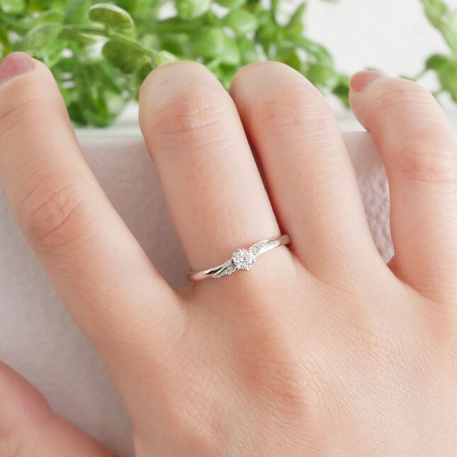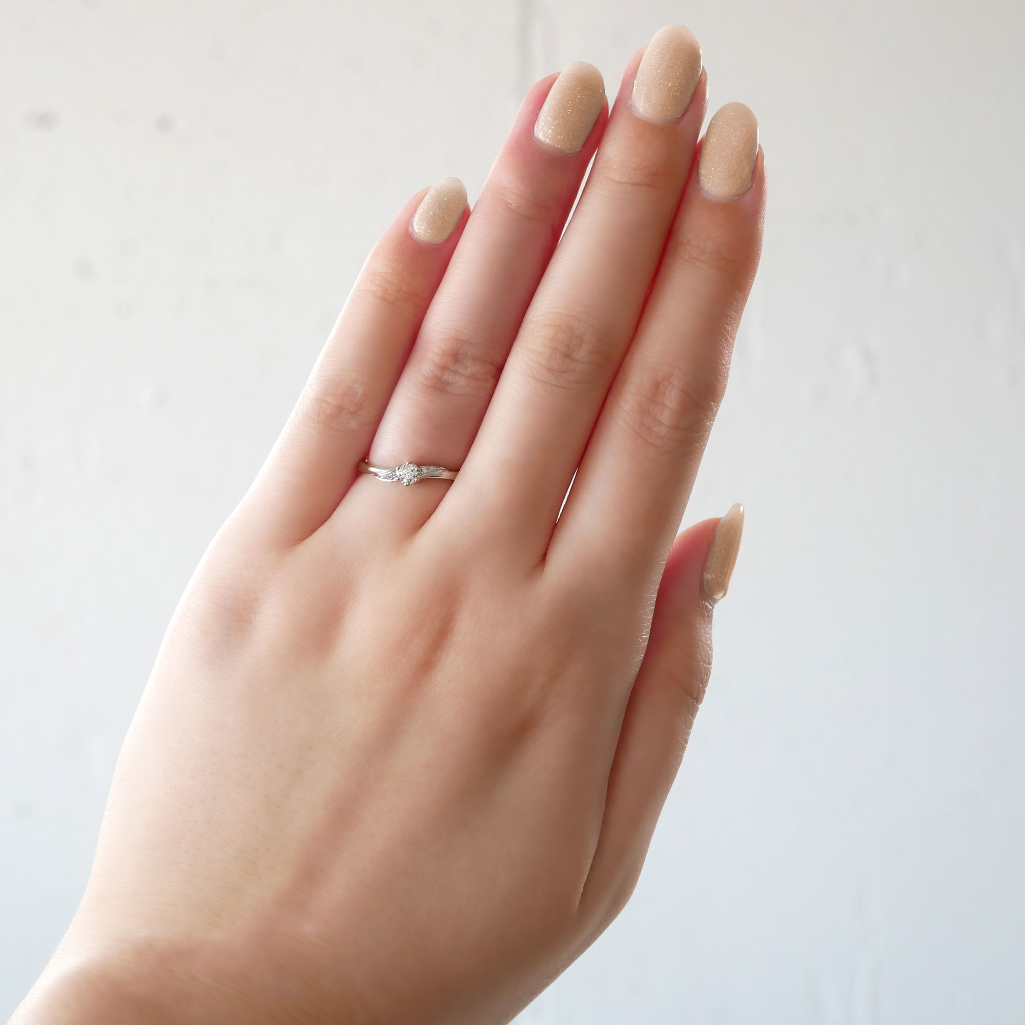 0.10ctのセンターストーンが動くたび瞬き、存在感を放ち、女性らしい手元に。