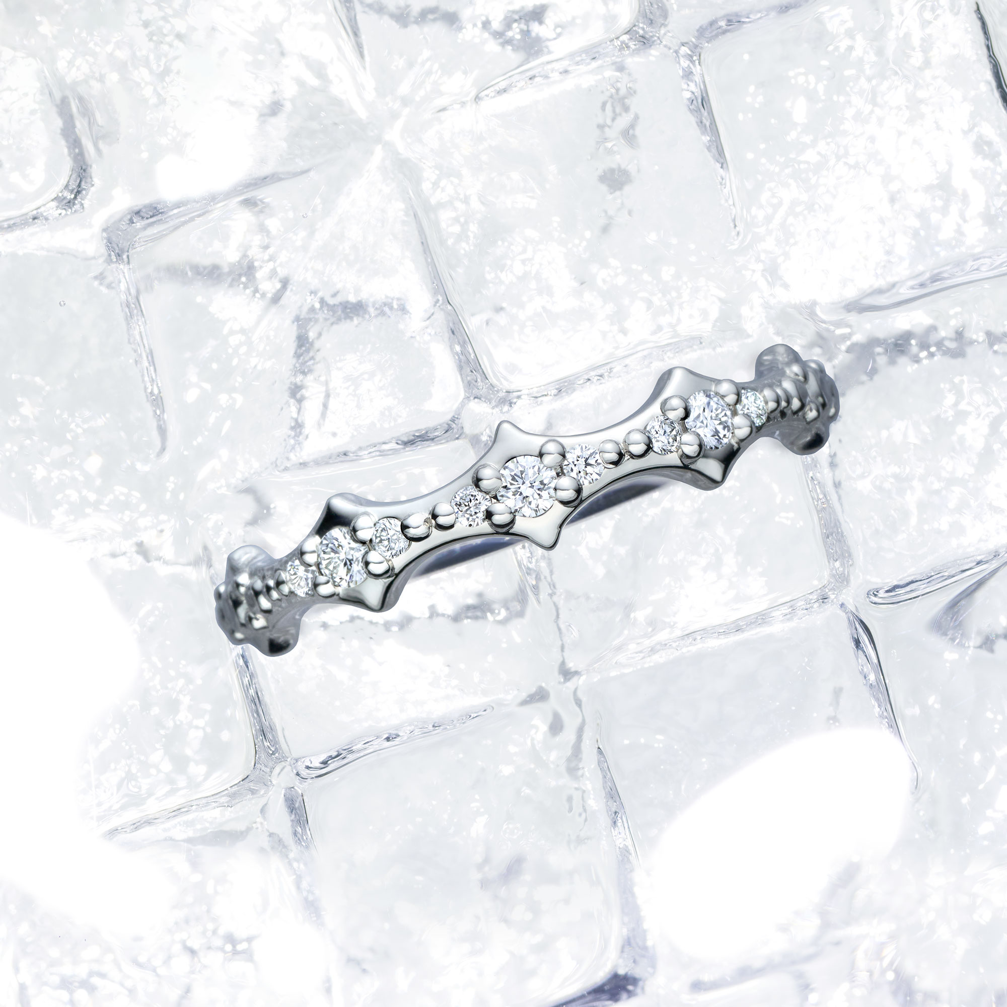 アウトラインに地金感を残すことで、ひんやりとしたプラチナの白く純粋な艶を感じます。