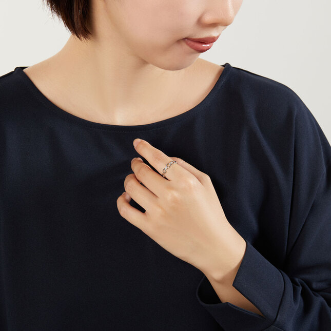 日常使いにちょうど良いサイズ感と透け感のある軽やかな着け心地で、1本で着けるのはもちろん、他のリングとの重ね着けも楽しめるデザインです。