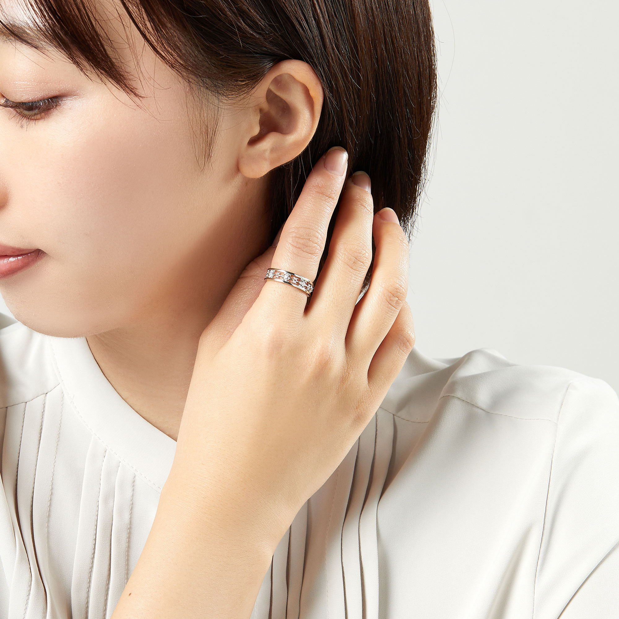 アール・ヌーヴォー建築からインスパイアされたデザインは、程よいボリューム感で、1本で着けるのはもちろん、他のリングとの重ね着けもお楽しみいただけます。