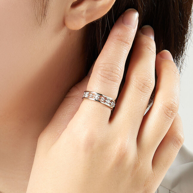 繊細な透かし模様ときらめくダイヤモンドが、印象的な手元を演出するリング。