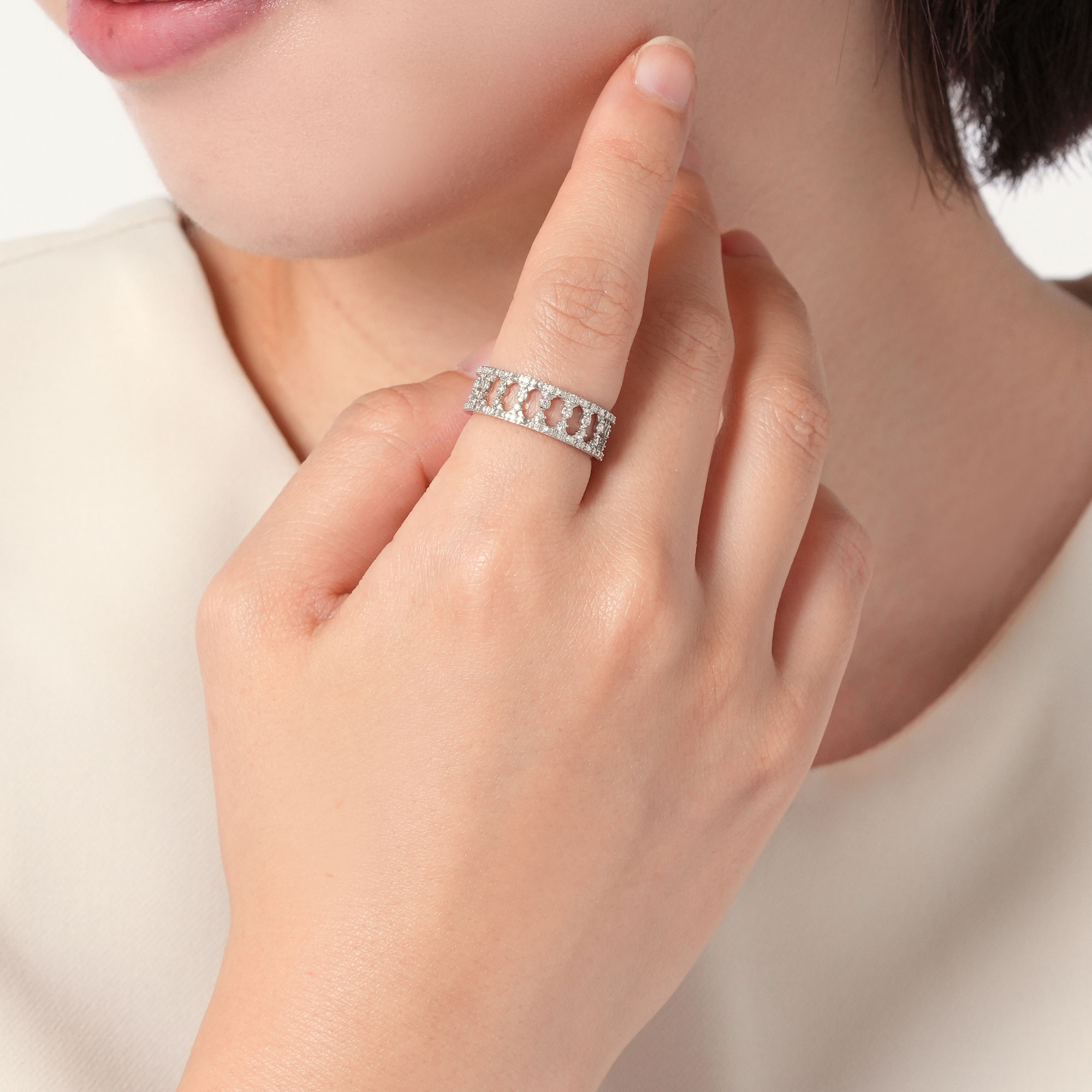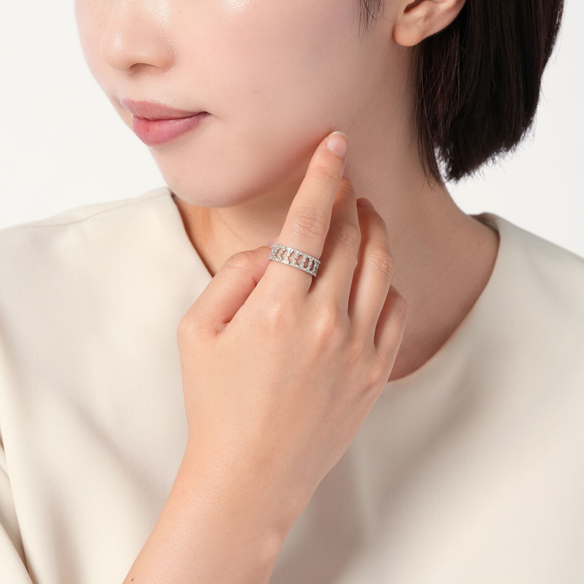 モダンなデザインとダイヤモンドの繊細なきらめきが手元を美しく見せてくれるリング。