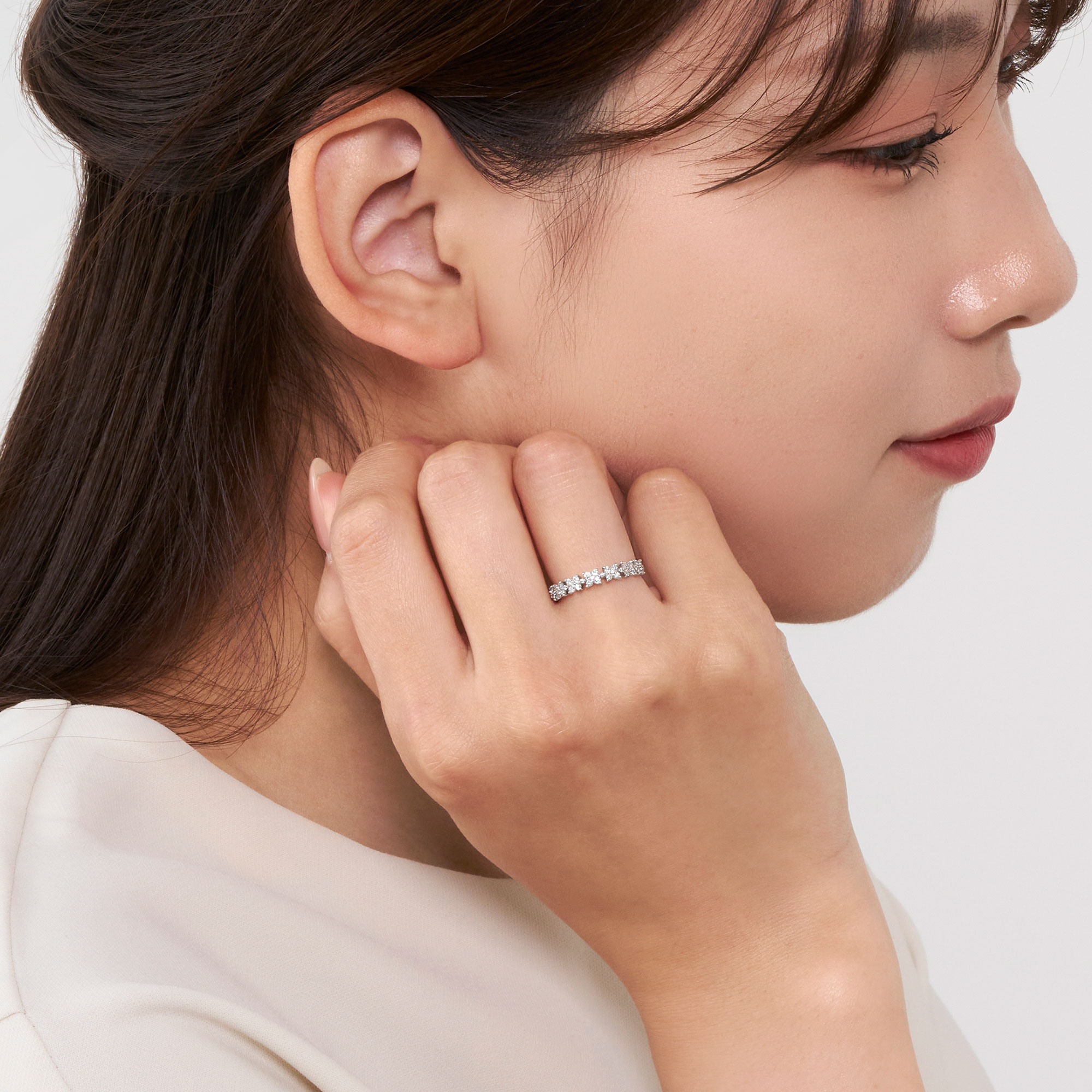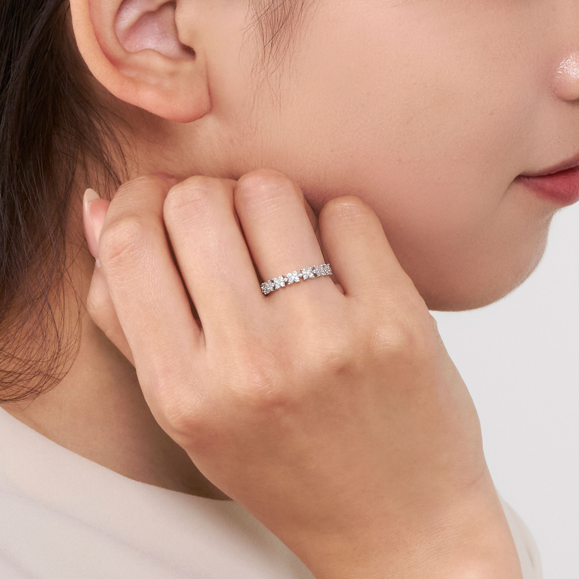 ダイヤモンドの粒感を活かして、瑞々しくつややかな花びらを連ねたエタニティタイプのデザイン。