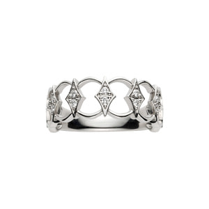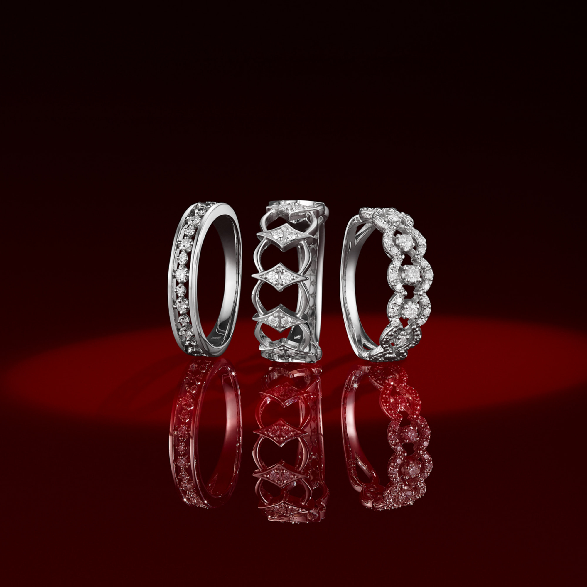 光のイメージを形にしたプラチナとダイヤモンドが一列に並ぶ、グラフィカルでモダンなリング。