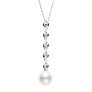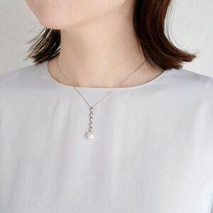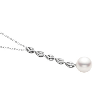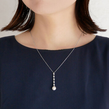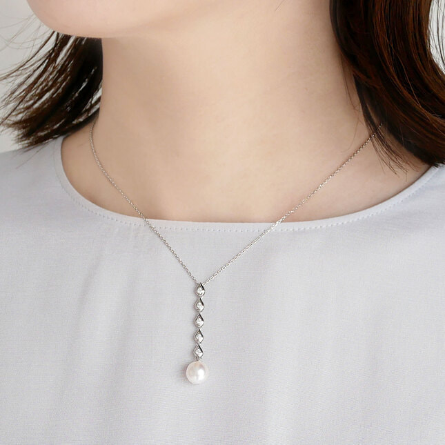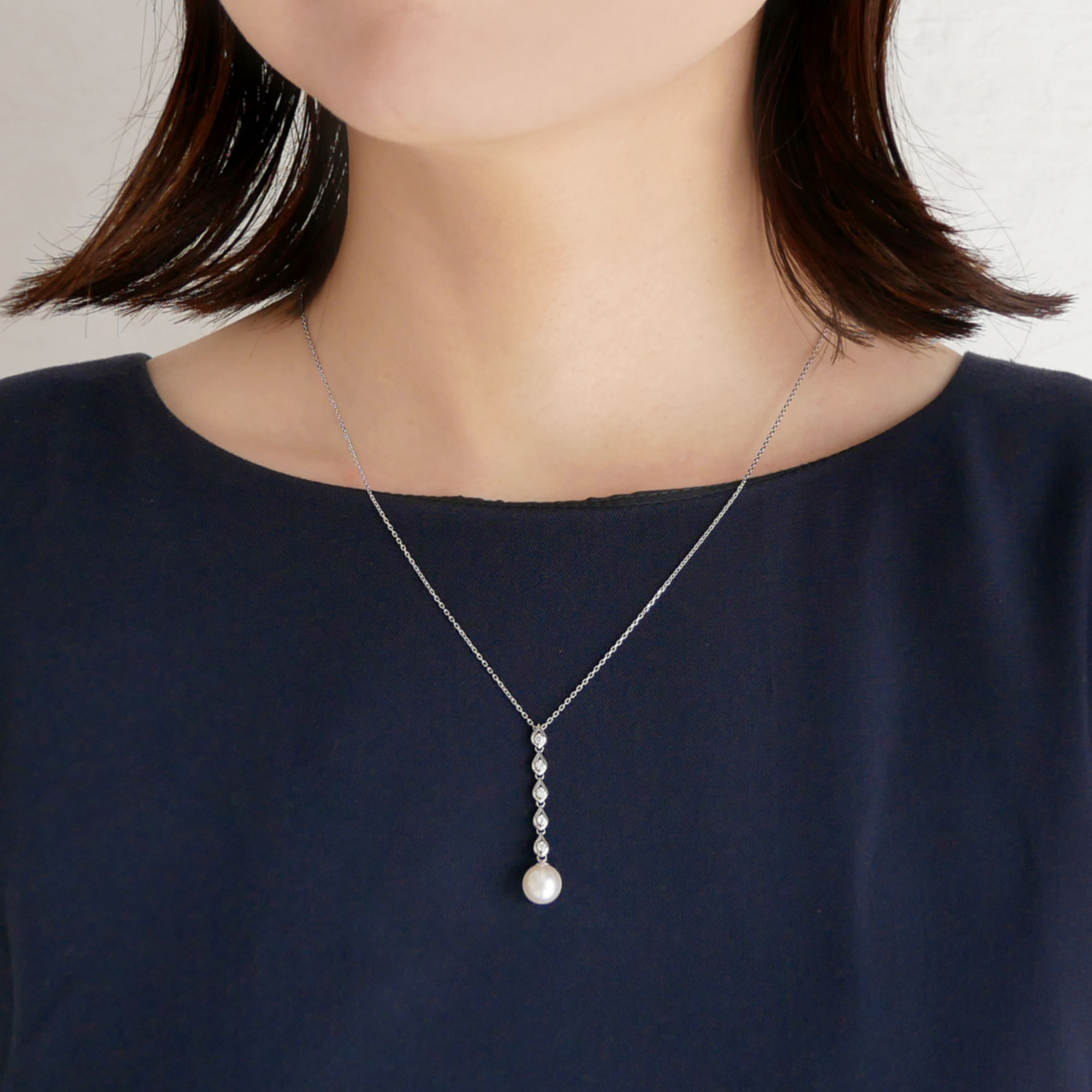 艶やかな光沢のアコヤパールに、5石のダイヤモンドをあしらったネックレス。