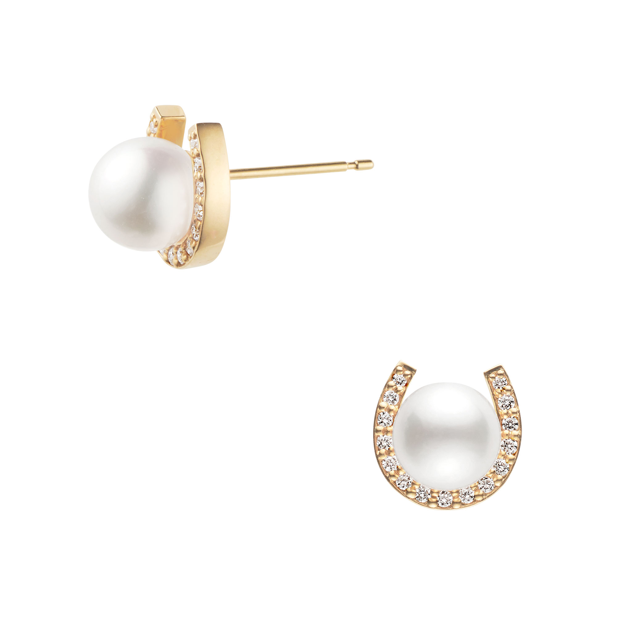 『呼び込んだ幸せを逃さない』と言われるホースシュー(馬蹄)モチーフに、そっと艶やかなアコヤパールが抱えられているかのような、幸福感あふれるピアス。