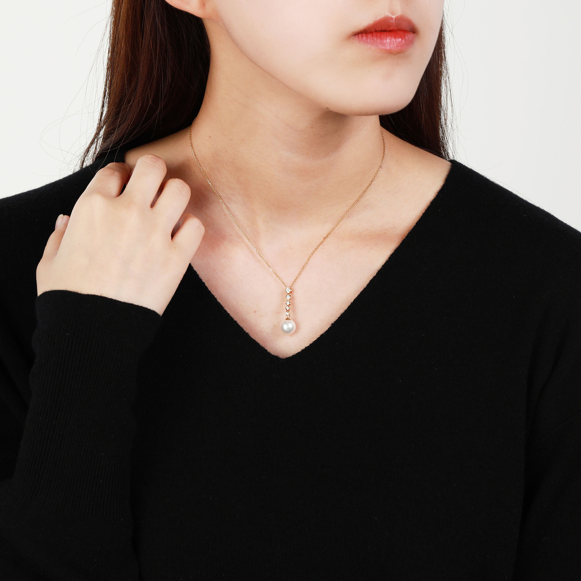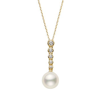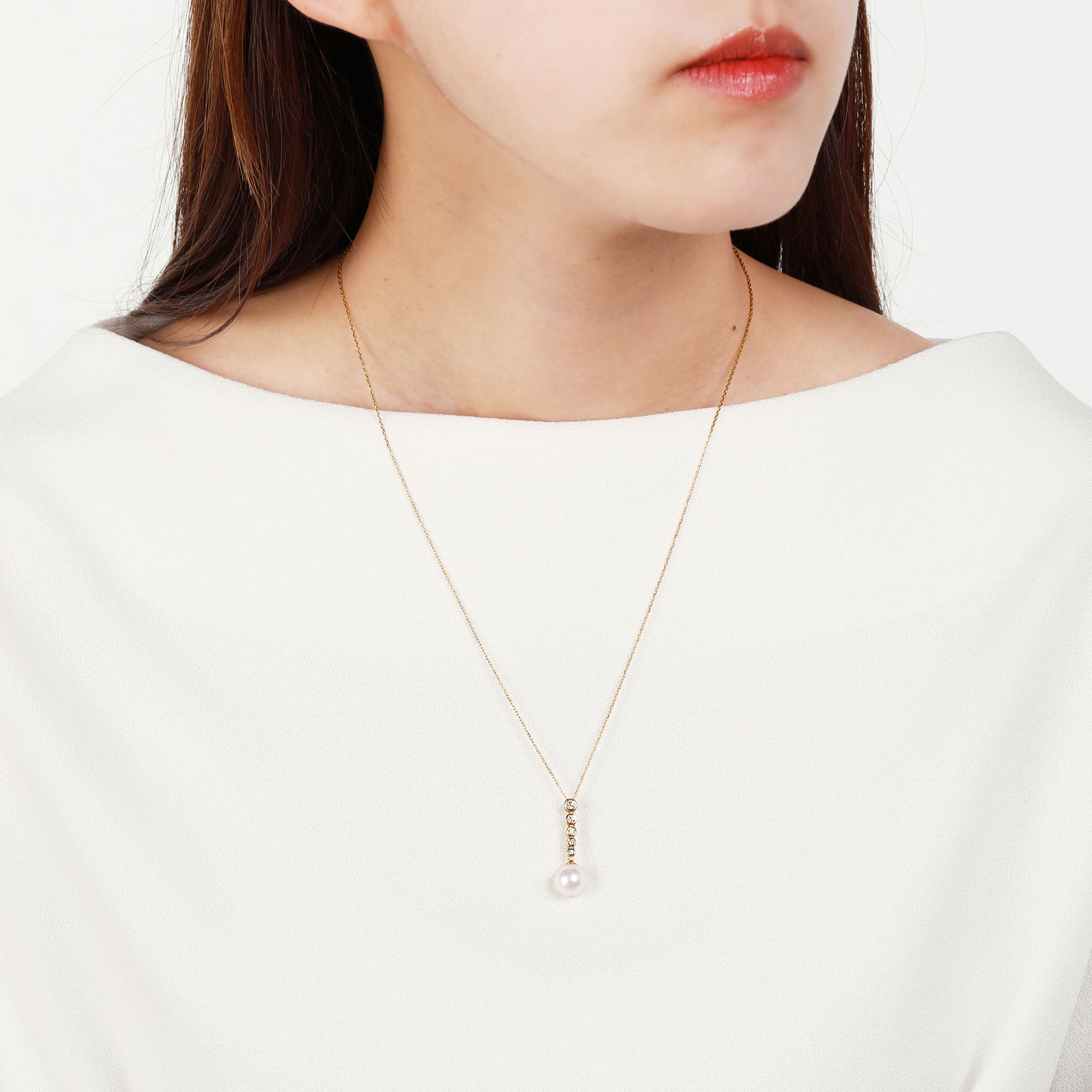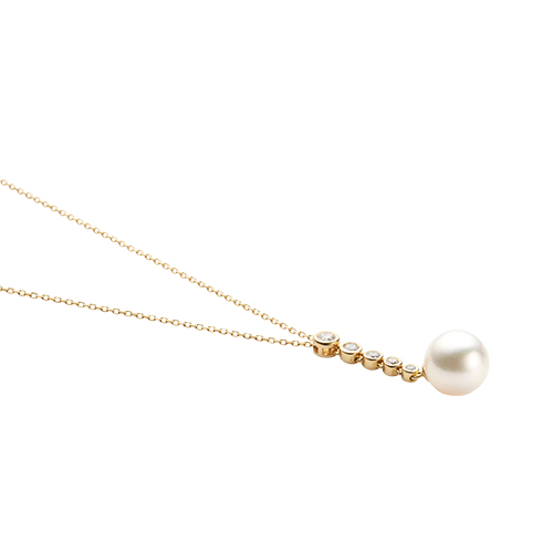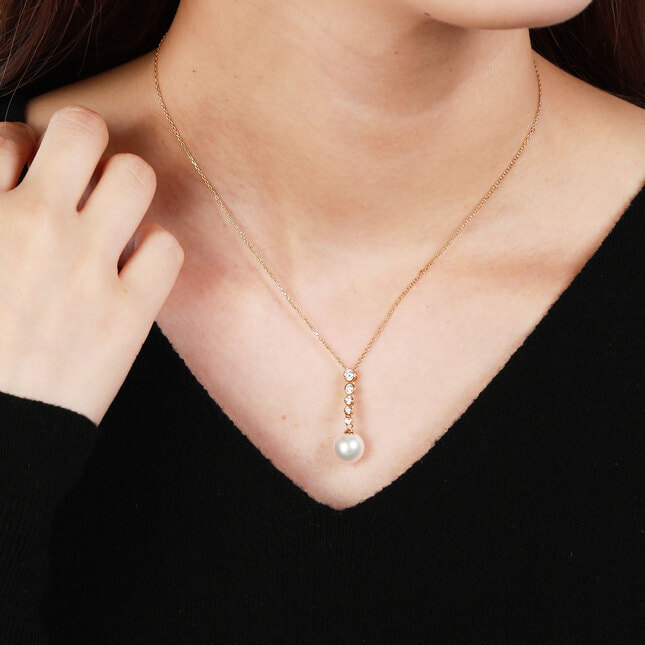 イエローゴールドのツヤ感と大粒パールのまろやかな輝きとのハーモニーが、胸元をエレガントに演出します。