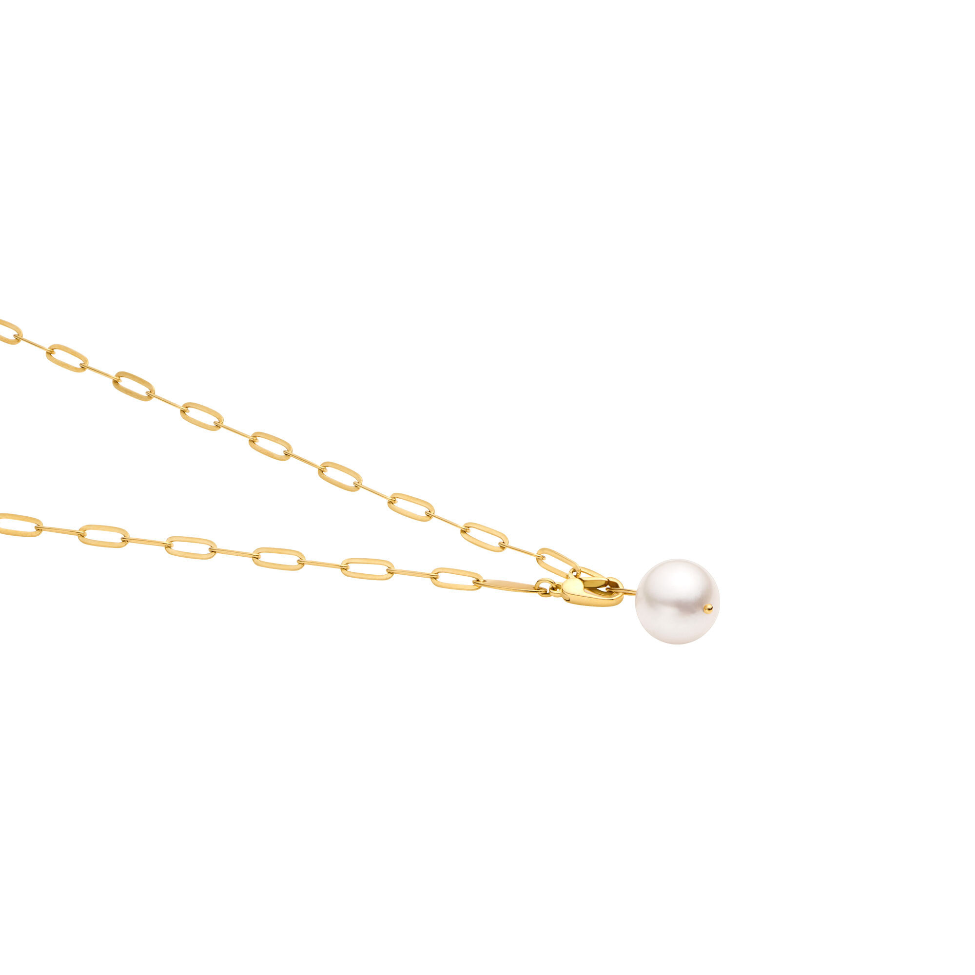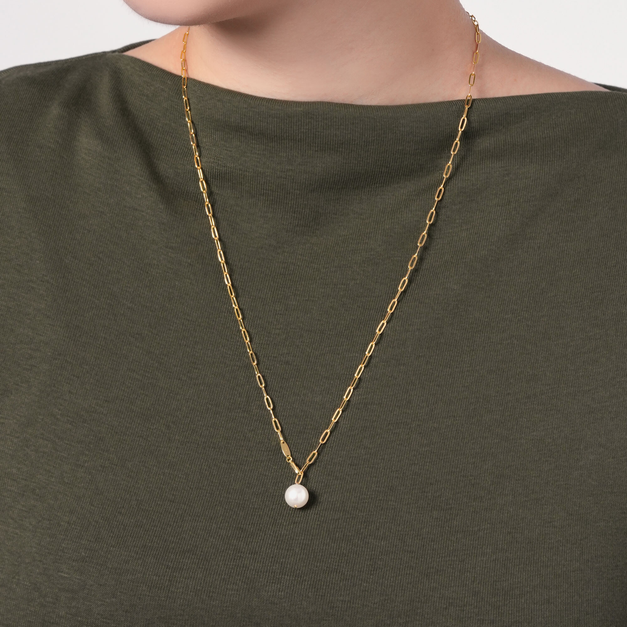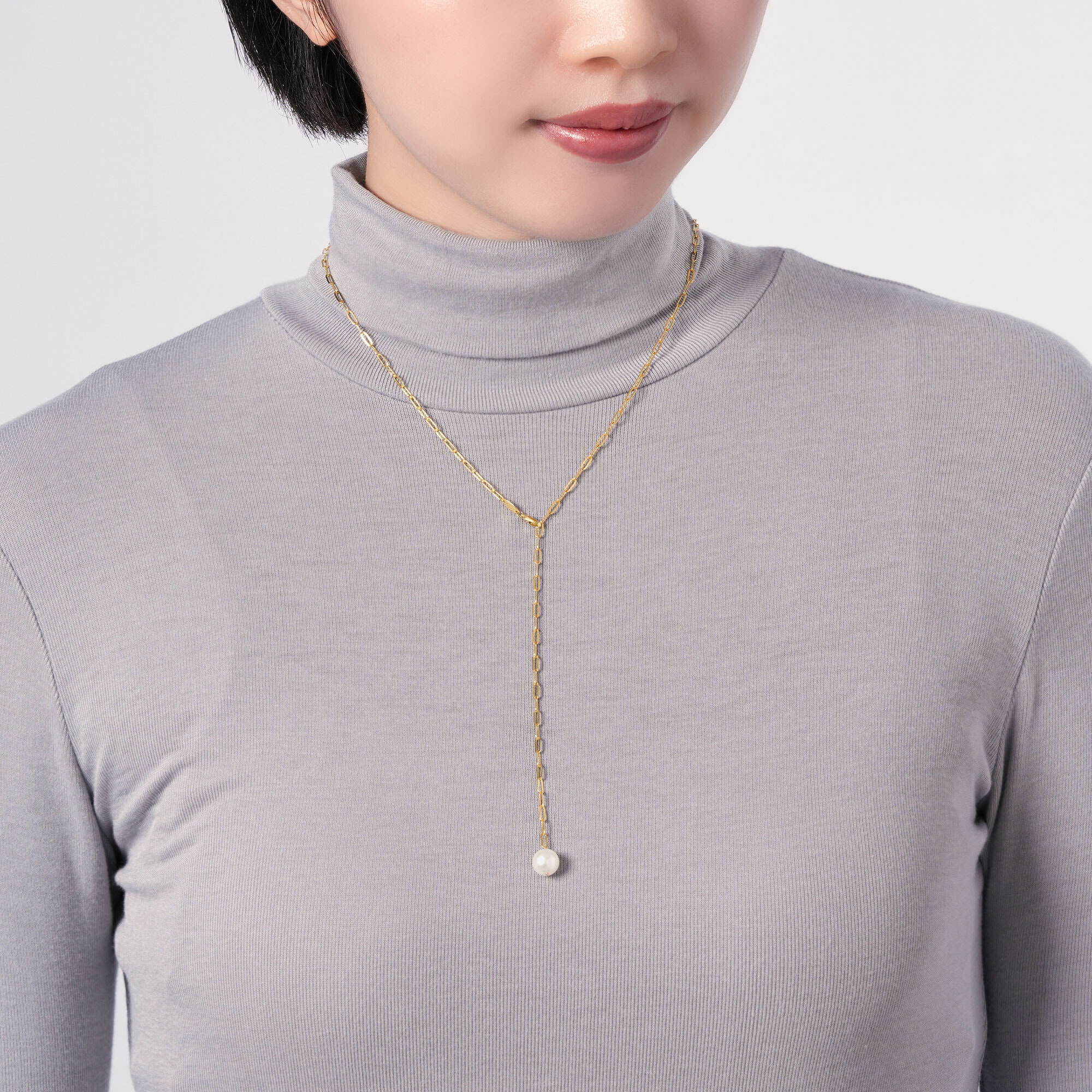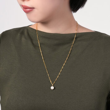 リラックスしたムードのチェーンにアコヤパールの光沢で柔らかな雰囲気をプラス。