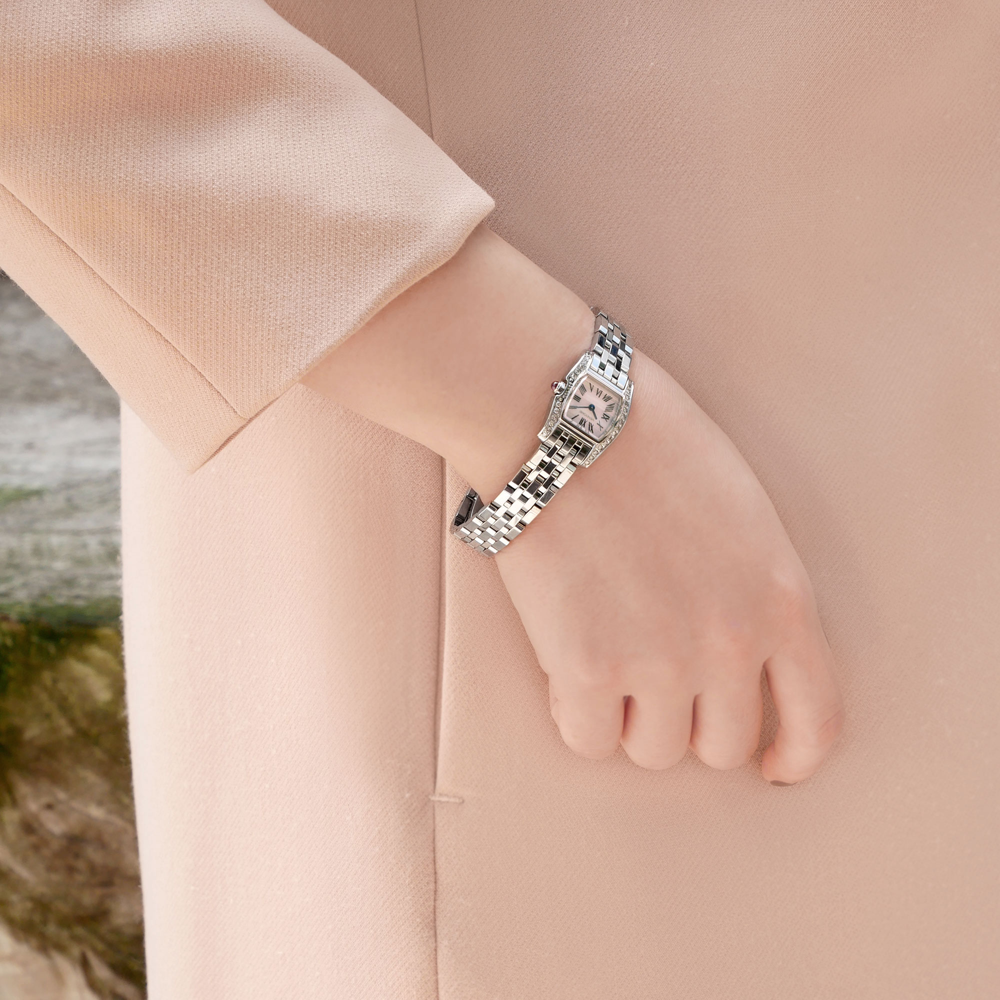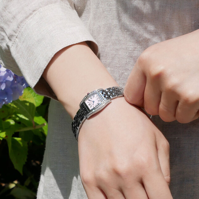 カーブを持たせたフェイスが優しい印象の、シーンを選ばずコーディネートしやすい上品な腕時計。